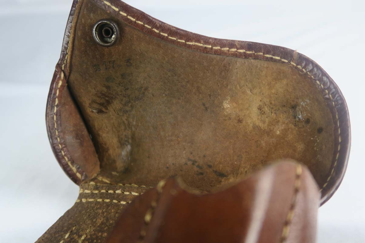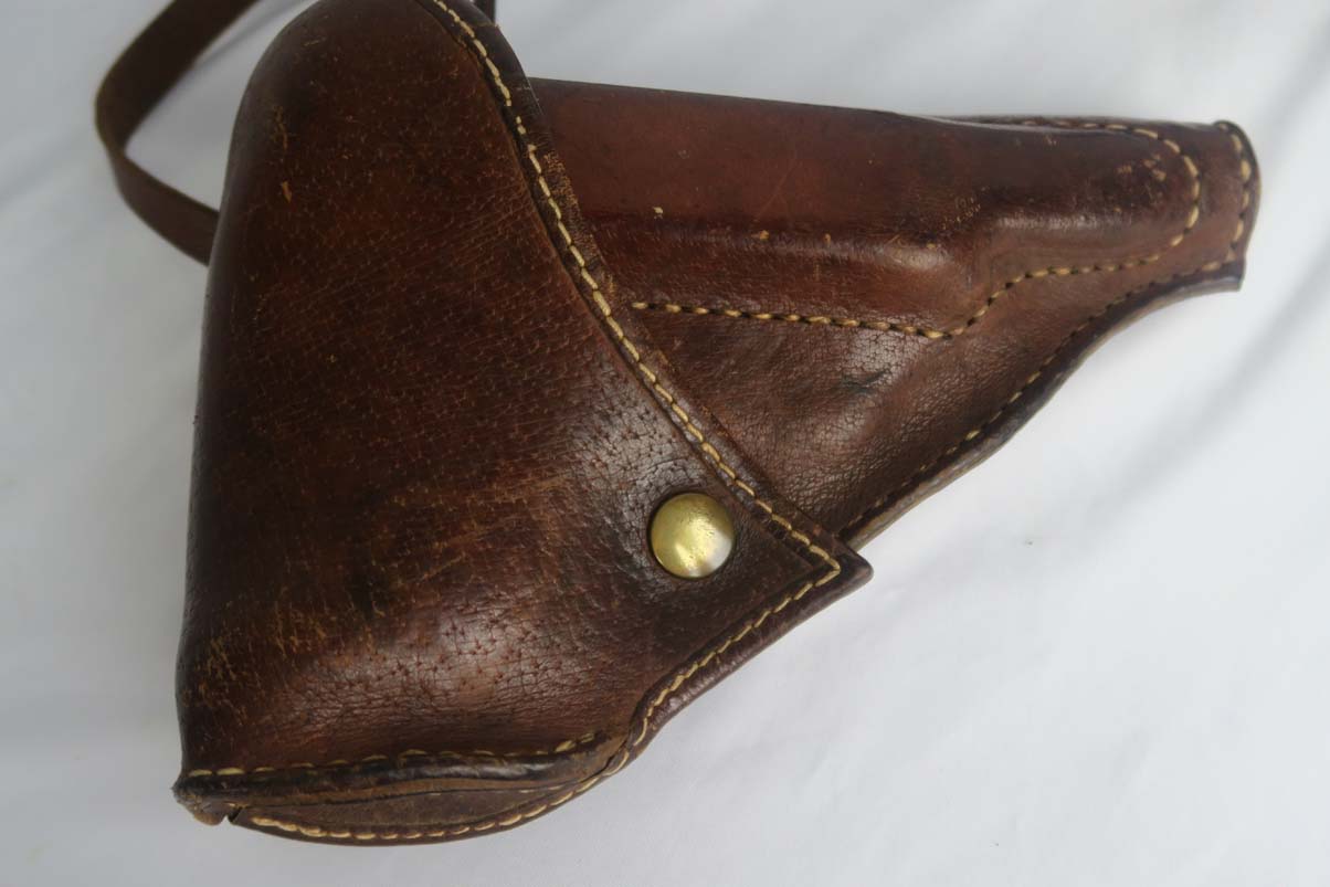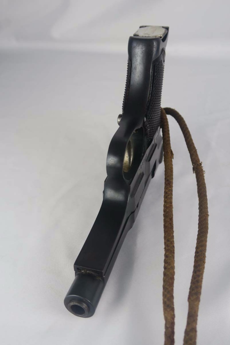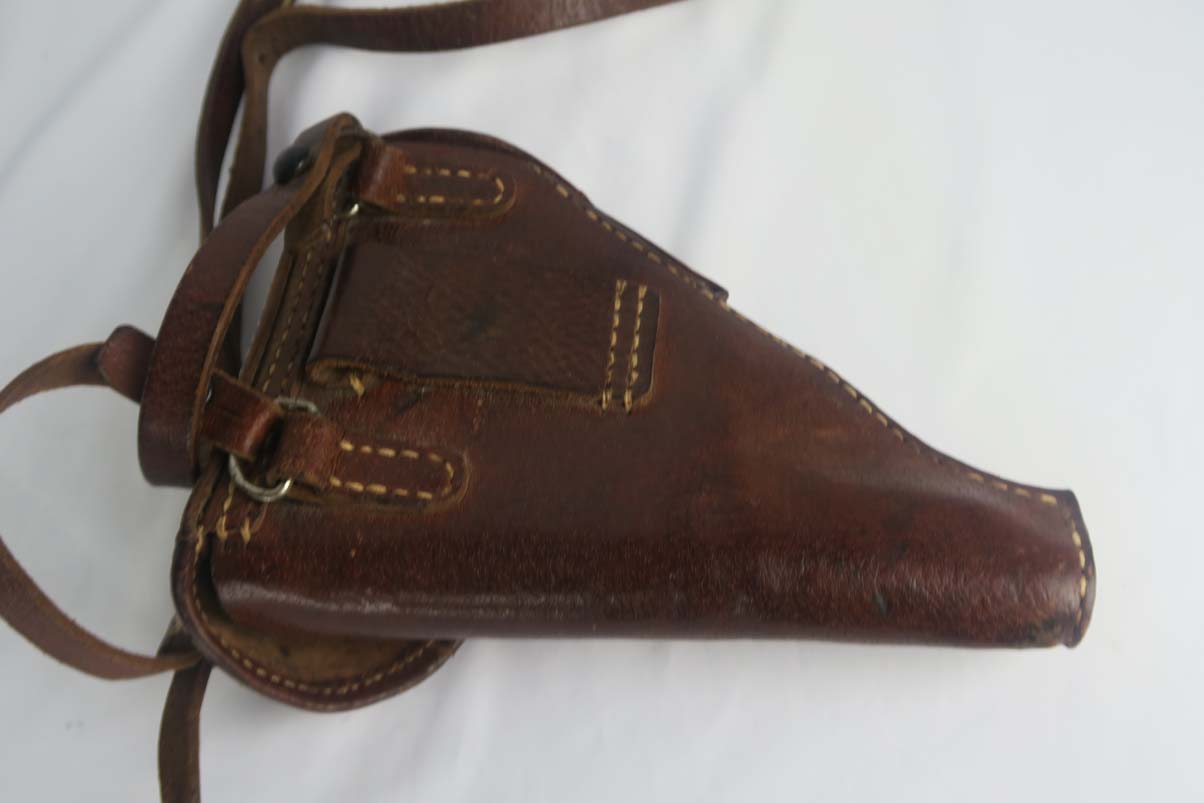 7/6/17 – This is a gorgeous Type 94 Nambu rig, with rare shoulder holster and lanyard, and one matching magazine.  The finish on the pistol rates at about 98-99% with minor patina in some places but very little finish loss.  One magazine is original and matching, and the other is a nice early example.  The rare lanyard and shoulder holster have sold independently for us at over $400 apiece in the past.  Also included is the original cleaning rod.  Mint bore.