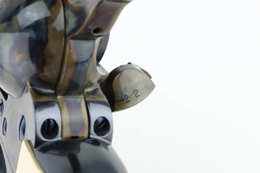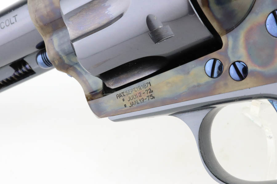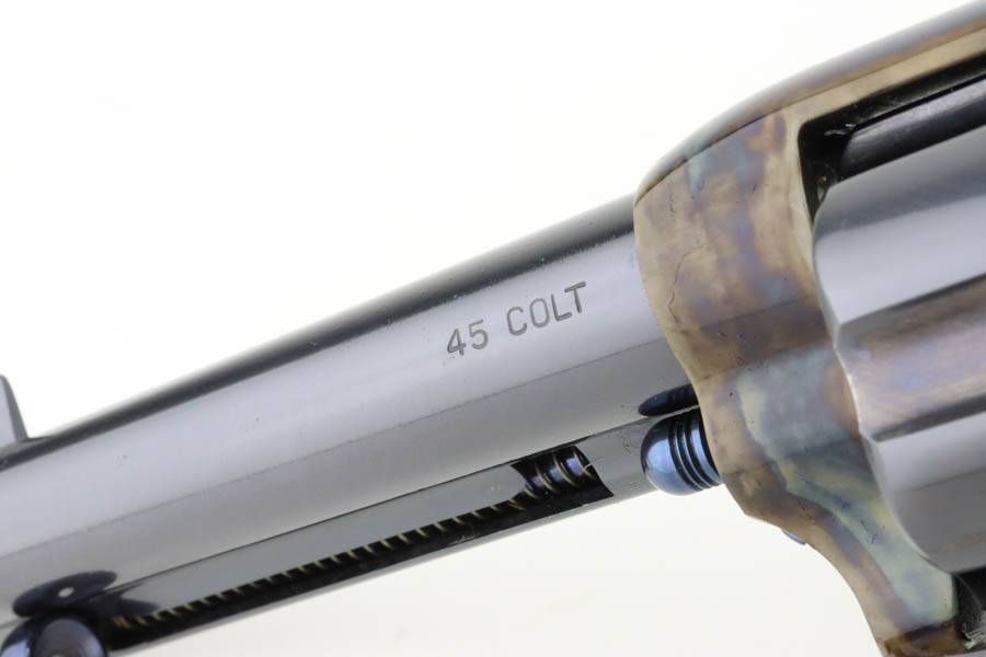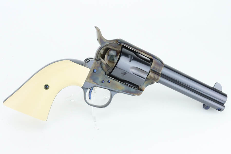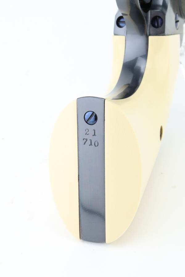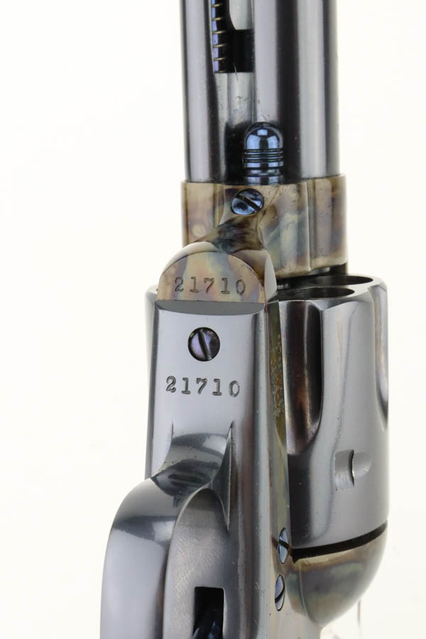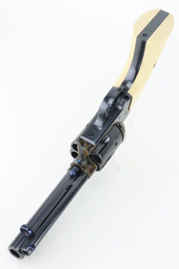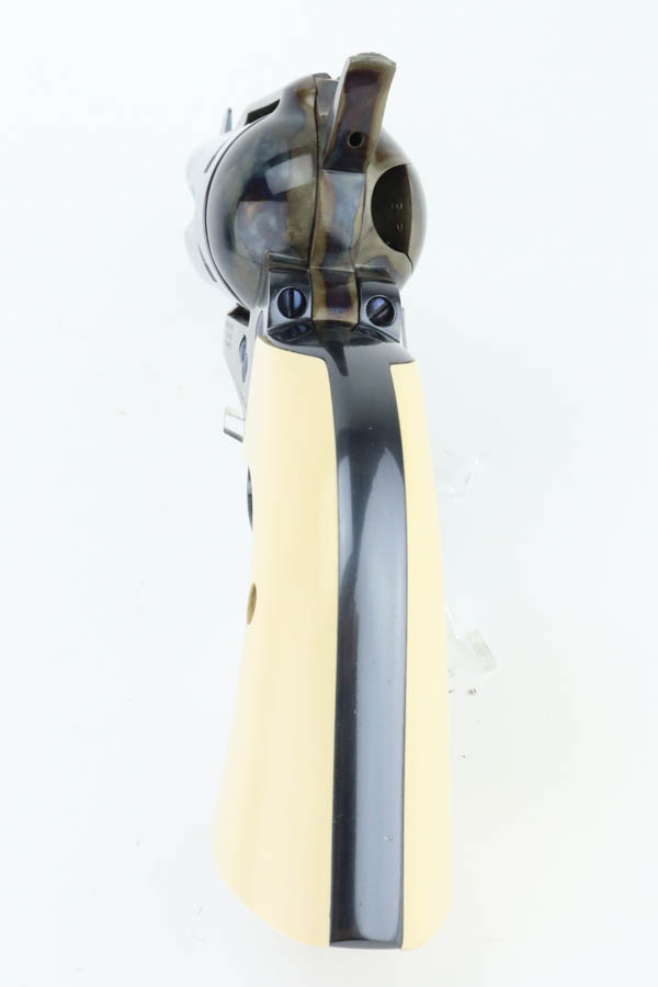 6/20/24 – This is a mint example of a modern remake of the original Colt Single Action Army Revolver. Manufactured by USFA and chambered in .45 Colt. 4 7/8″ barrel. The gun is like-new with no signs of wear or use. Beautiful case-hardening on the frame and fire-bluing on the small parts. Fitted with really nice ivory-colored plastic grips. Like-new bore. Smooth action.