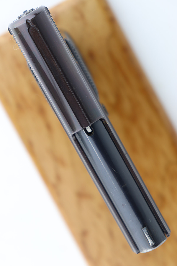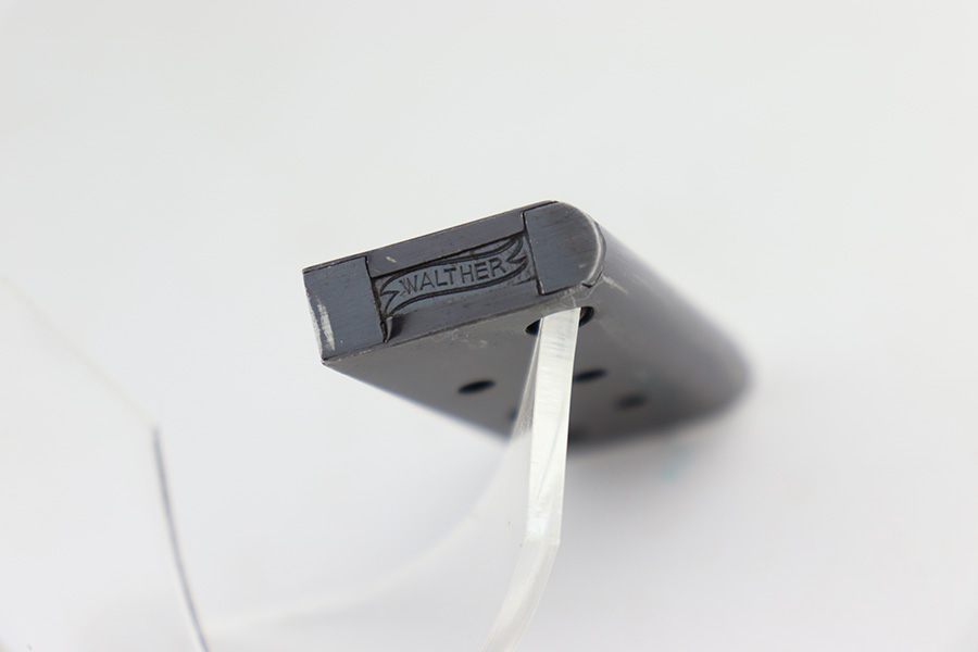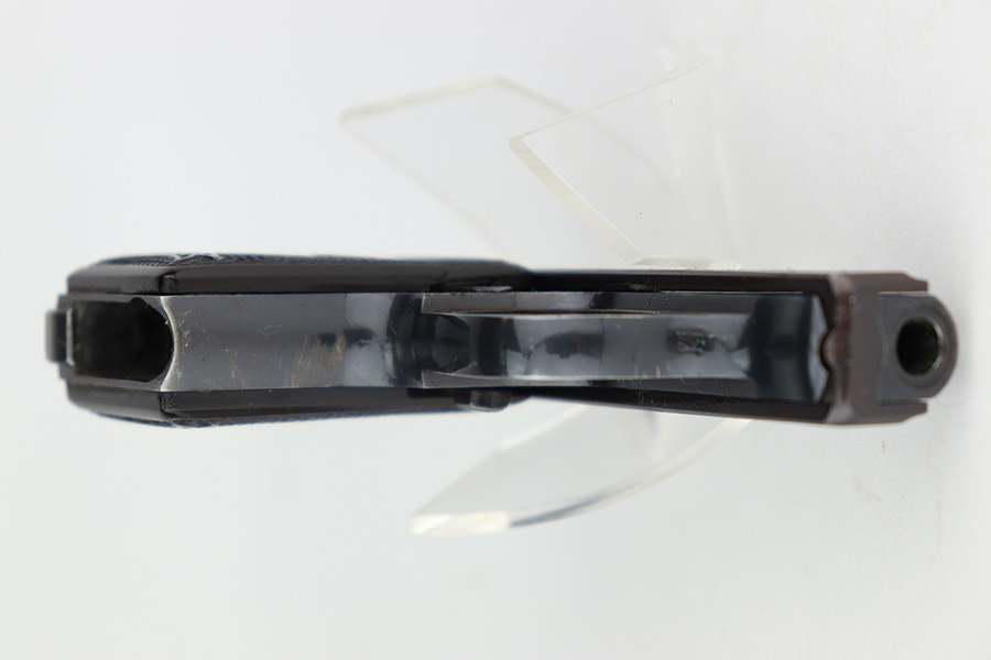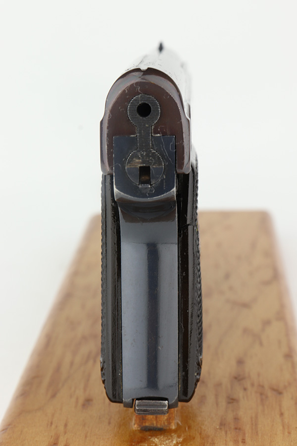 11/30/22 – This is a beautiful example of a Walther Model 9 sold in the commercial market in the early 1930’s. It is all matching and has the proper “Crown N” proofs. This one is special because it has a really nice gold-inlayed ornate filigree pattern around the Walther logos on both sides of the slide. The bluing on the slide also has a slight plum color to it. The gun has retained about 98% of its original high polish finish with very minor muzzle wear and some light scratchy wear on the front strap. Comes with nice period-correct black bakelite grips – hairline crack on the right side. Also comes with a proper “Walther” banner magazine. Mint bore.
