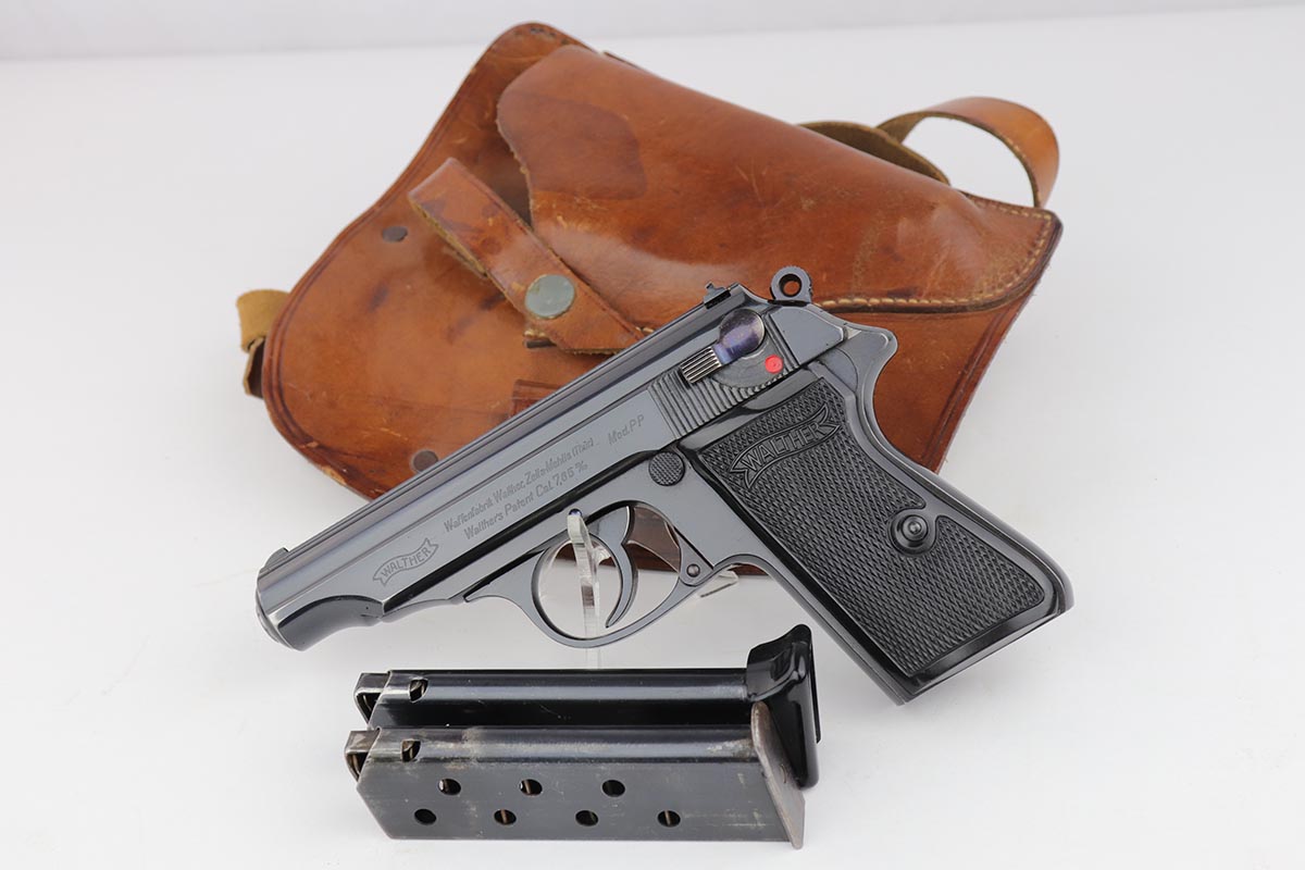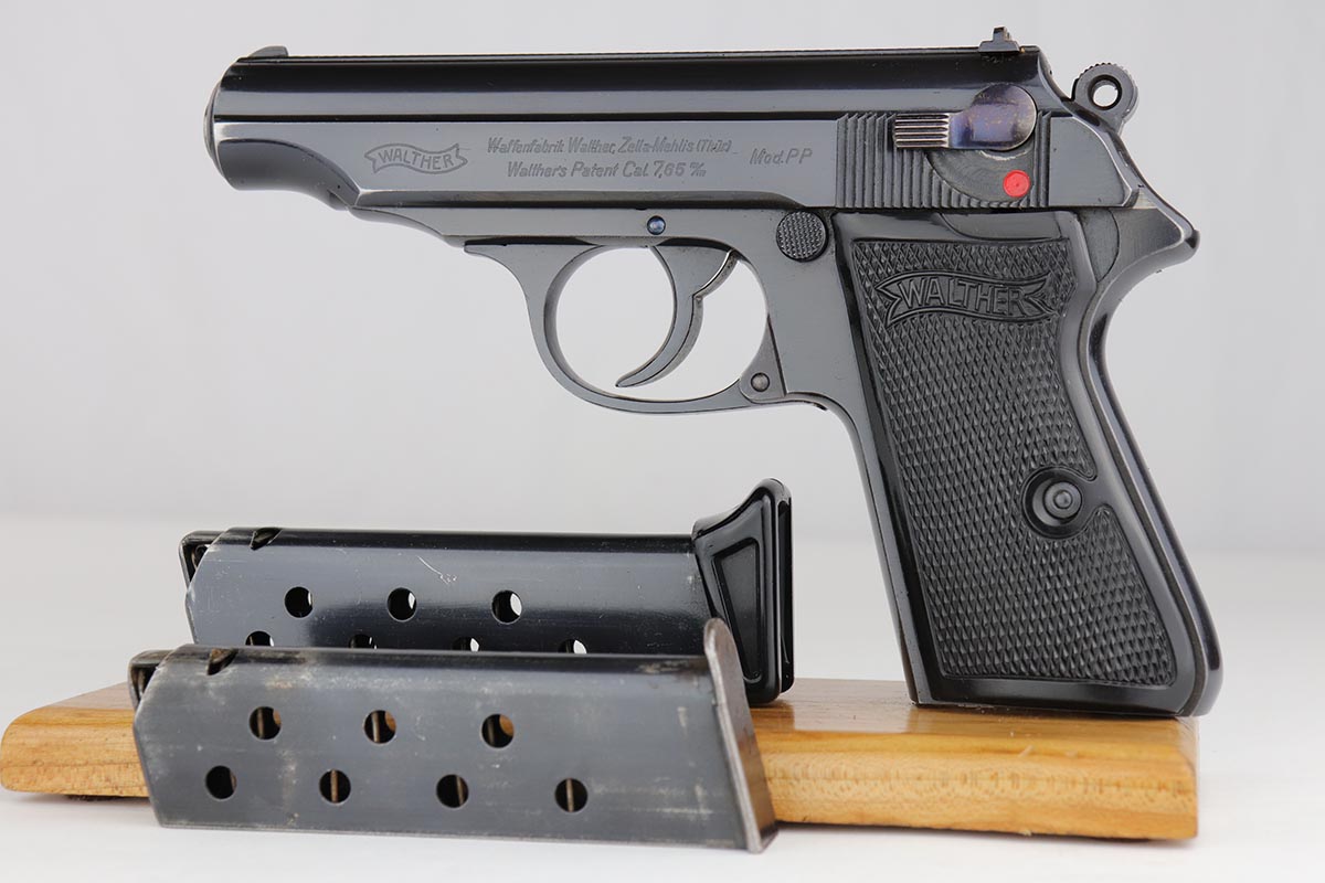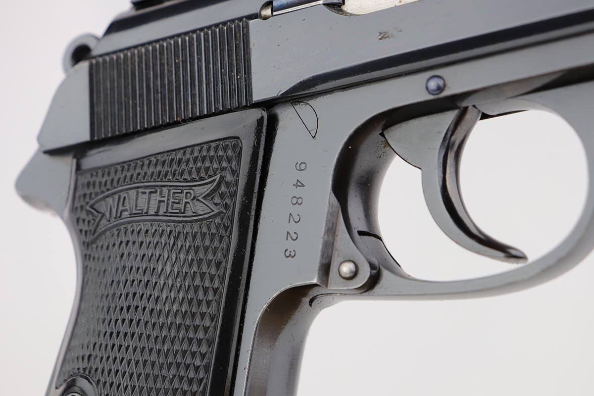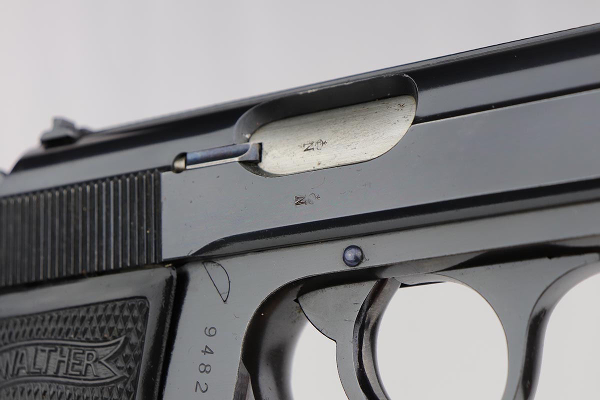 7/16/19 – This is a near-mint Walther PP rig, manufactured in about 1936 with Crown/N proofs and early 90 degree safety. The RJ on the front strap is the distinct characteristic and the marking is under the original bluing. The original finish is about 98%, with some edge/muzzle wear on the slide, and some finish loss on the bottom of the back strap. Minty bore. Rig includes one finger extension magazine, and one flat-bottom example.