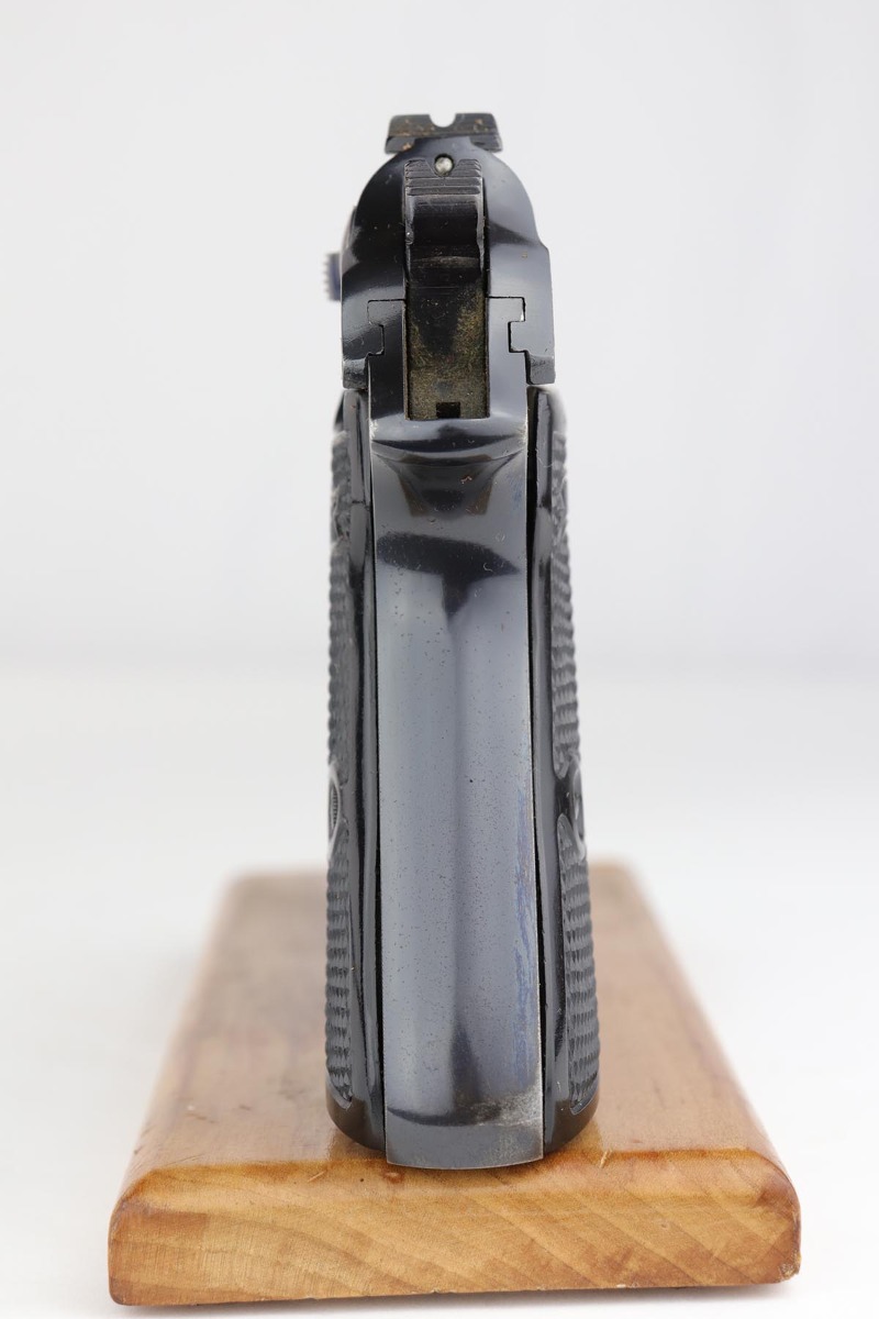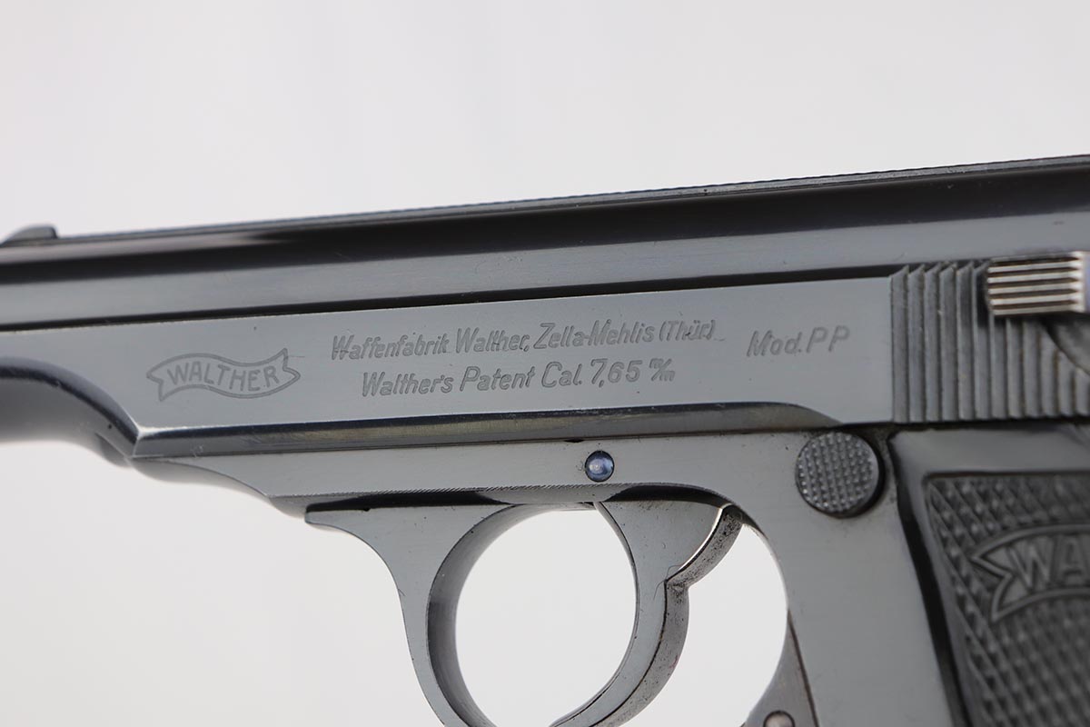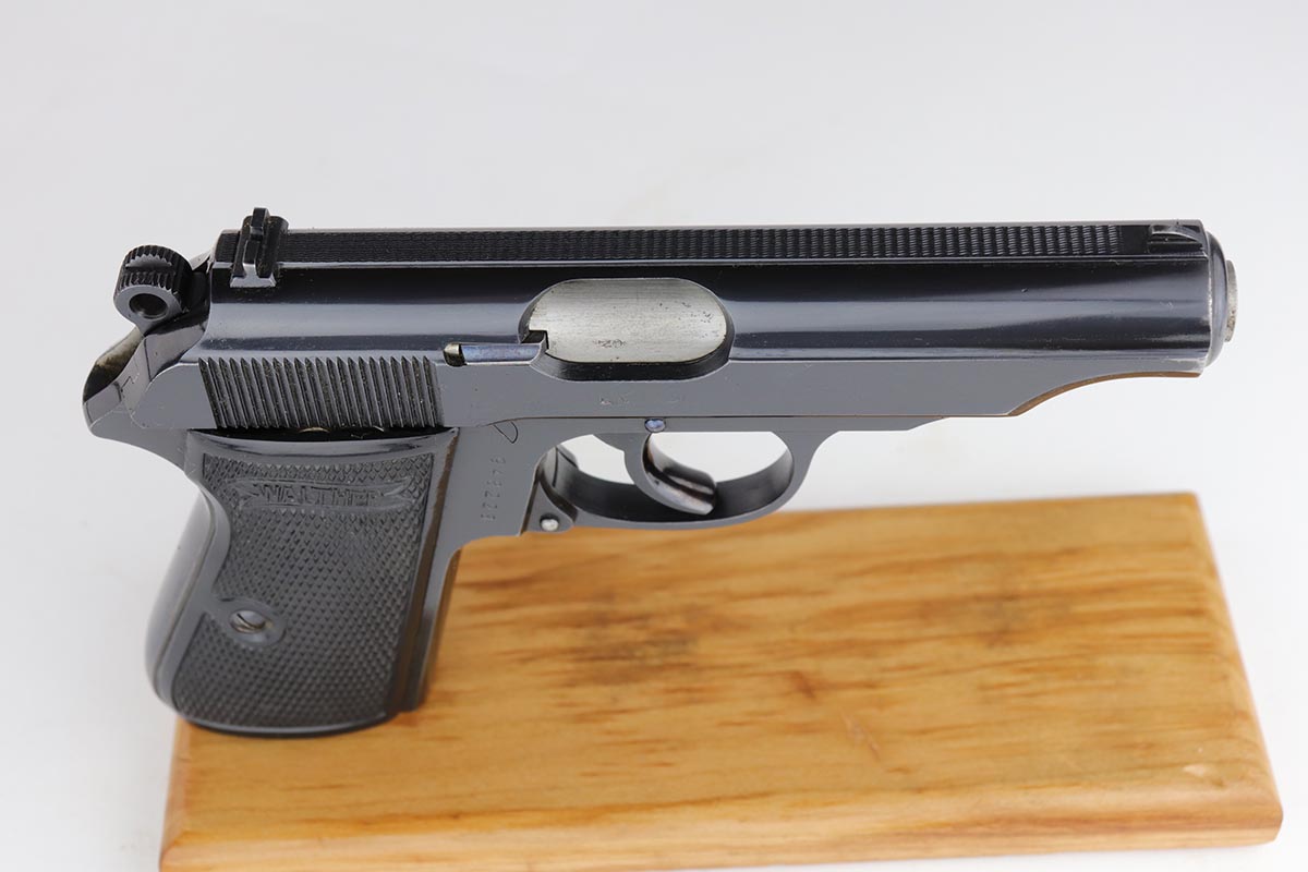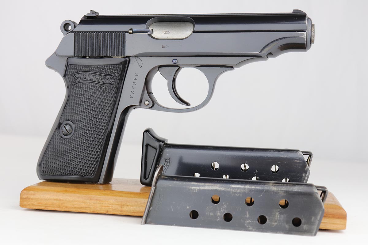 7/16/19 – This is a near-mint Walther PP rig, manufactured in about 1936 with Crown/N proofs and early 90 degree safety. The RJ on the front strap is the distinct characteristic and the marking is under the original bluing. The original finish is about 98%, with some edge/muzzle wear on the slide, and some finish loss on the bottom of the back strap. Minty bore. Rig includes one finger extension magazine, and one flat-bottom example.