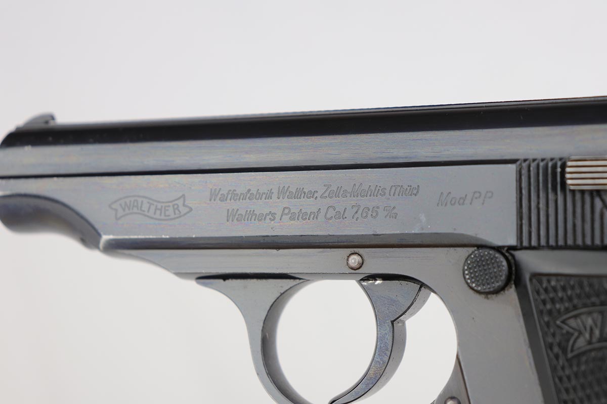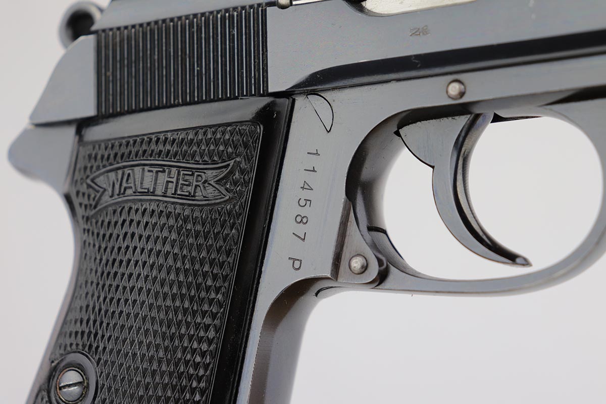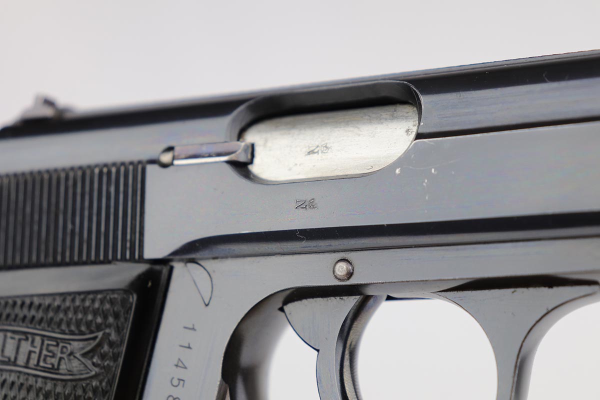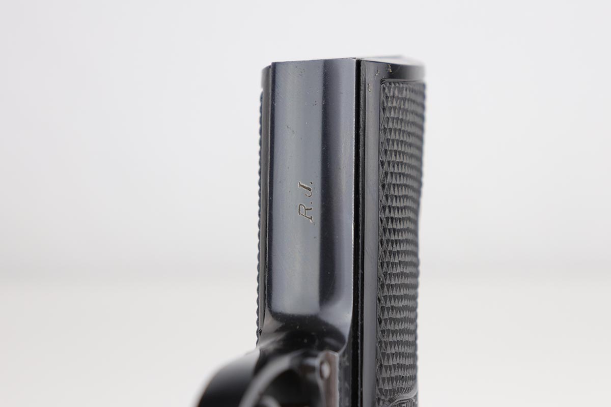 12/4/19 – This is a near-mint Walther PP, manufactured in about 1939 with Crown/N proofs. The RJ on the front strap is the distinct characteristic and the marking is under the original bluing. The original finish is about 98%, with some edge/muzzle wear on the slide, and some finish loss on the bottom of the back strap. Minty bore. RJ PP’s were issued to the “Reichs Bureau of Justice”, or in other words, the courts, judges, guards, etc. Probably rarely used other than annual “qualifying trials”.
