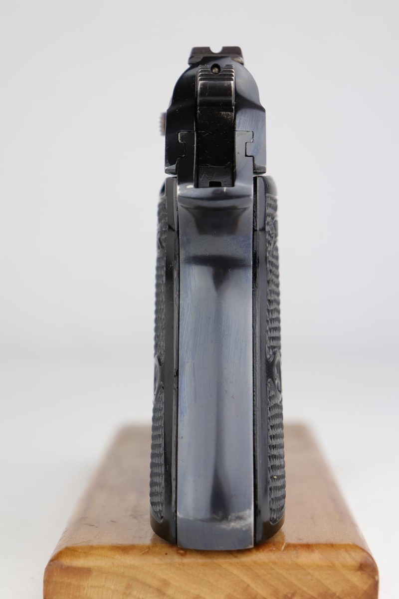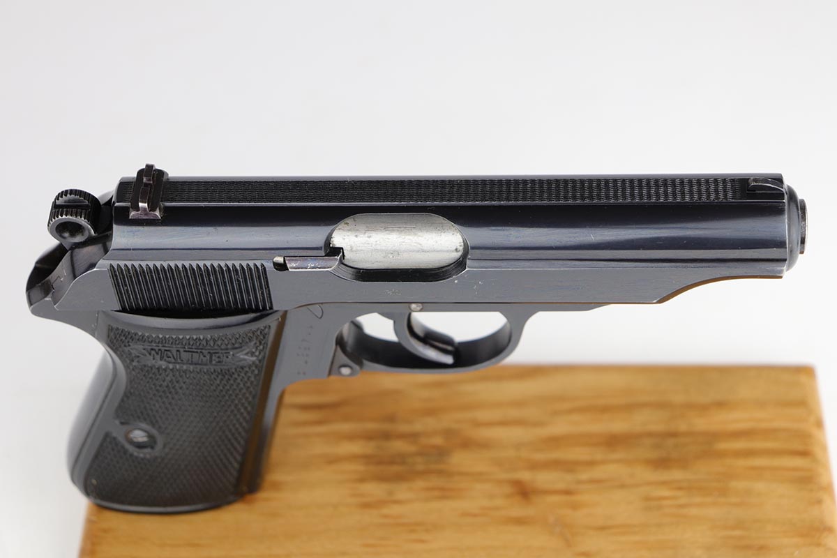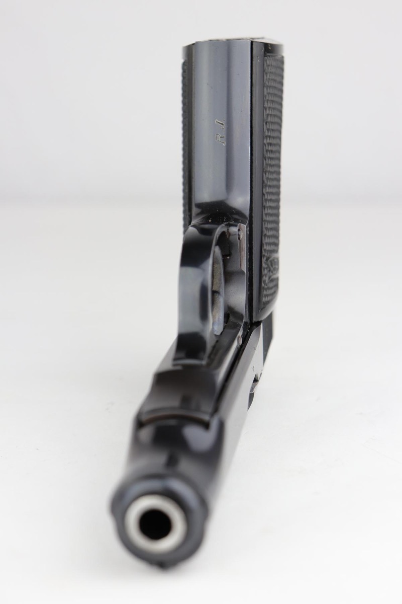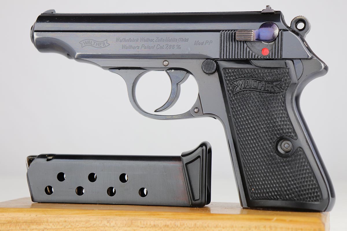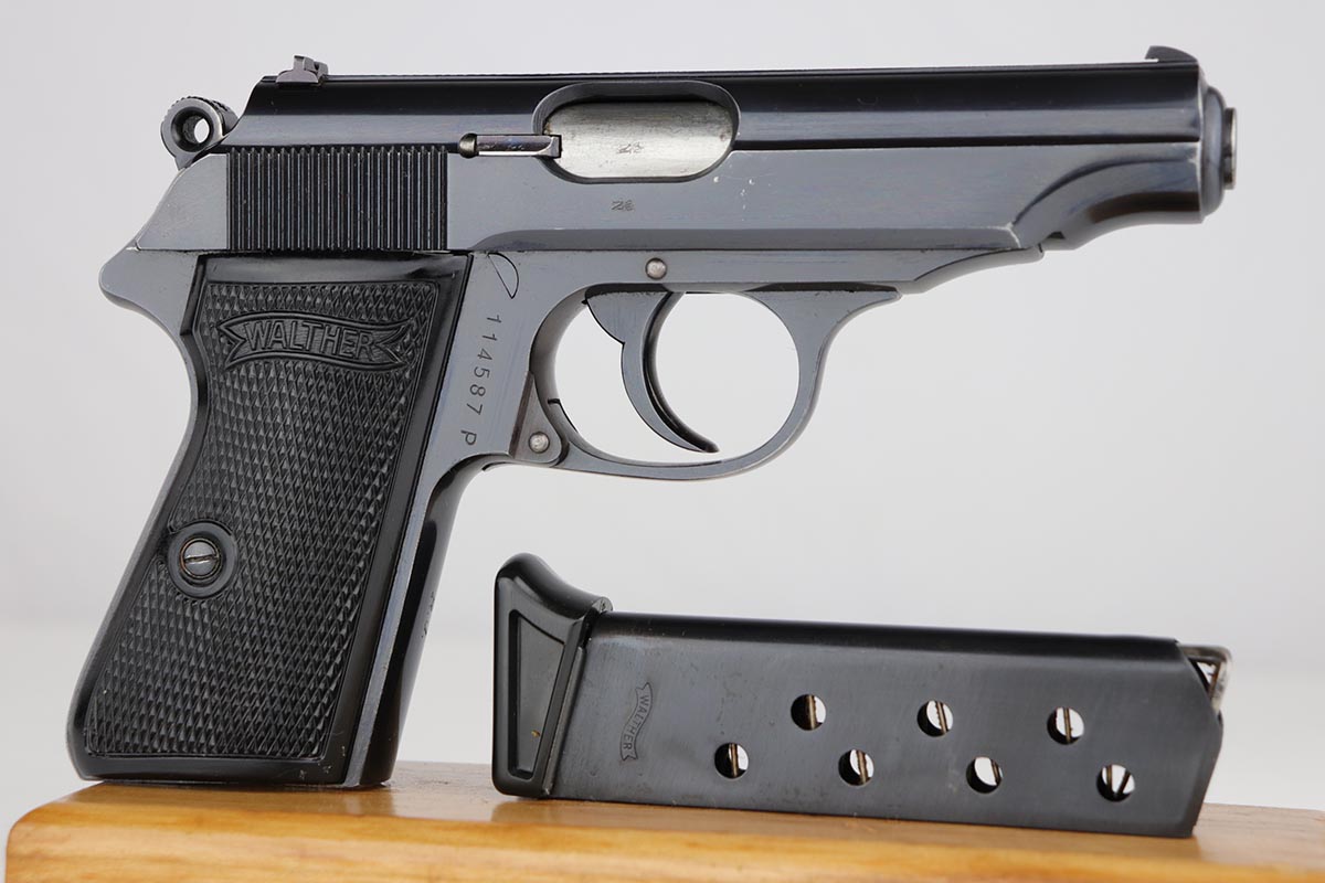 12/4/19 – This is a near-mint Walther PP, manufactured in about 1939 with Crown/N proofs. The RJ on the front strap is the distinct characteristic and the marking is under the original bluing. The original finish is about 98%, with some edge/muzzle wear on the slide, and some finish loss on the bottom of the back strap. Minty bore. RJ PP’s were issued to the “Reichs Bureau of Justice”, or in other words, the courts, judges, guards, etc. Probably rarely used other than annual “qualifying trials”.