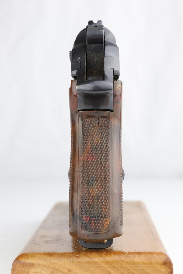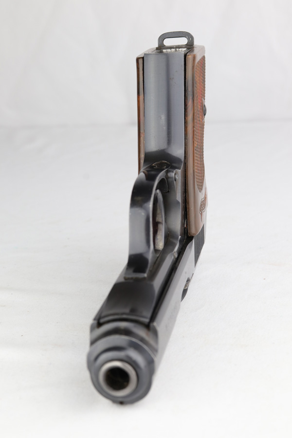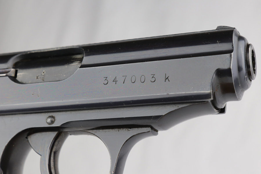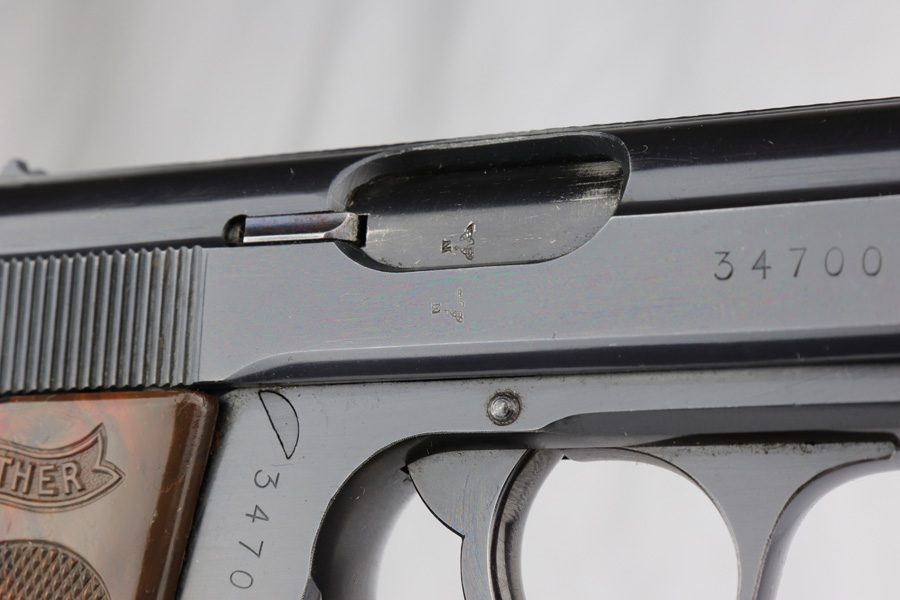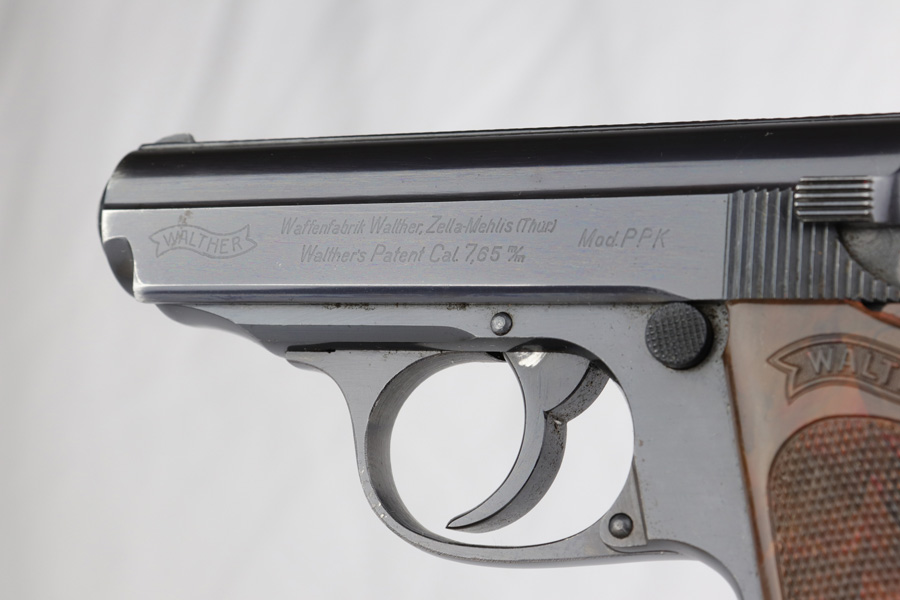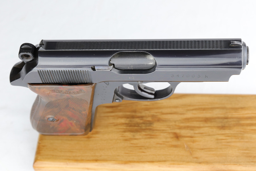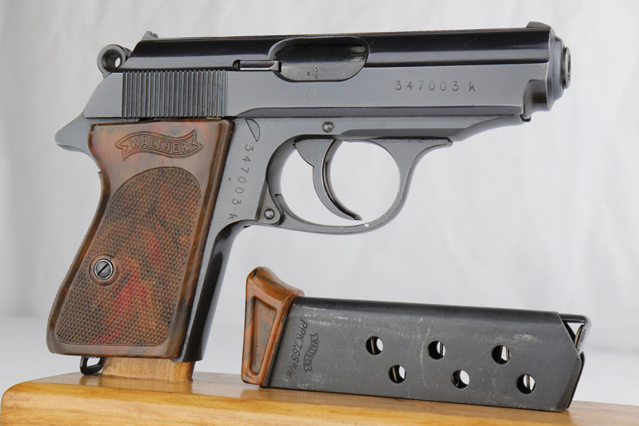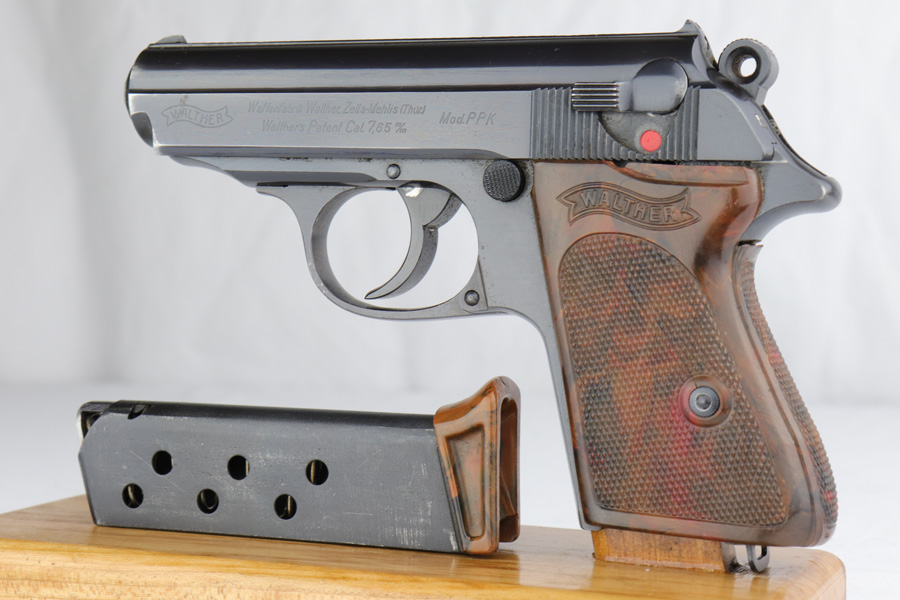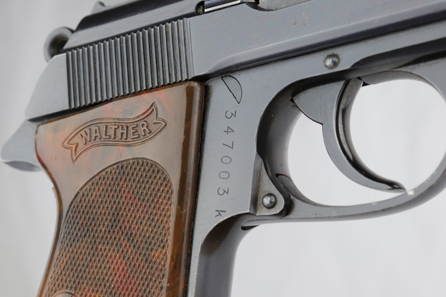3/15/19 – This is a near-mint Walther PPK from 1941. Made for the commercial market, this PPK is especially desirable as it has a high-polish finish but Eagle over N proofs. The bluing rates at 98% with only minor muzzle wear, and an area of finish loss on the trigger guard. Gorgeous grip with deep notes of red to it, though it does have a minor crack in the spine. Mint bore! Also includes one of the nicest finger extension magazines you’ll ever see.