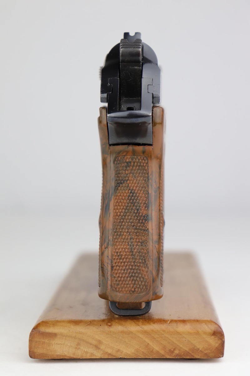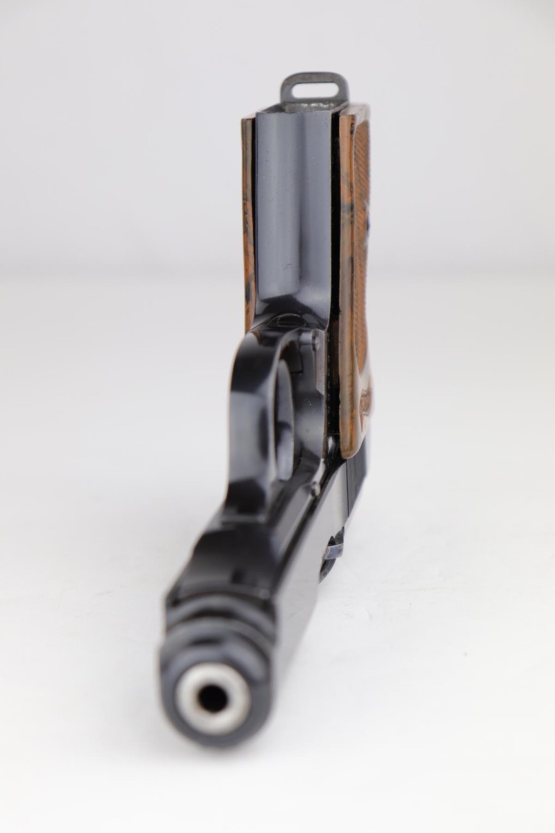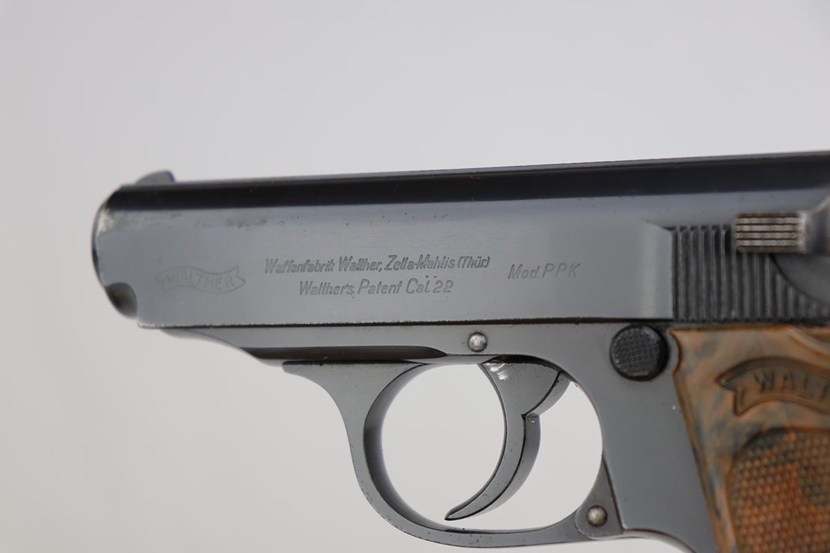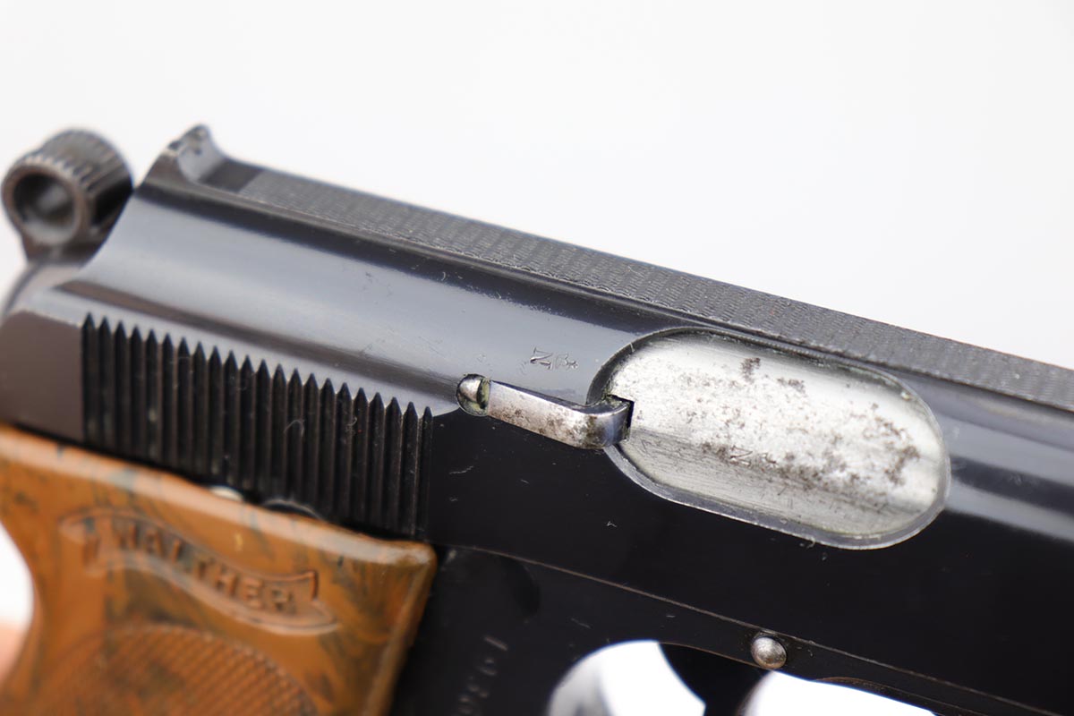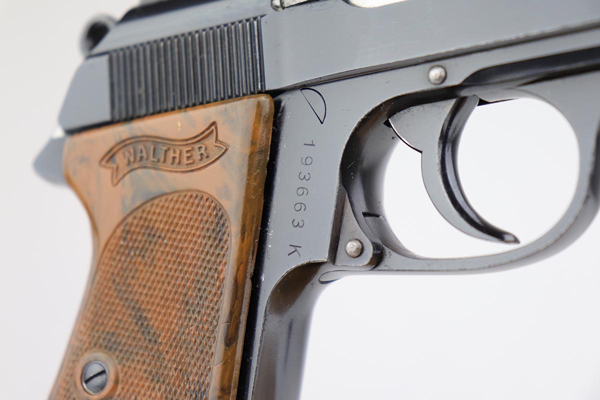 5/7/19 – This is a gorgeous example of a commercial Walther PPK from the Nazi era that is chambered in the less common .22 LR. The pistol is all original and correct with 99% high-polish blue remaining, showing just minor muzzle wear on the left side. Excellent grip with no major cracks or chips and the pistol has a mint bore. Original finger extension magazine is similarly minty. Only flaw on this pistol is there is minimal fire blue remaining on the safety or extractor.