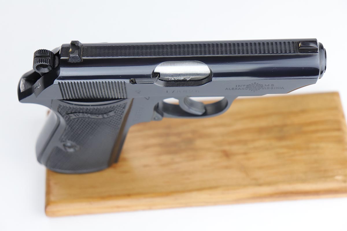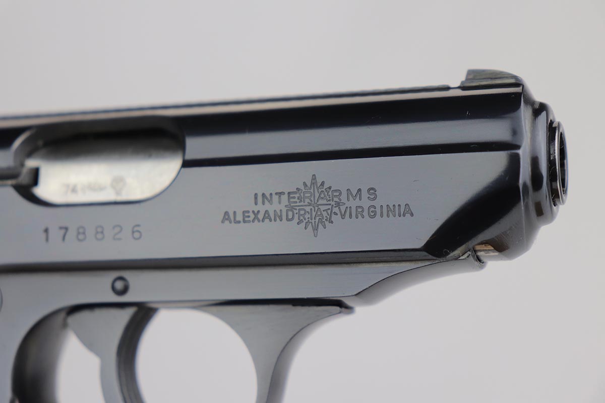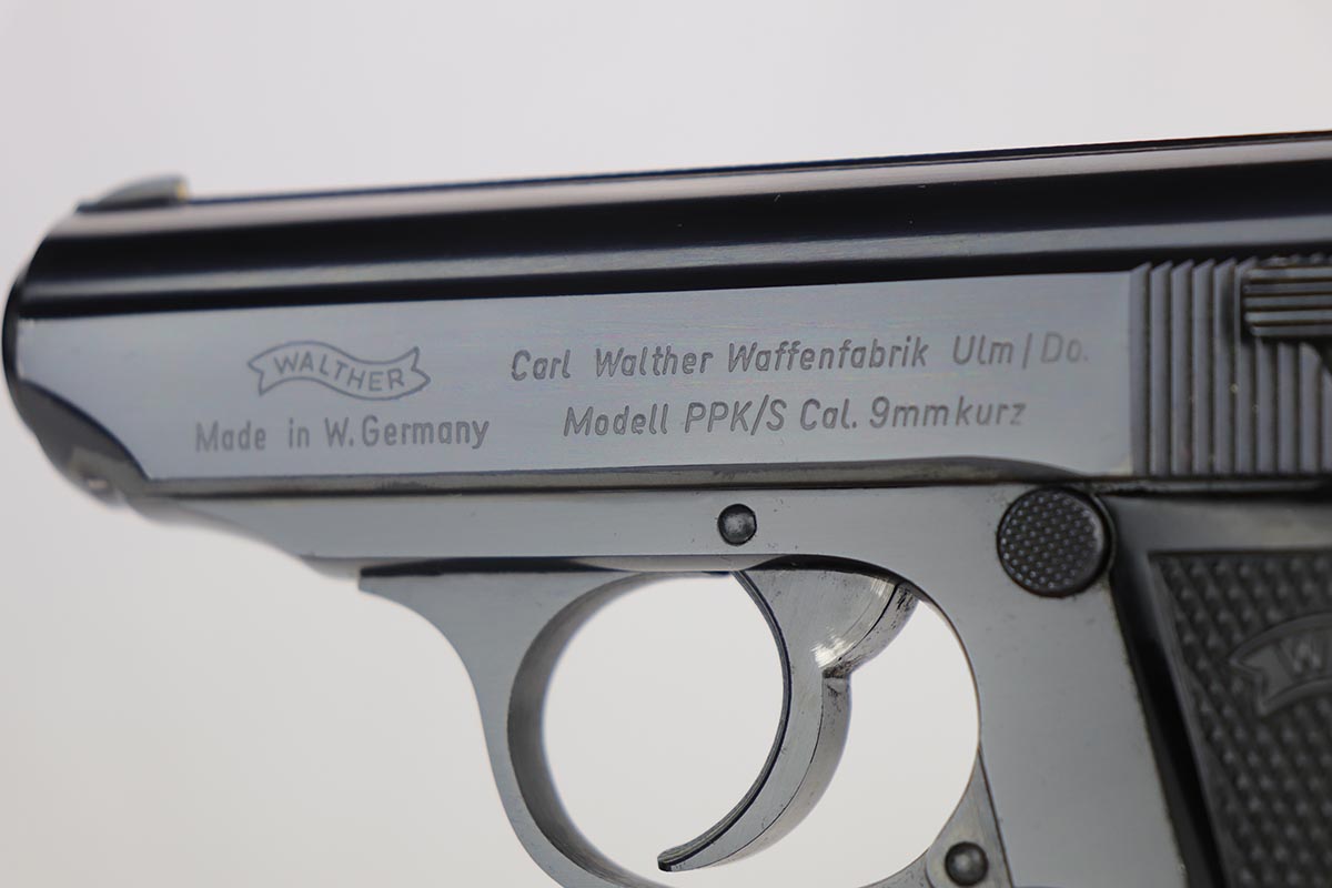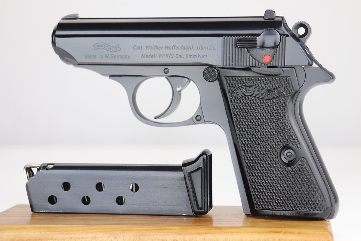 9/27/19 – This is a near-mint Walther PPK/S that was manufactured in 1974 in West Germany. It has 98-99% of the original blue, with a few minor hints of edge wear. Minty bore, grips and finger extension magazine. Interarms import mark on right side slide.