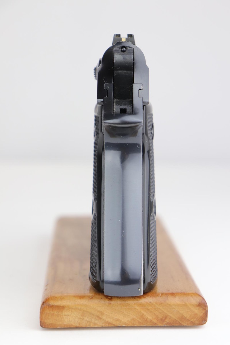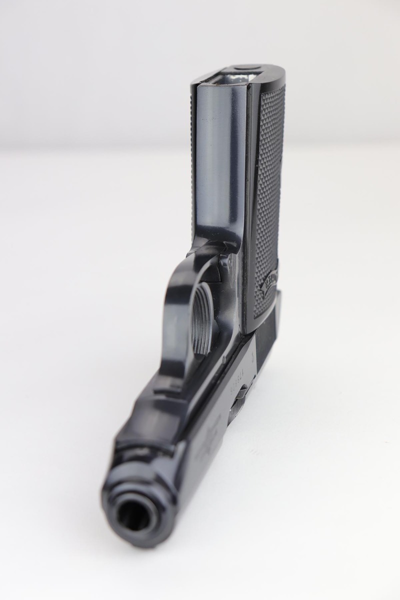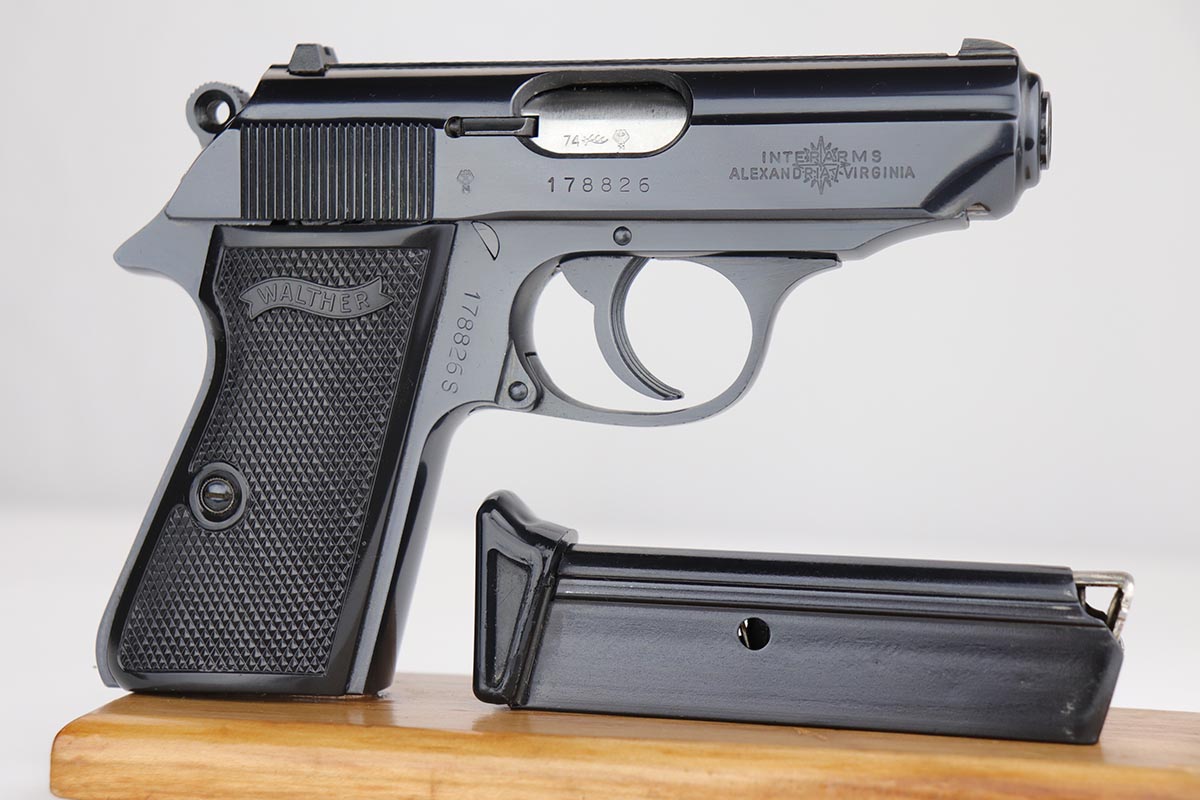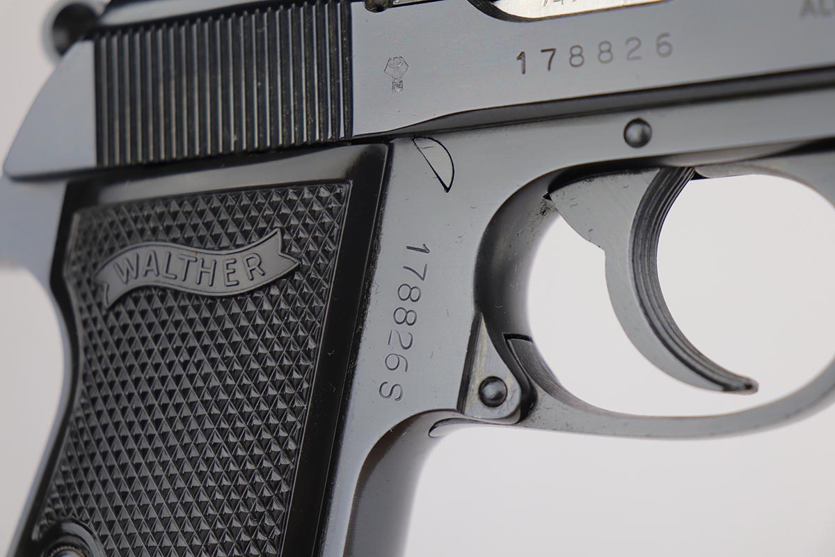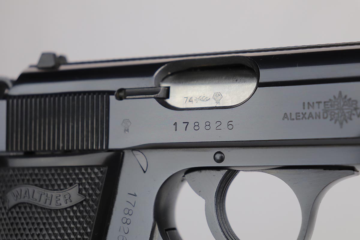 9/27/19 – This is a near-mint Walther PPK/S that was manufactured in 1974 in West Germany. It has 98-99% of the original blue, with a few minor hints of edge wear. Minty bore, grips and finger extension magazine. Interarms import mark on right side slide.