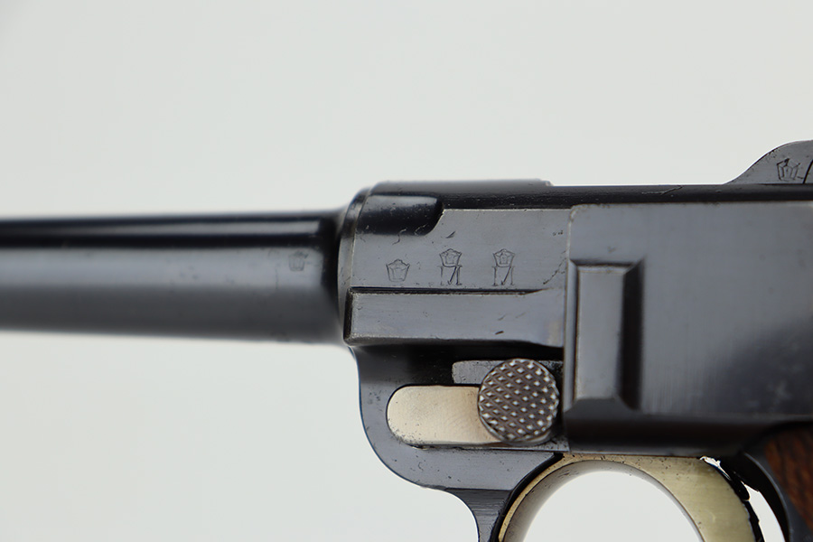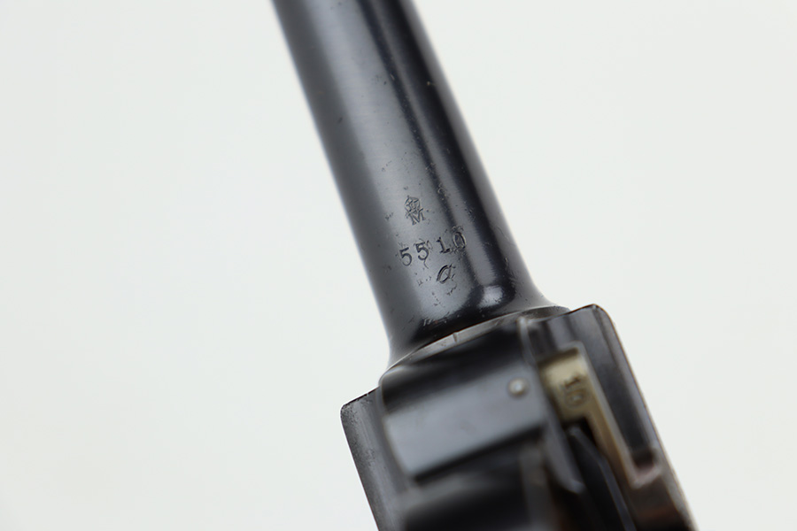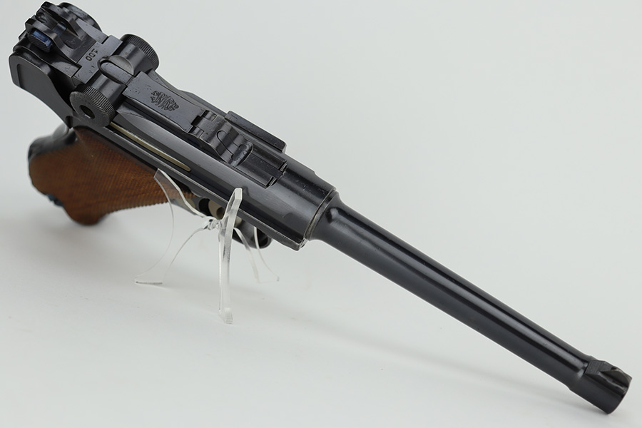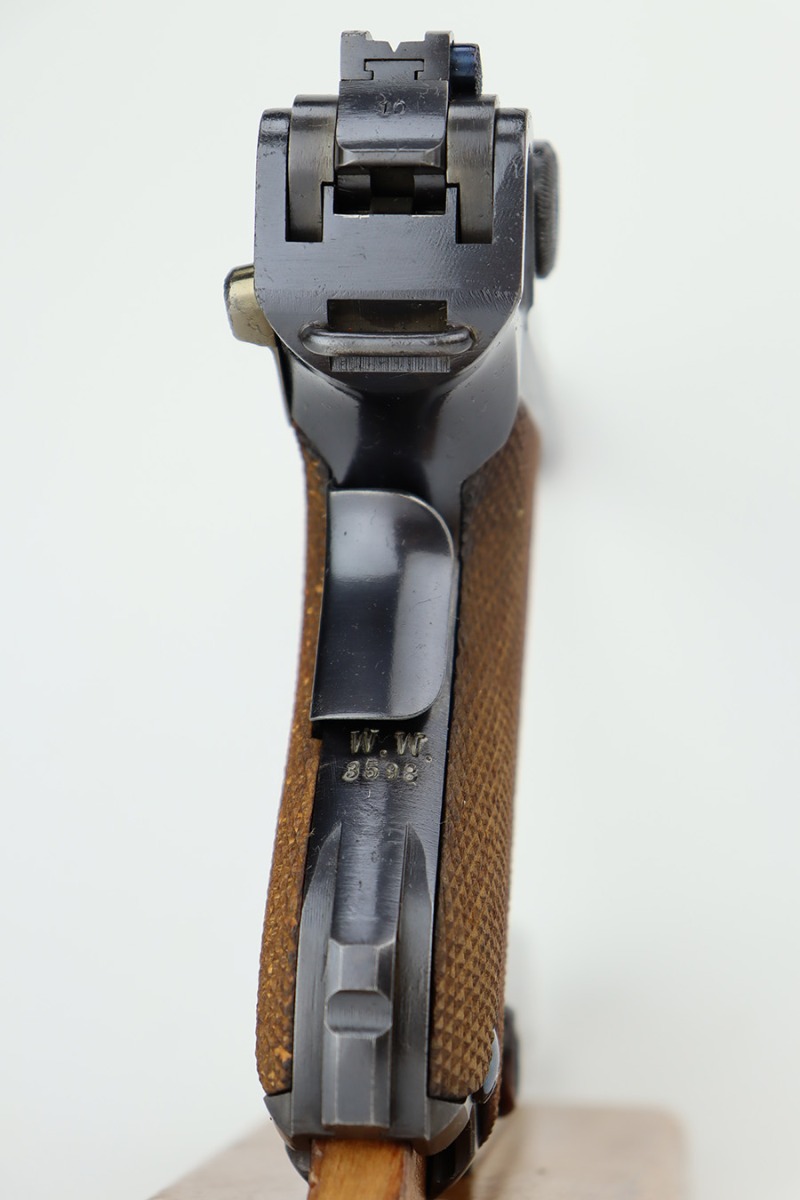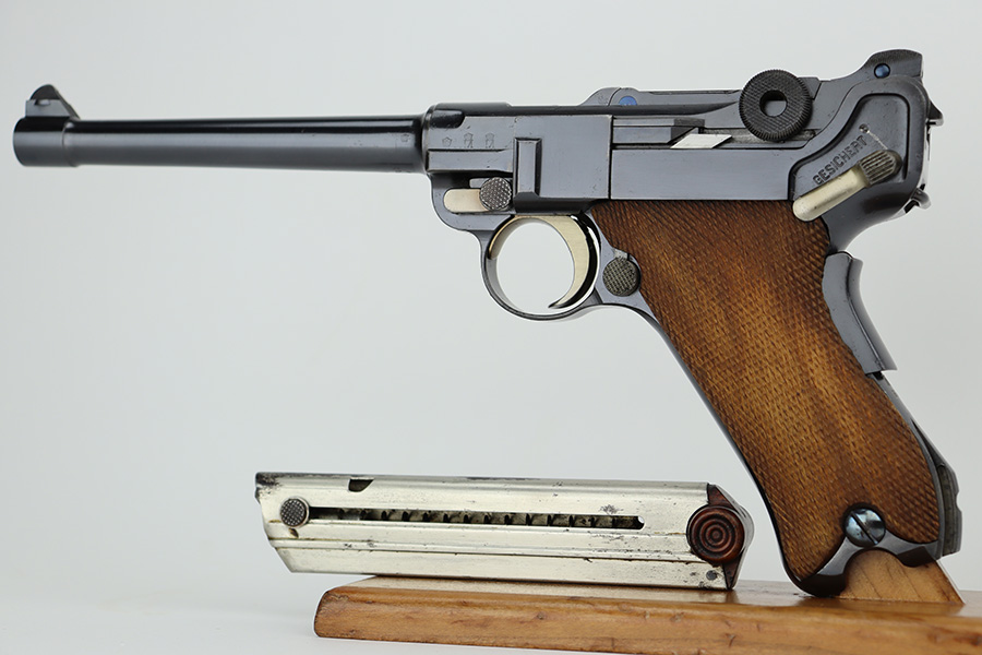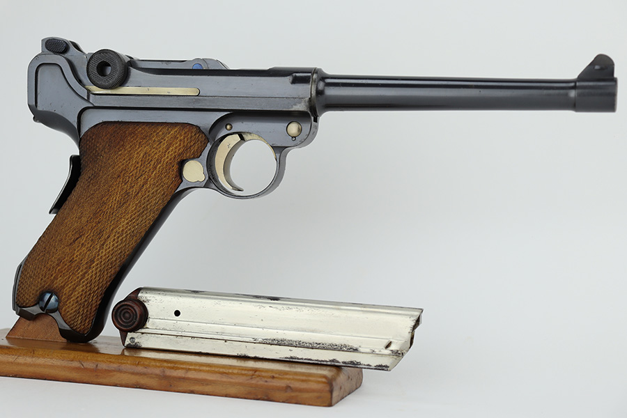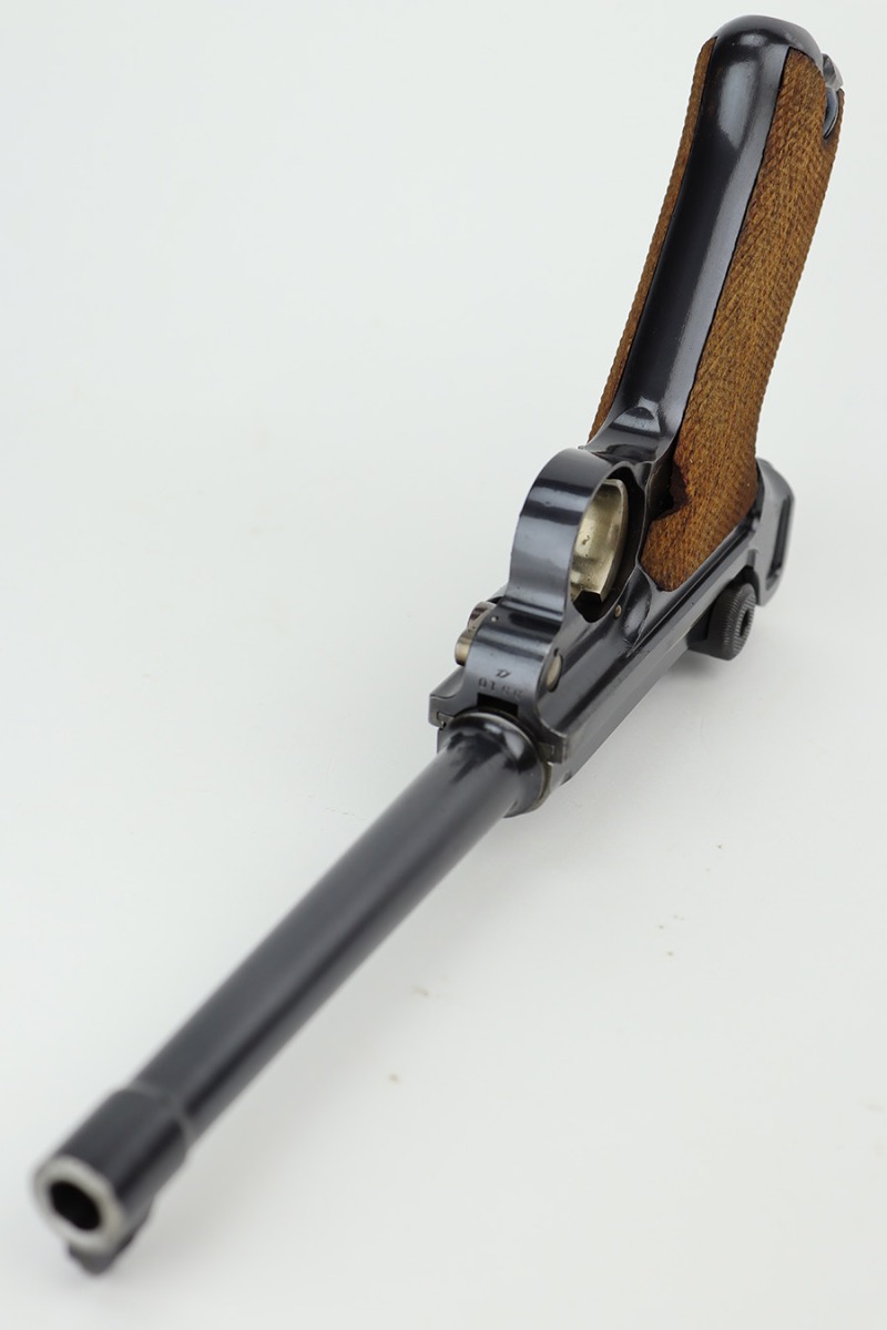 8/1/23 – This is a beautiful example of a DWM Navy Luger issued to the Imperial German Navy during WW1. All matching with the proper Imperial military proofs. Navy unit marking on the back strap. This particular gun is a professional restoration done by the well-known Thomas Heller. Included with the gun are original receipts and correspondence between Thomas and the customer. The gun is gorgeous, showing virtually no actual finish loss. Fitted with mint wood grips. Comes with an un-numbered Navy-marked magazine. The bore has good rifling with minor pin-pricking throughout.