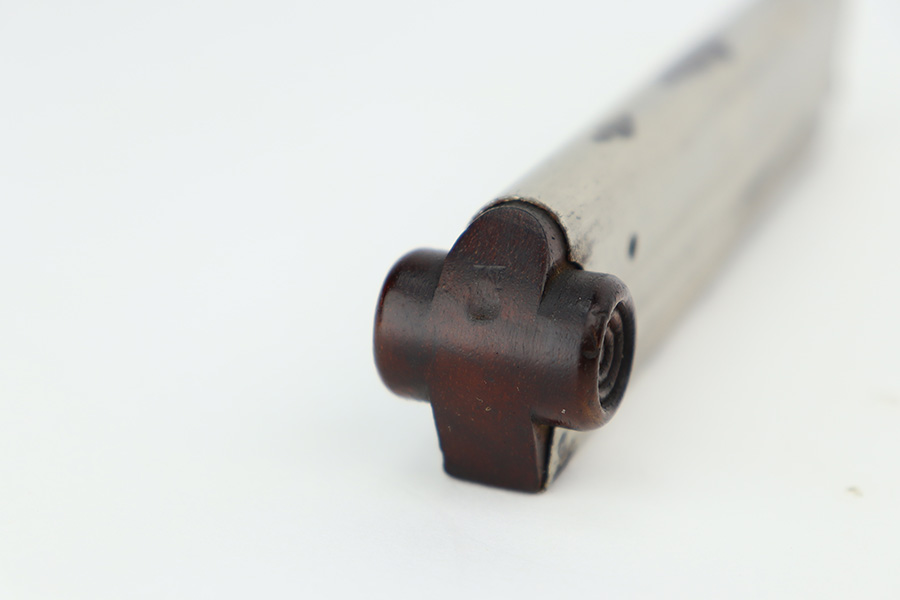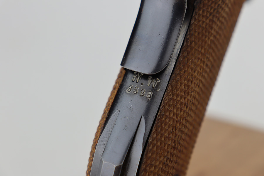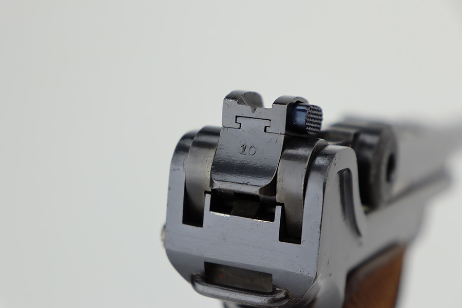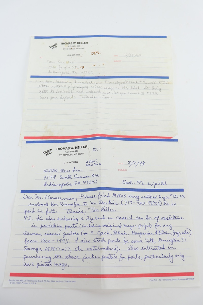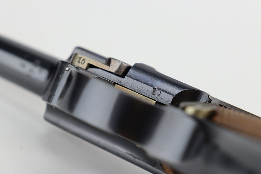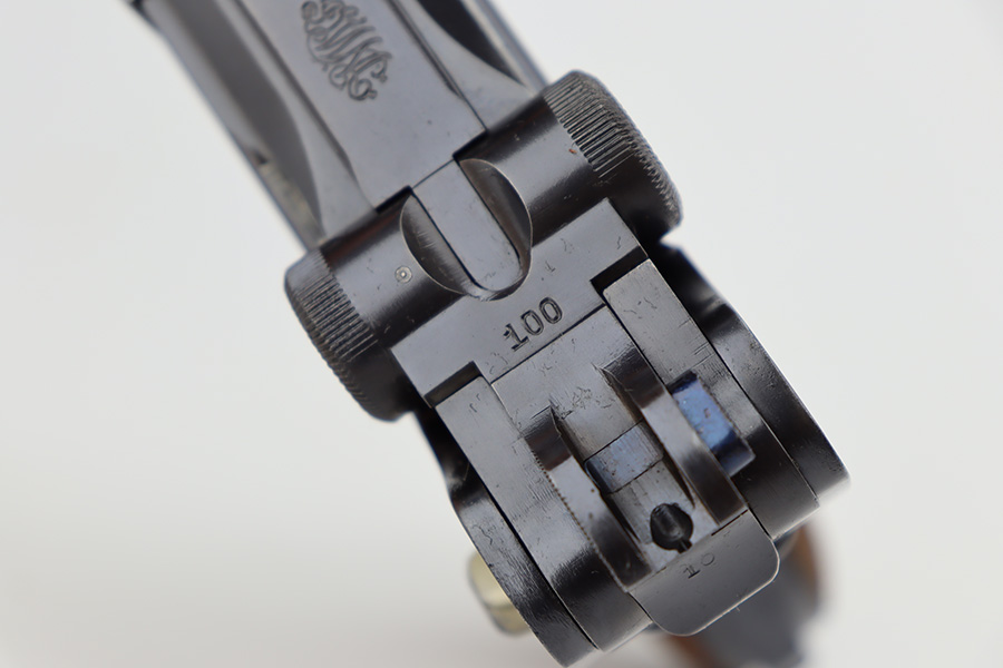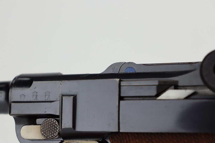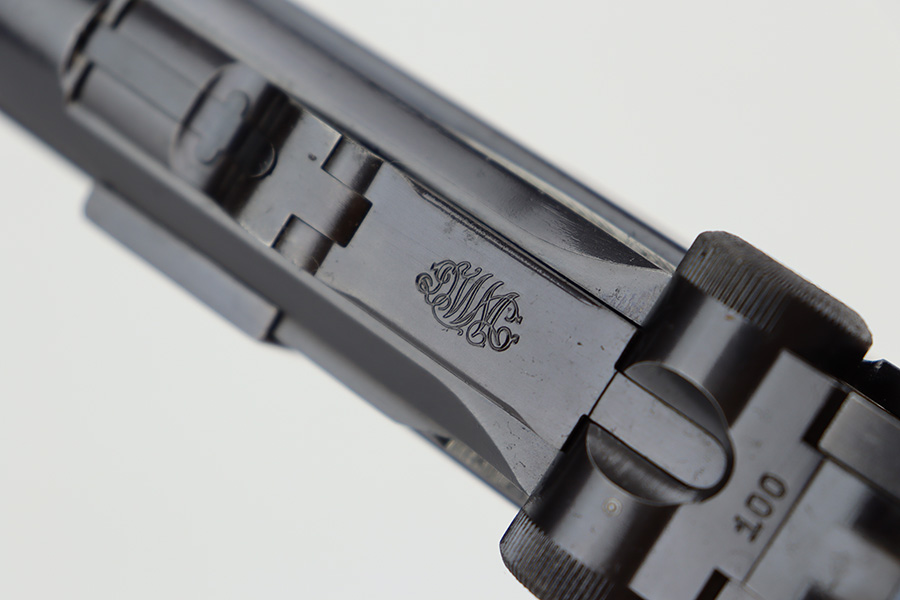 8/1/23 – This is a beautiful example of a DWM Navy Luger issued to the Imperial German Navy during WW1. All matching with the proper Imperial military proofs. Navy unit marking on the back strap. This particular gun is a professional restoration done by the well-known Thomas Heller. Included with the gun are original receipts and correspondence between Thomas and the customer. The gun is gorgeous, showing virtually no actual finish loss. Fitted with mint wood grips. Comes with an un-numbered Navy-marked magazine. The bore has good rifling with minor pin-pricking throughout.