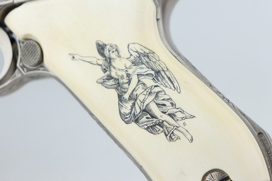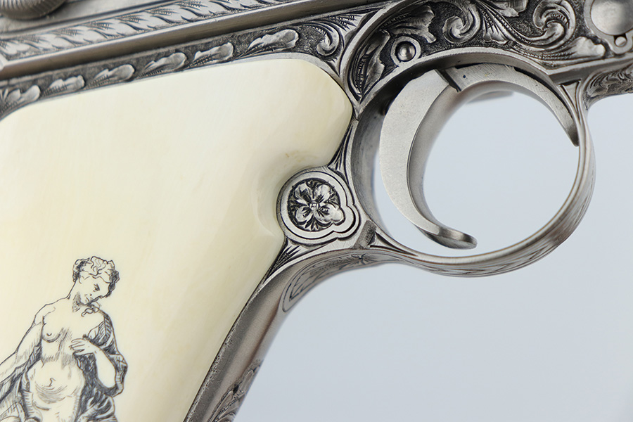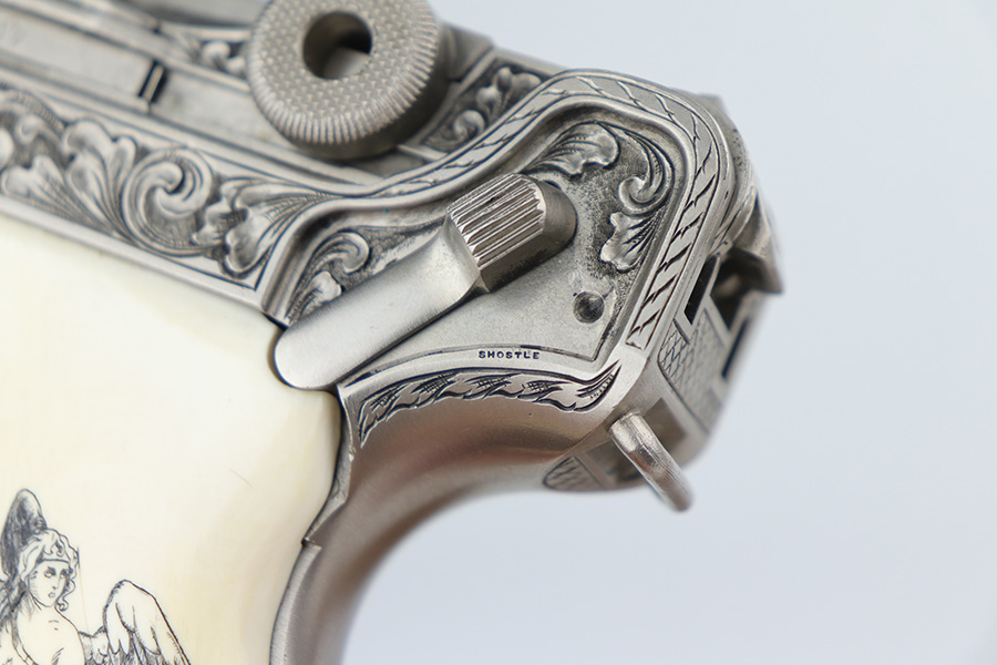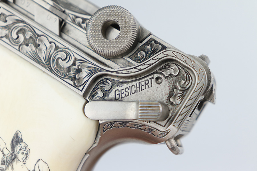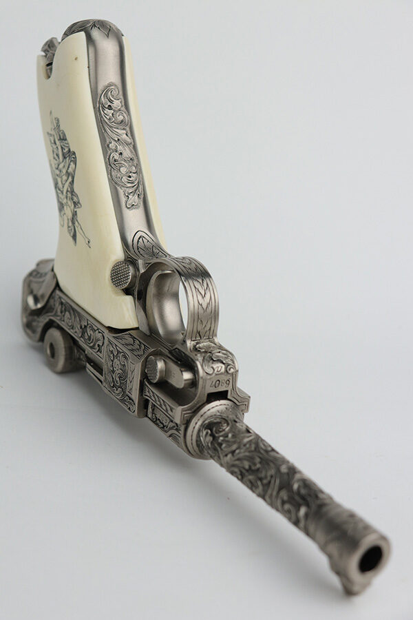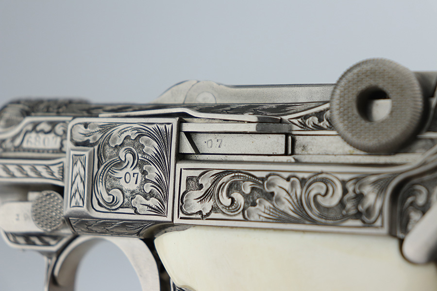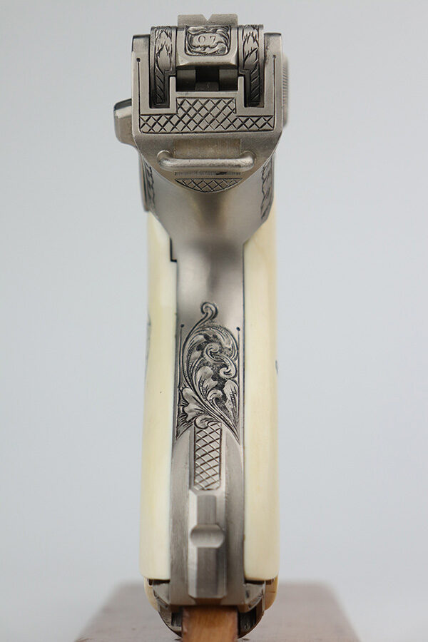 9/30/21 – This is a stunning example of a beautifully-engraved WW1-era Luger. This Luger was engraved by the master engraver, Ben Shostle, famous for making these pieces of art. The gun features a floral engraving pattern throughout that is extremely deep and crisp, probably the best looking we’ve ever seen. Also comes with ivory grips, embellished with an image of an angel on the left side and a woman on the right. The whole gun then has a gorgeous flat nickel finish. All of the parts were re-numbered to match except for the takedown lever. It was put together from parts. It has a DWM toggle and what we believe is a 1920-dated Mauser frame. There is an added police sear safety as well. The gun is in mint condition with no signs of wear. It comes with a matching aluminum bottom magazine. Excellent bore with strong rifling. We featured this gun on a recent YouTube video. Click the link below to watch!