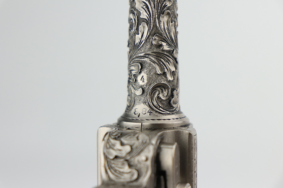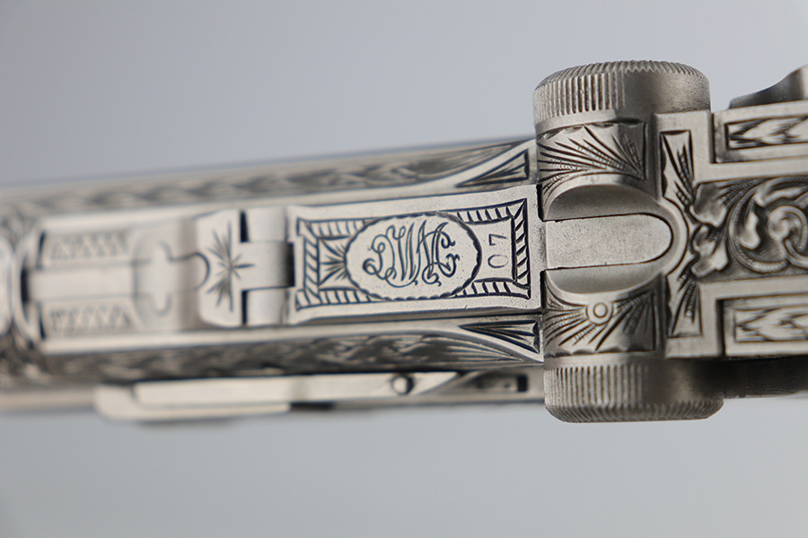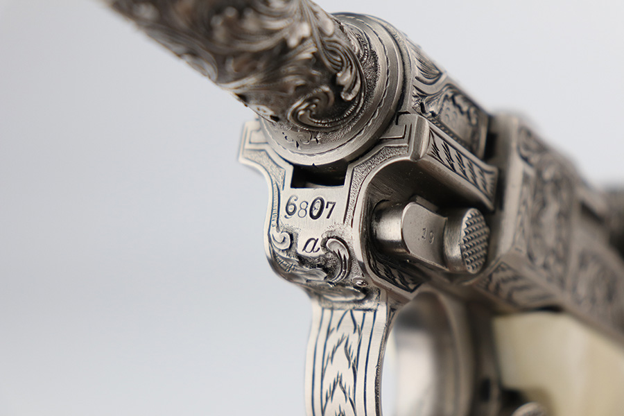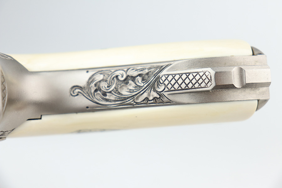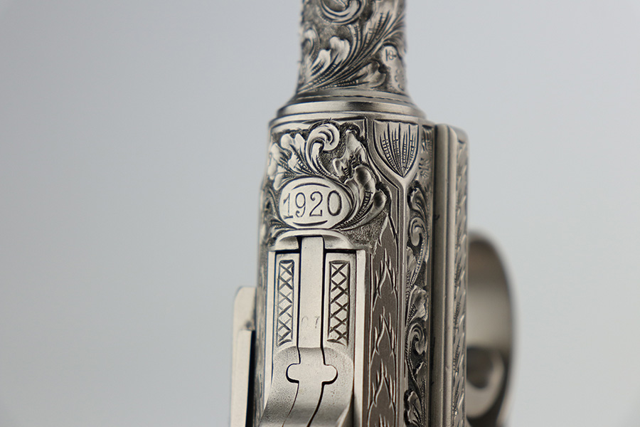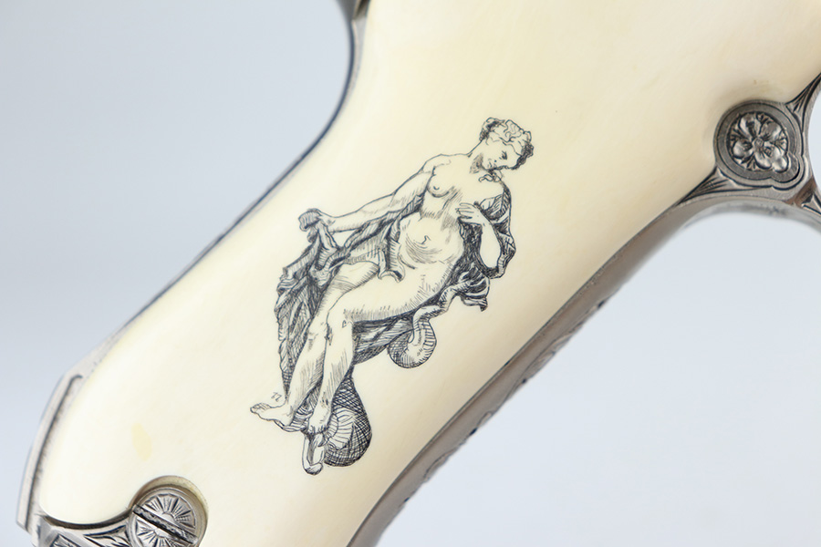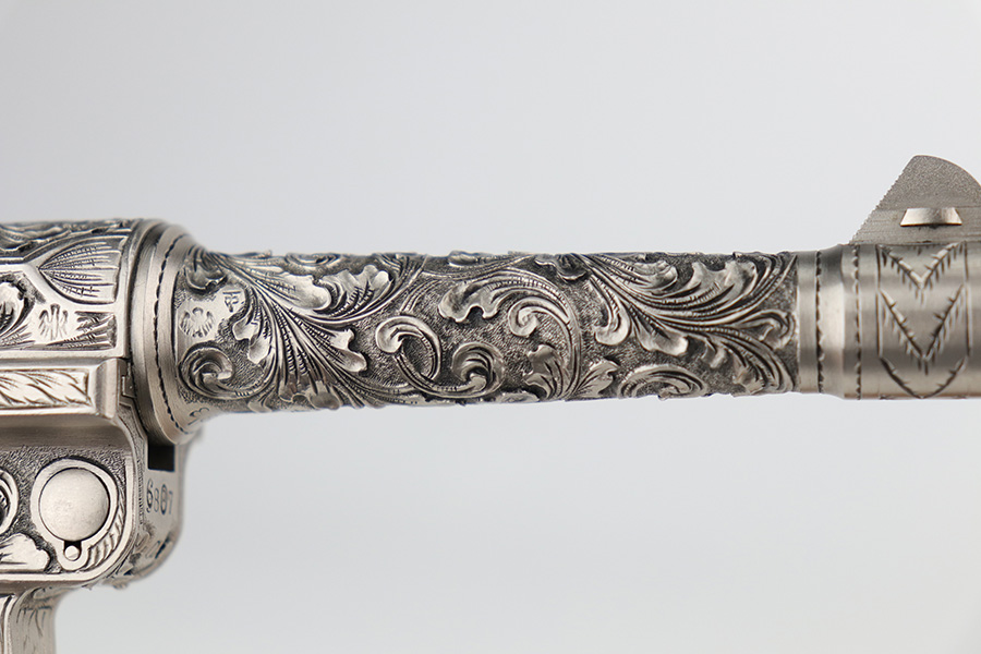 9/30/21 – This is a stunning example of a beautifully-engraved WW1-era Luger. This Luger was engraved by the master engraver, Ben Shostle, famous for making these pieces of art. The gun features a floral engraving pattern throughout that is extremely deep and crisp, probably the best looking we’ve ever seen. Also comes with ivory grips, embellished with an image of an angel on the left side and a woman on the right. The whole gun then has a gorgeous flat nickel finish. All of the parts were re-numbered to match except for the takedown lever. It was put together from parts. It has a DWM toggle and what we believe is a 1920-dated Mauser frame. There is an added police sear safety as well. The gun is in mint condition with no signs of wear. It comes with a matching aluminum bottom magazine. Excellent bore with strong rifling. We featured this gun on a recent YouTube video. Click the link below to watch!