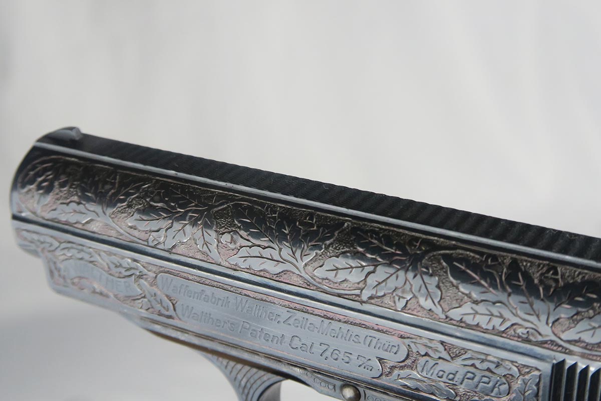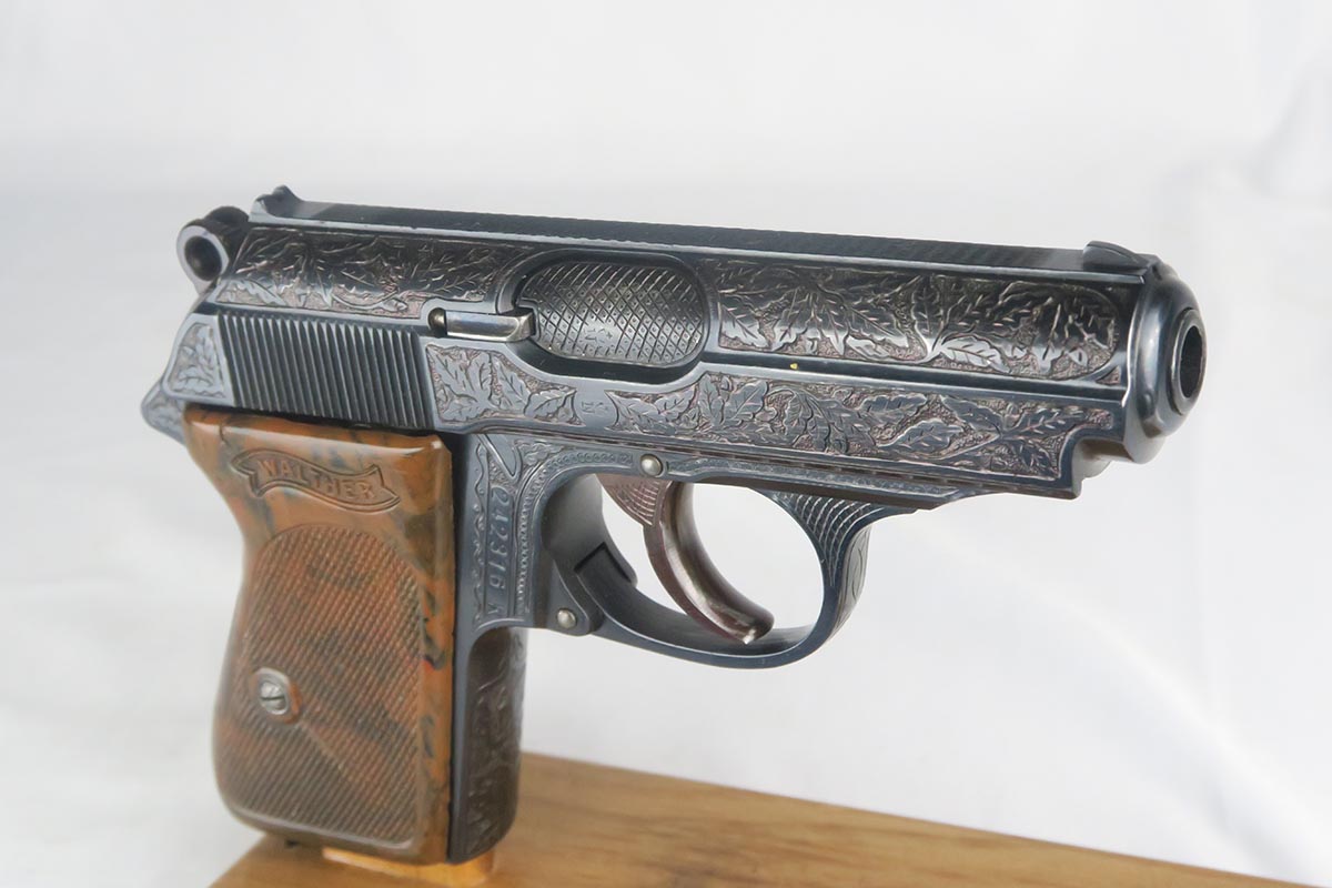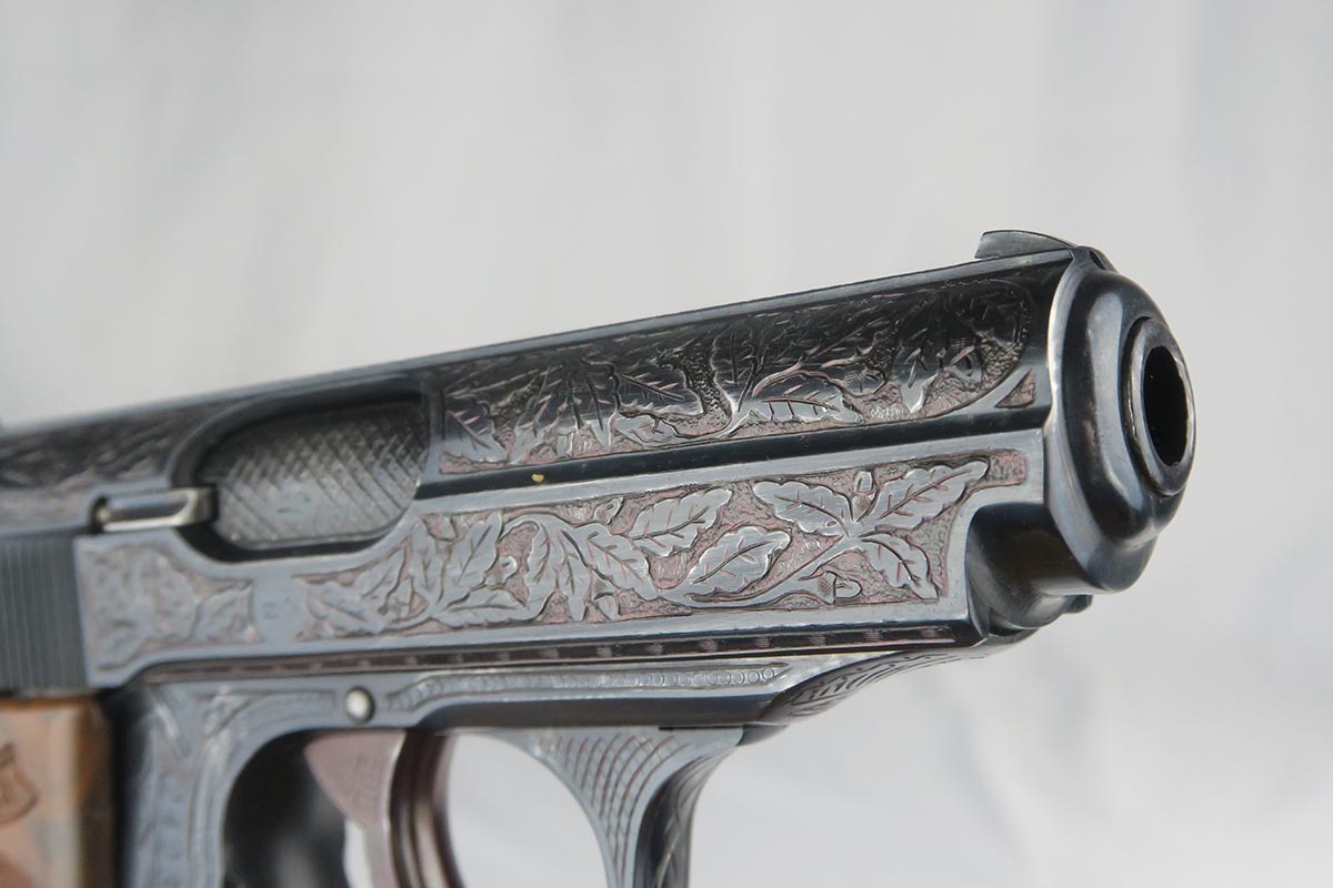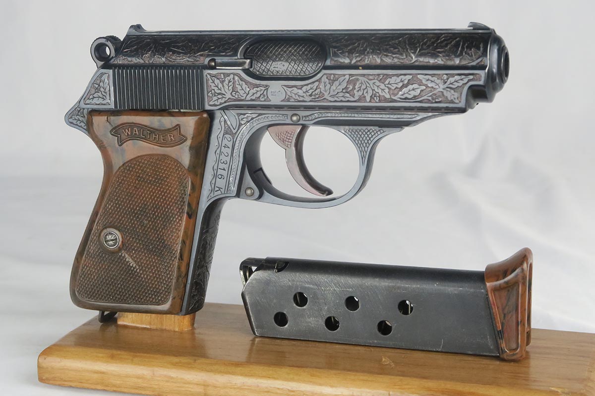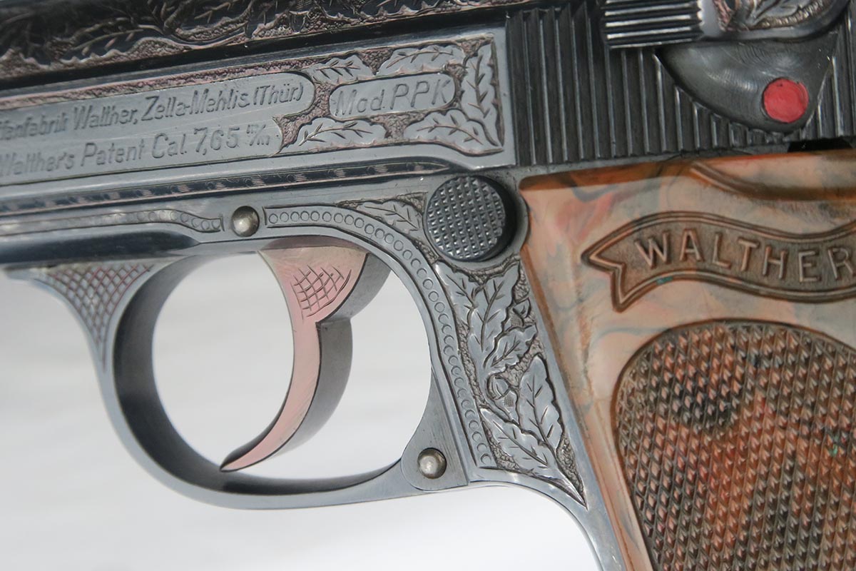 10/27/17 – This is an absolutely gorgeous and very rare Walther PPK that has been engraved in the Oak Leaf style.  It is in near-mint condition, with virtually no flaws to mention.  The engraving looks to be factory original and done before the metal had been hardened, as evidenced by the expert lines and curves to the art.  The grip has a hairline crack in the spine, and the pistol comes with just the ONE finger extension magazine.  Serial puts this one in 1938-39 range.  Comes with a postwar case.