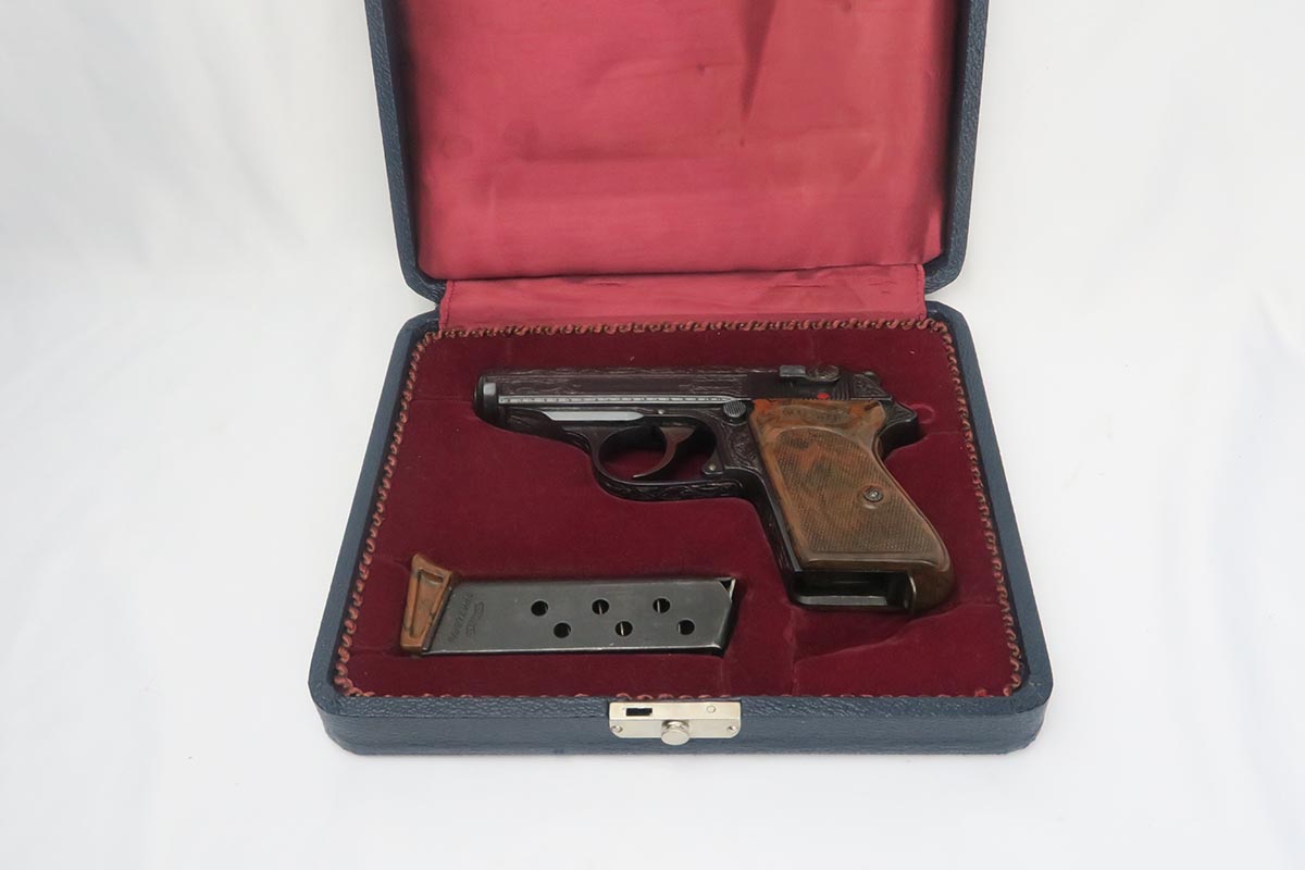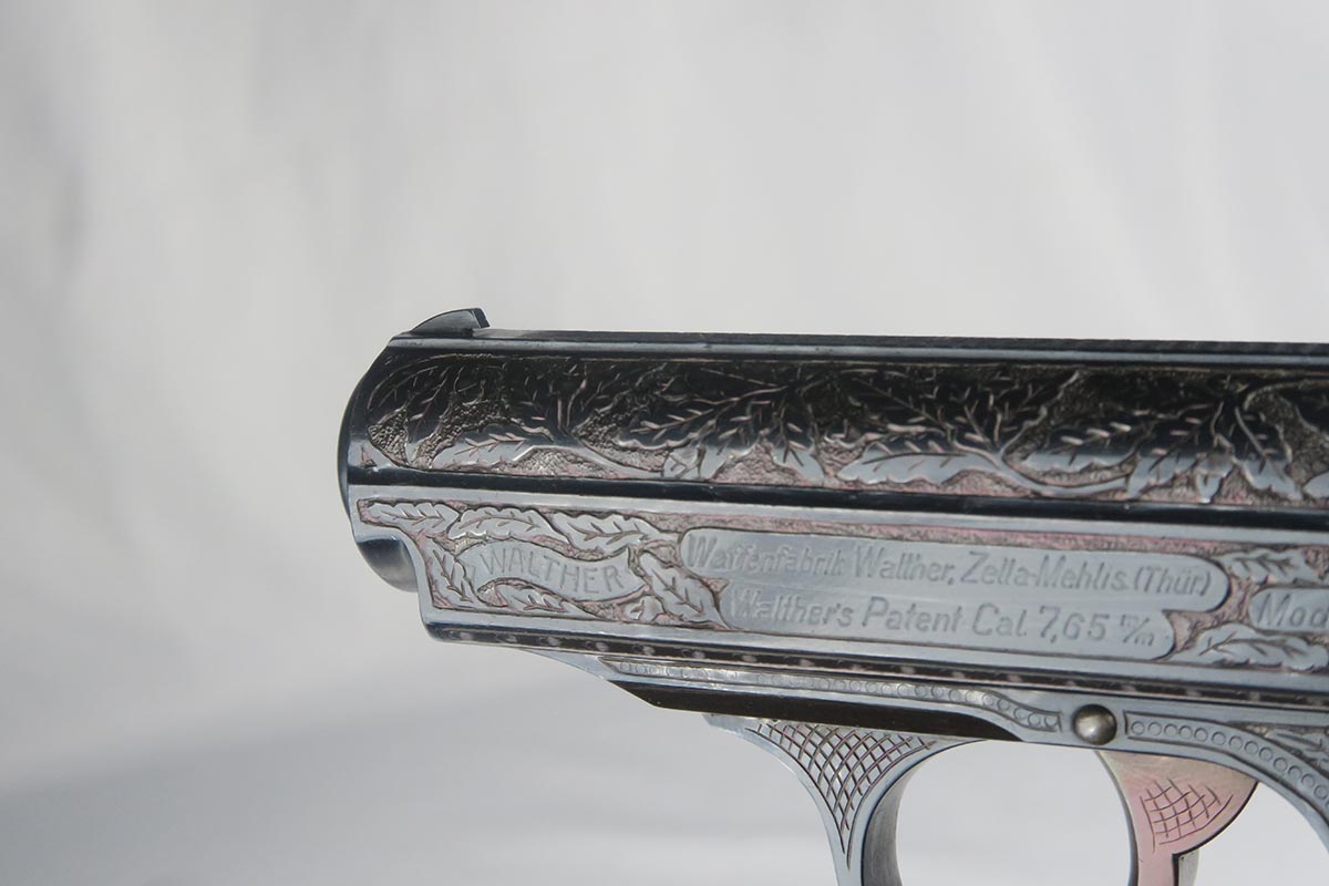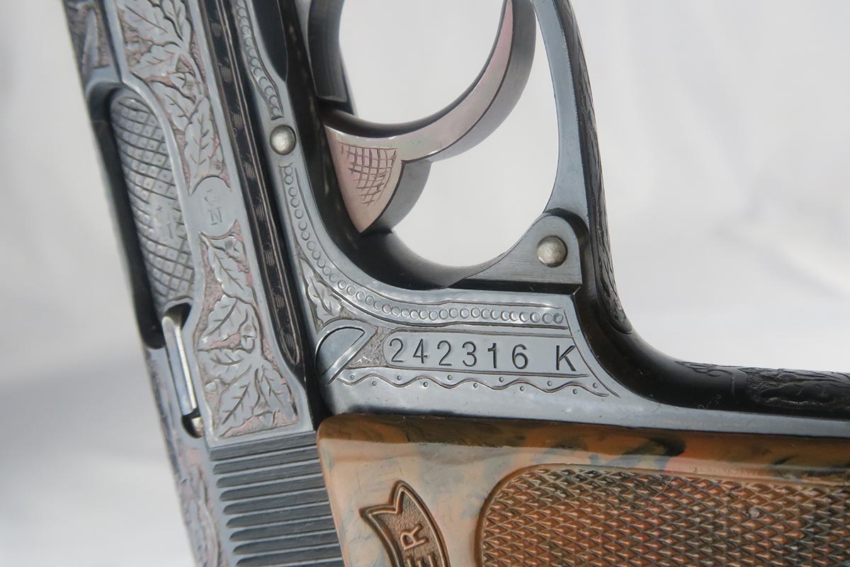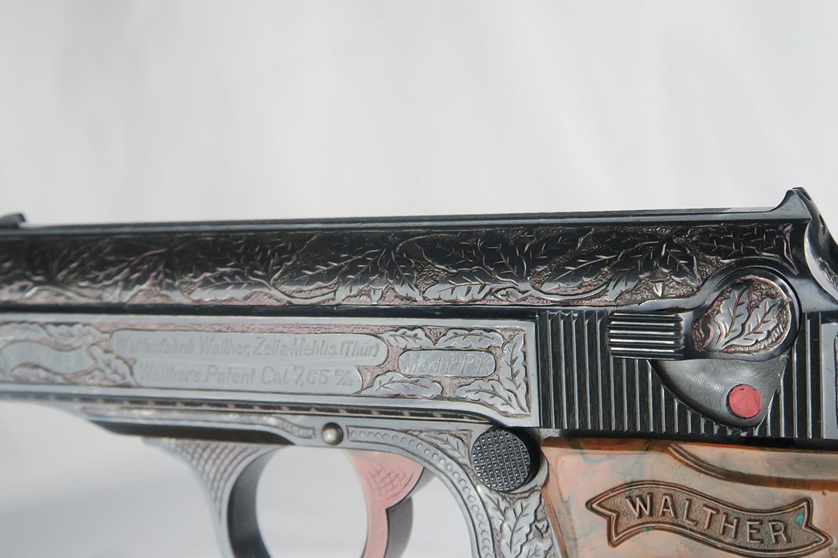 10/27/17 – This is an absolutely gorgeous and very rare Walther PPK that has been engraved in the Oak Leaf style.  It is in near-mint condition, with virtually no flaws to mention.  The engraving looks to be factory original and done before the metal had been hardened, as evidenced by the expert lines and curves to the art.  The grip has a hairline crack in the spine, and the pistol comes with just the ONE finger extension magazine.  Serial puts this one in 1938-39 range.  Comes with a postwar case.