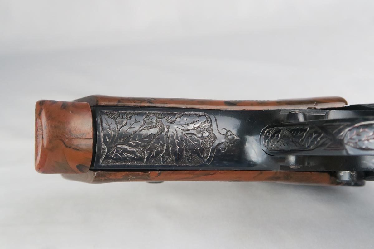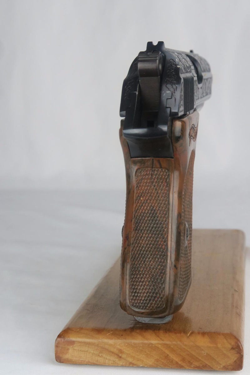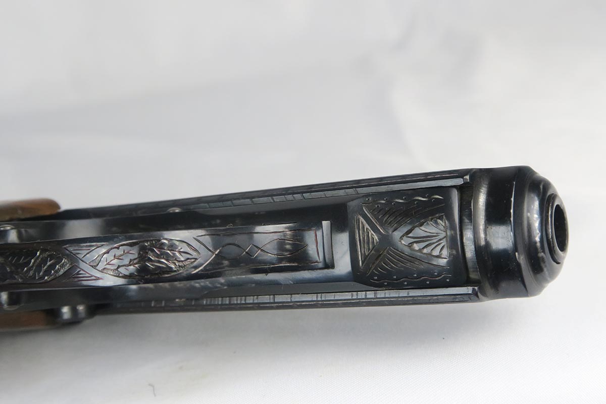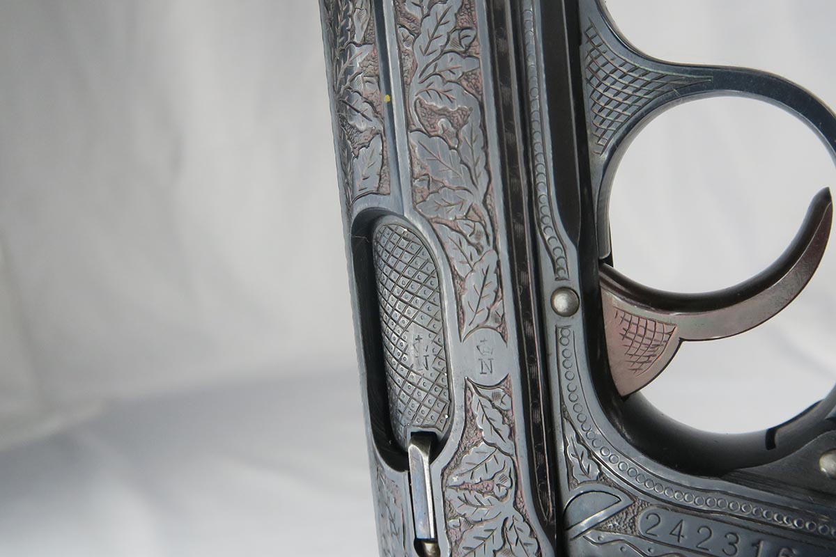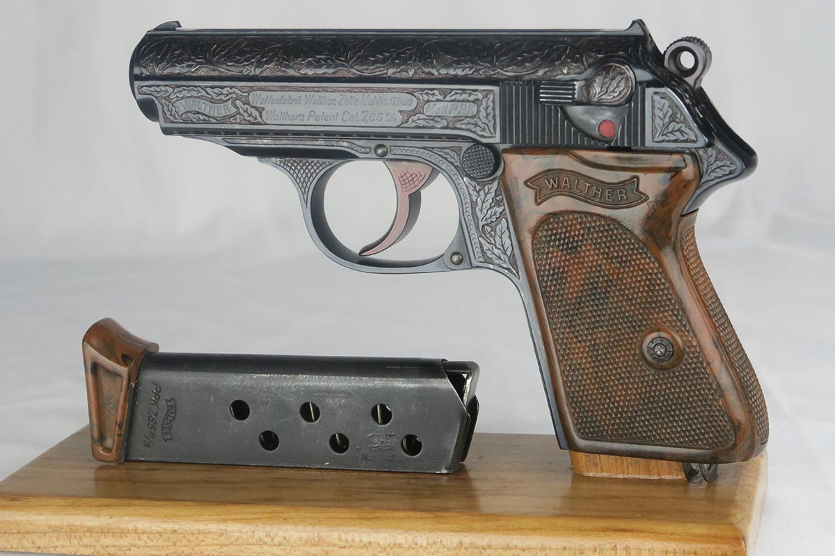 10/27/17 – This is an absolutely gorgeous and very rare Walther PPK that has been engraved in the Oak Leaf style.  It is in near-mint condition, with virtually no flaws to mention.  The engraving looks to be factory original and done before the metal had been hardened, as evidenced by the expert lines and curves to the art.  The grip has a hairline crack in the spine, and the pistol comes with just the ONE finger extension magazine.  Serial puts this one in 1938-39 range.  Comes with a postwar case.