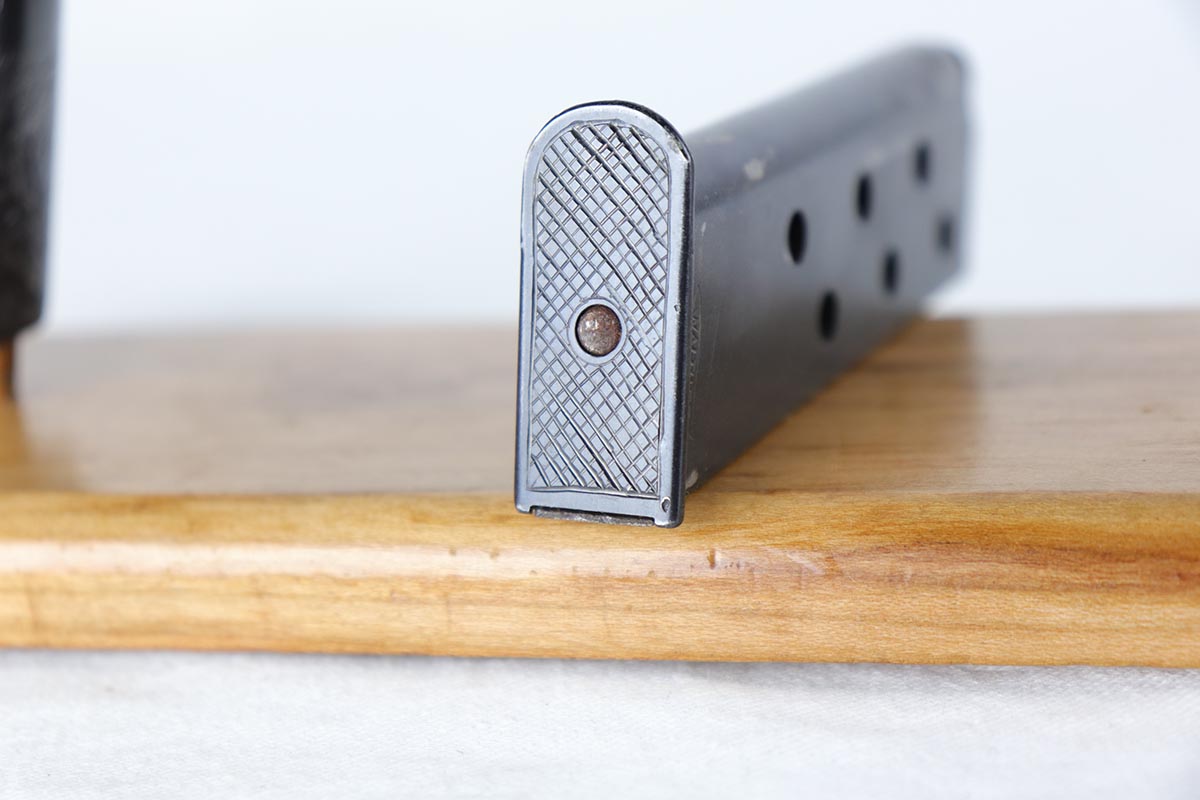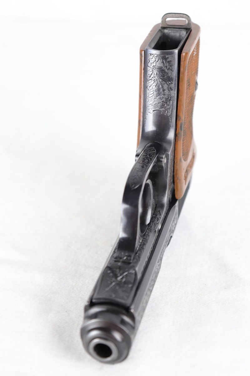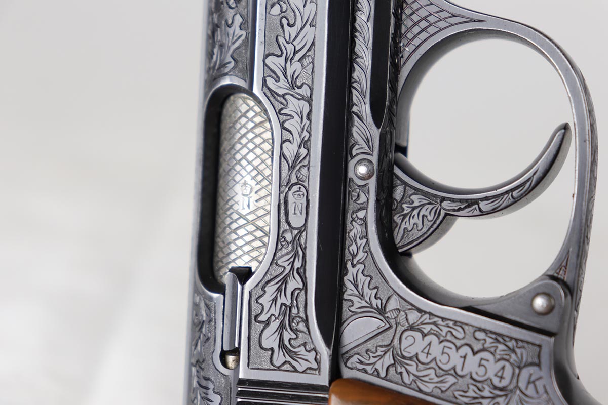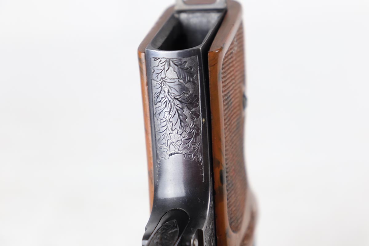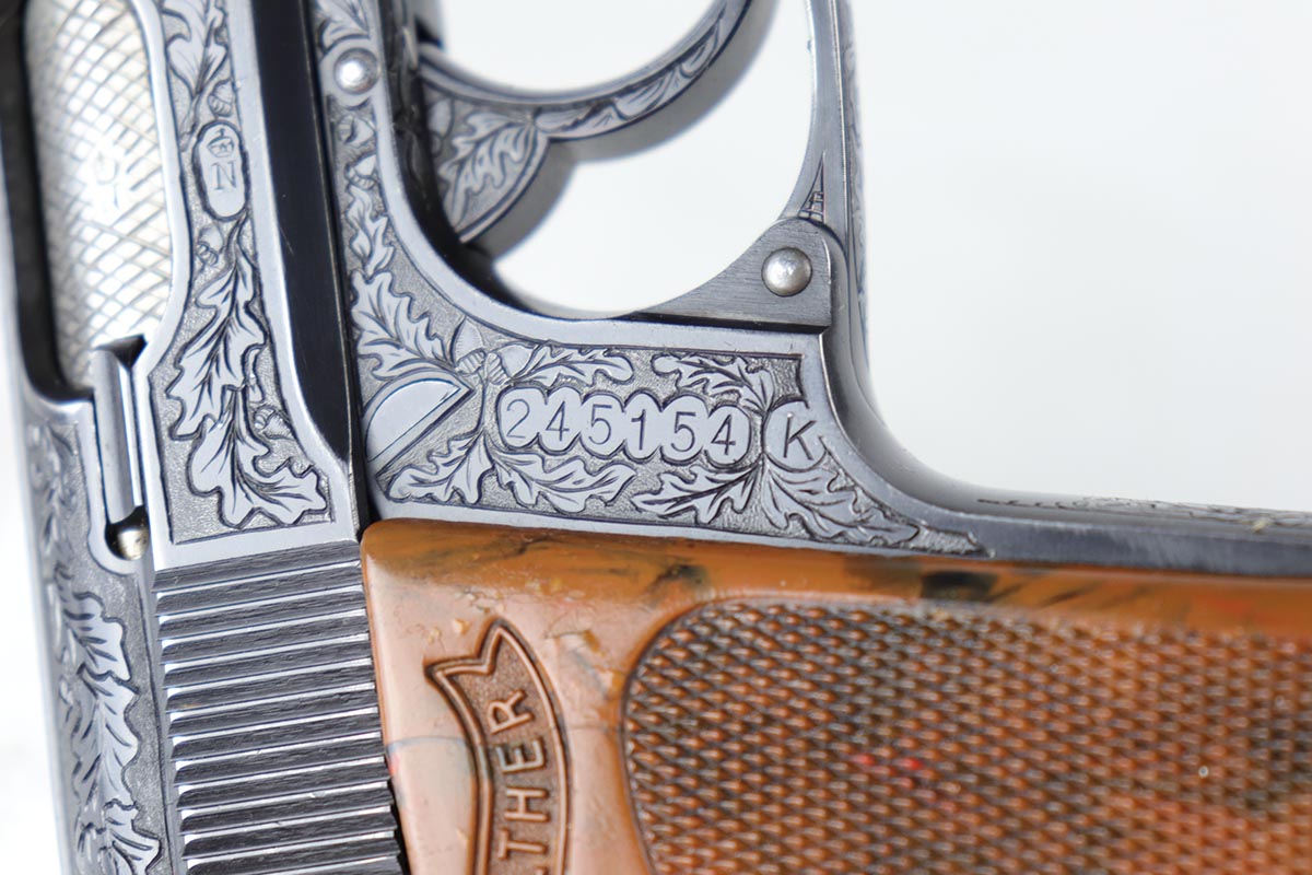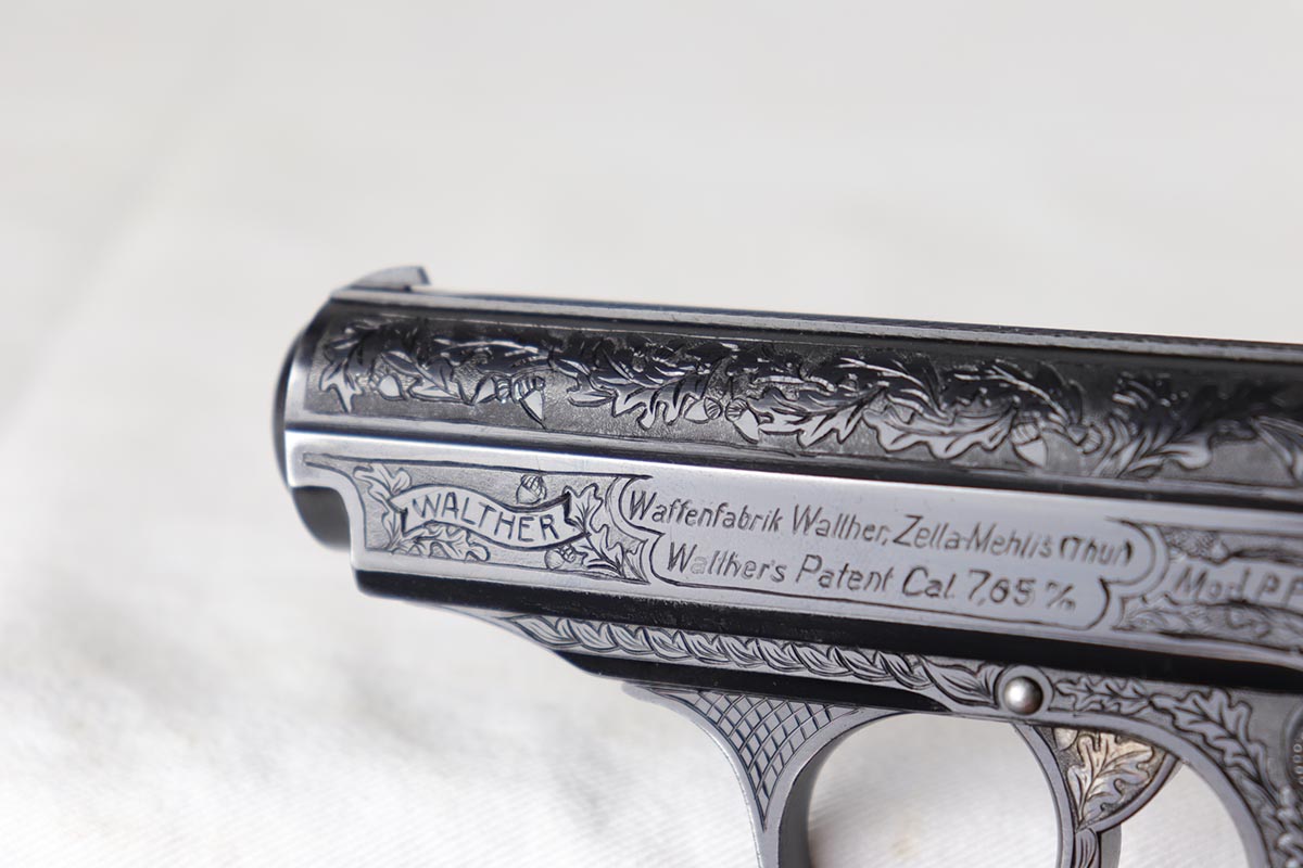 2/20/19 – This is a beautifully engraved PPK in the Germanic style – Oak Leaf and Acorn pattern. It is post factory engraved but very similar in style and quality to the factory engraved pieces. The gun is crown N proofed and made in 1939, just before the outbreak of hostilities. It has the correct one piece brown grip and a correct Walther banner magazine – with an engraved bottom. Mechanically it seems all correct and shootable. The only exception is the cartridge indicator pin. The spring still works, but the pin stays in the “out” position. Bore is shiny with very little wear. The engraving fully covers the gun to make an excellent display piece for the advanced collector.