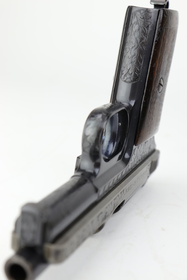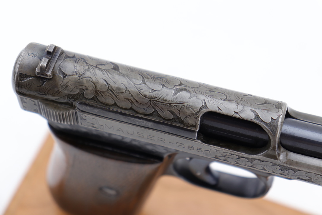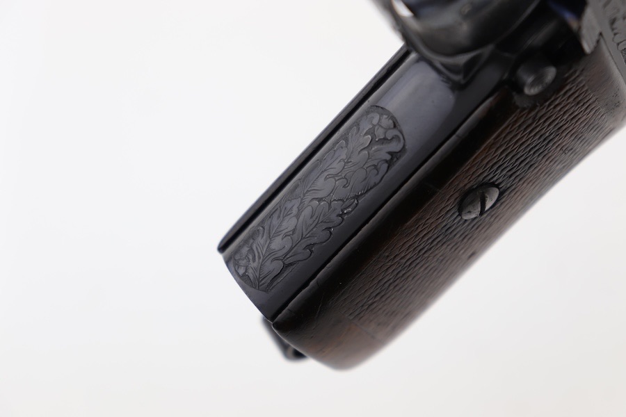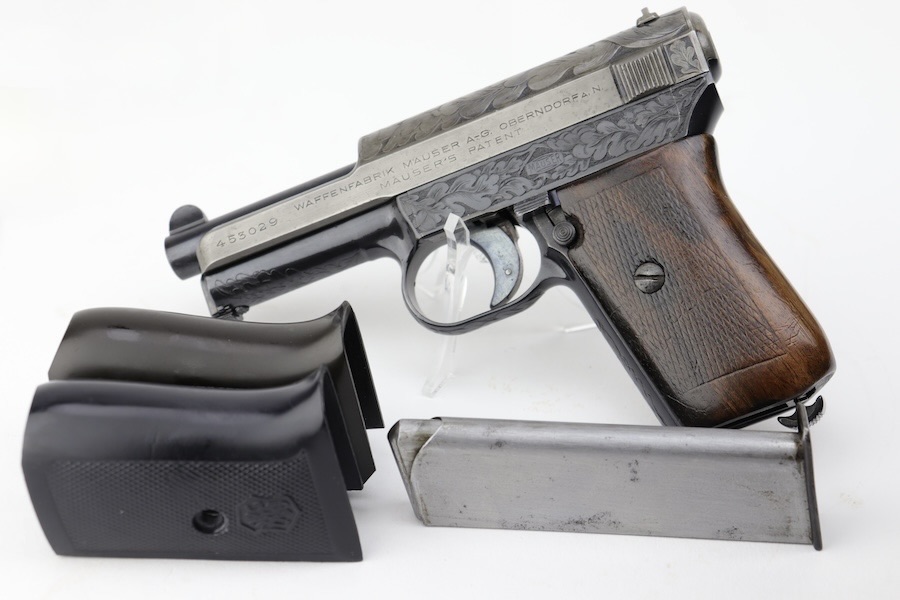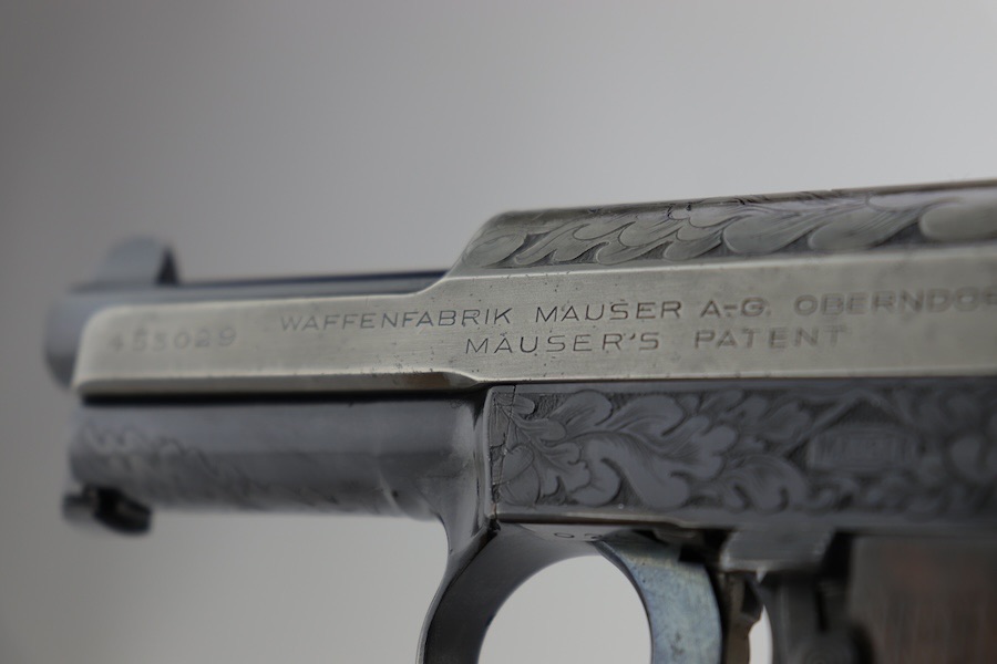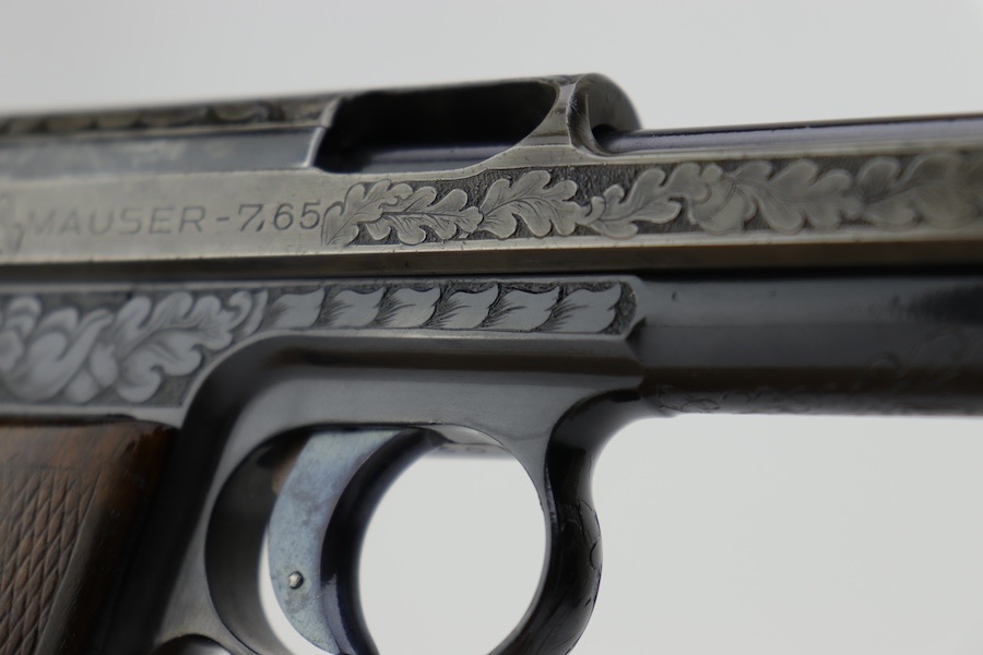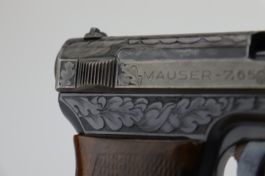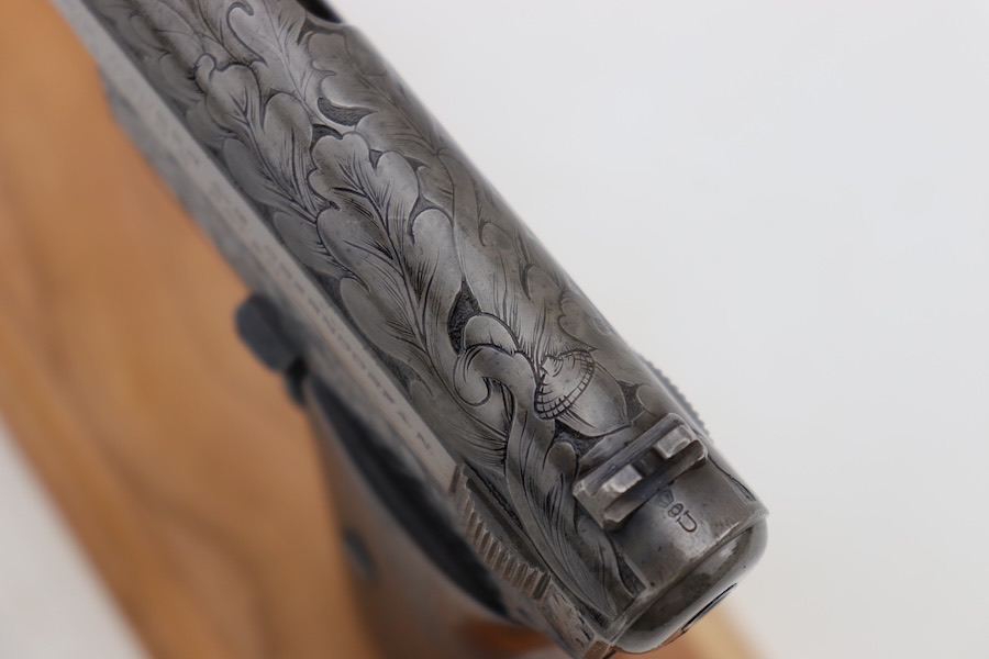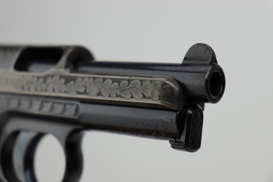 8/6/24 – This is a beautiful post factory hand-engraved Mauser 1914. This pistol features a blued barrel and fame with an oak leaf, acorn-style pattern, and a case-hardened French grey slide. With roughly 85% of the gun engraved, engraving can be seen on the slide, top of the frame on both sides, the front strap, trigger guard, the underside of the frame, the takedown piece under the muzzle, and the base plate of the magazine. The bore is quite clean and has great rifling. We rate the bore 8.5/10. The bluing finish has been skillfully restored; however, all of the fire bluing is original. All mechanical parts on the firearm are fully functional and work correctly. The pistol comes with three sets of grips and one correct magazine. Two of the grips are original, and one is reproduction. The reproduction grip is the first grip on the left side in the first picture.