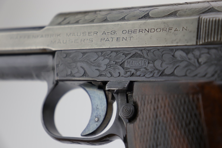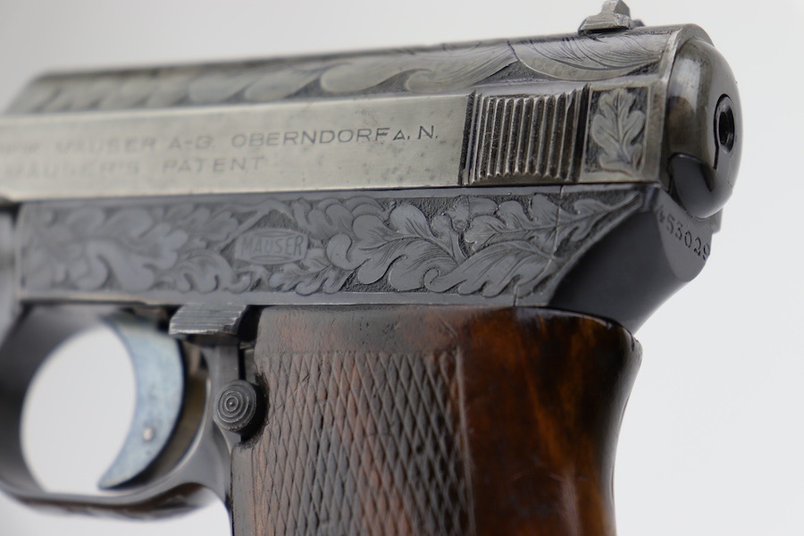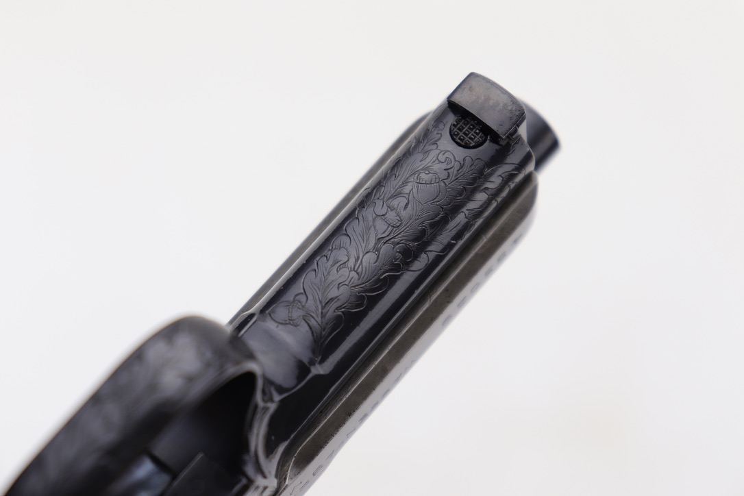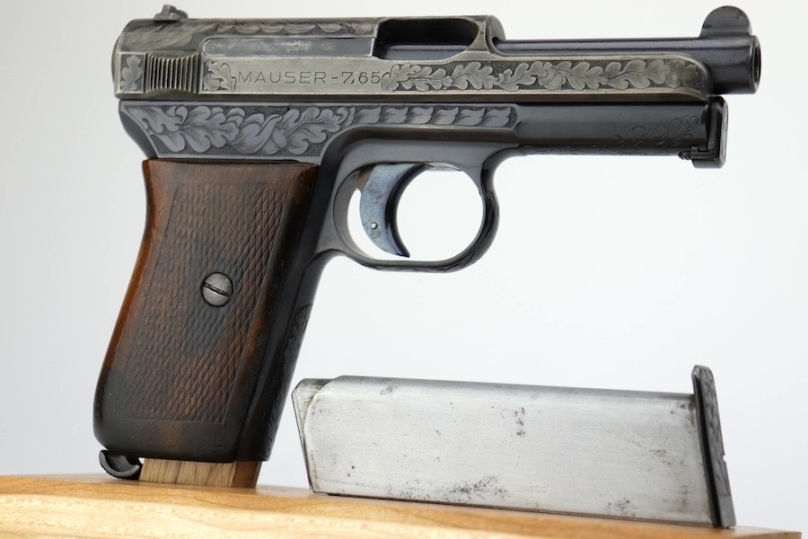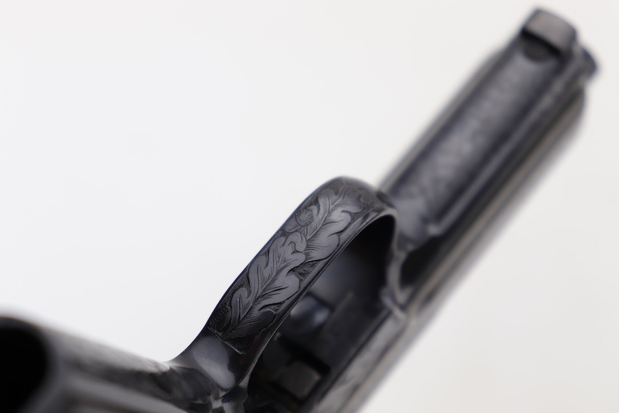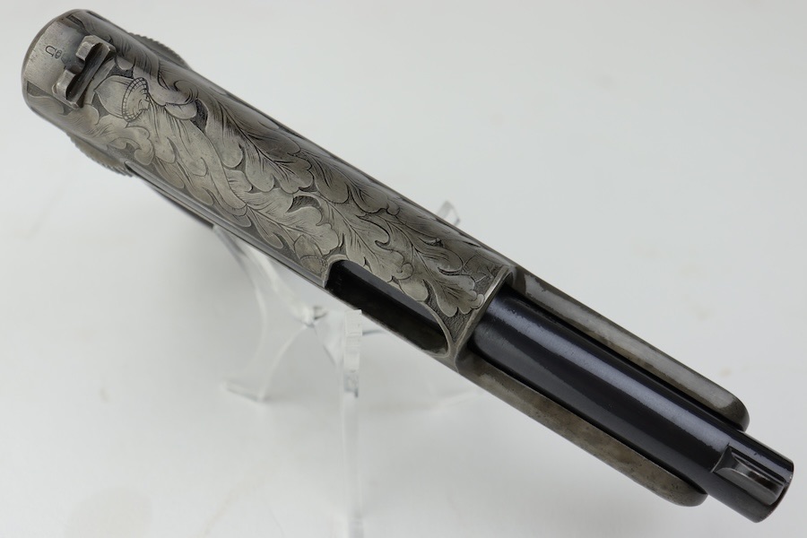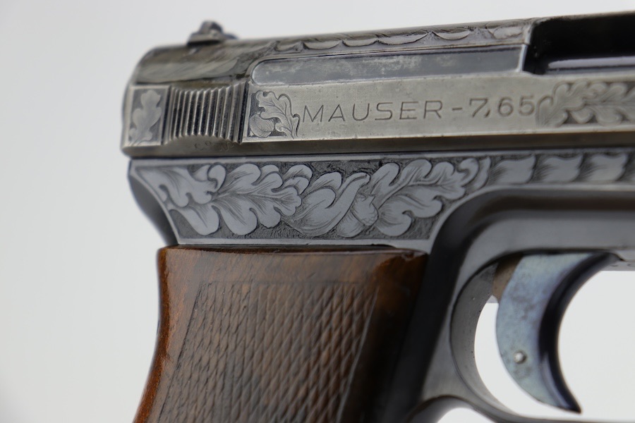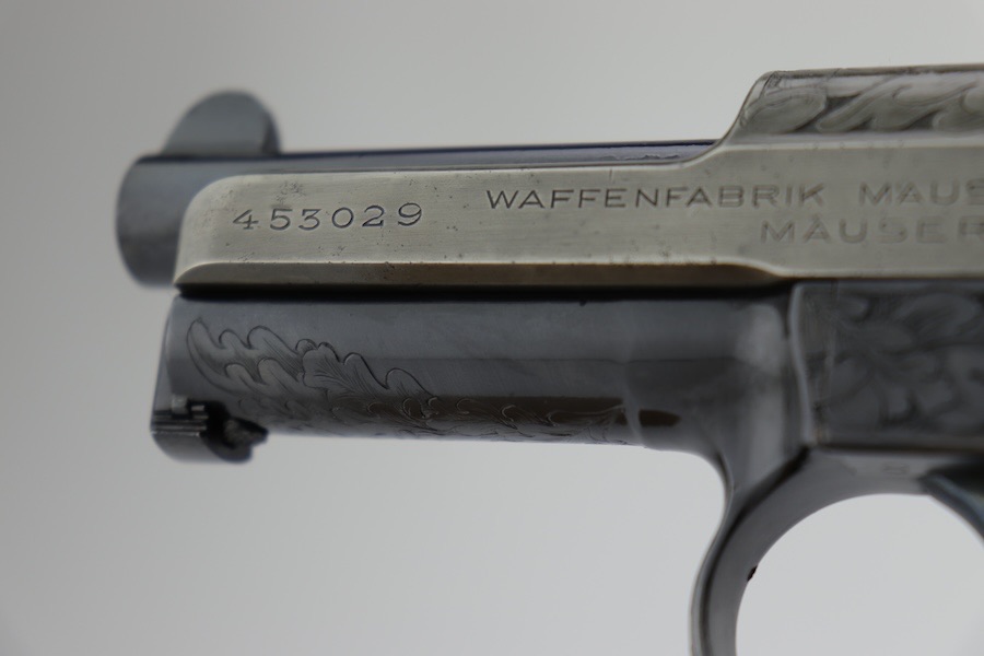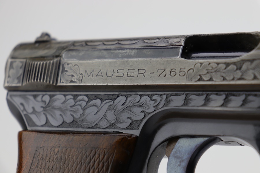 8/6/24 – This is a beautiful post factory hand-engraved Mauser 1914. This pistol features a blued barrel and fame with an oak leaf, acorn-style pattern, and a case-hardened French grey slide. With roughly 85% of the gun engraved, engraving can be seen on the slide, top of the frame on both sides, the front strap, trigger guard, the underside of the frame, the takedown piece under the muzzle, and the base plate of the magazine. The bore is quite clean and has great rifling. We rate the bore 8.5/10. The bluing finish has been skillfully restored; however, all of the fire bluing is original. All mechanical parts on the firearm are fully functional and work correctly. The pistol comes with three sets of grips and one correct magazine. Two of the grips are original, and one is reproduction. The reproduction grip is the first grip on the left side in the first picture.