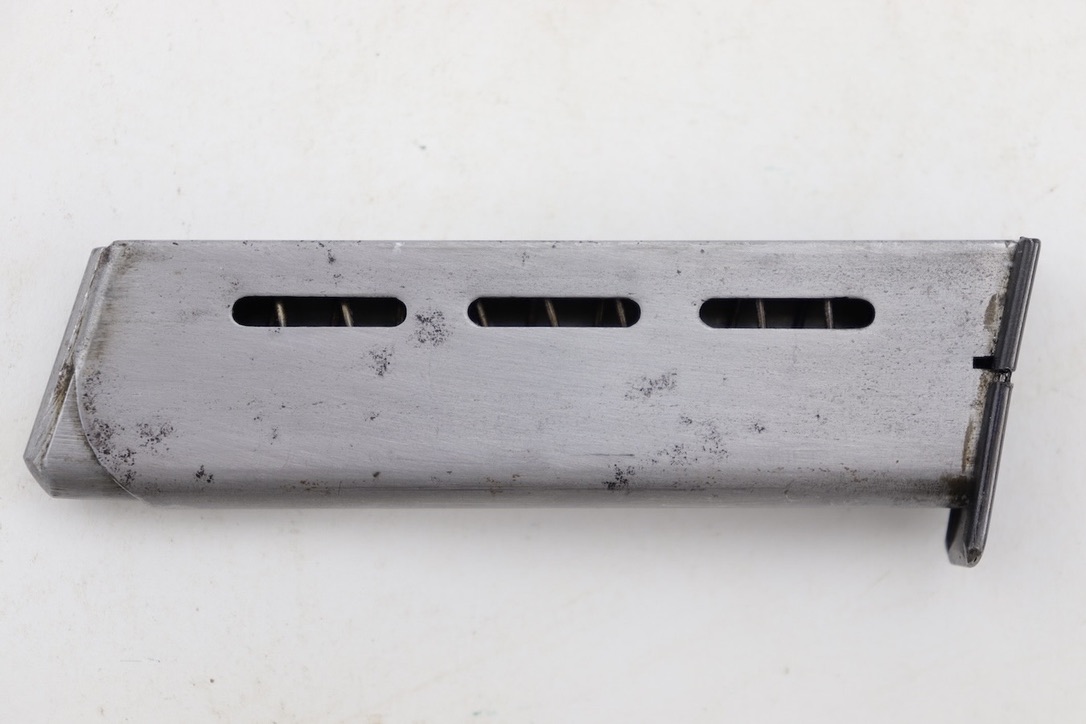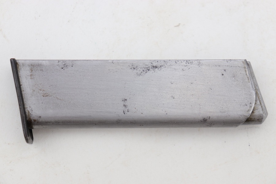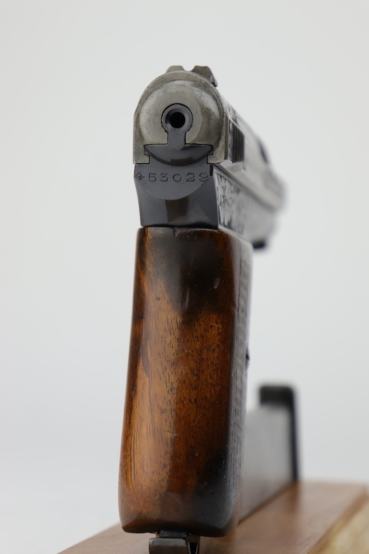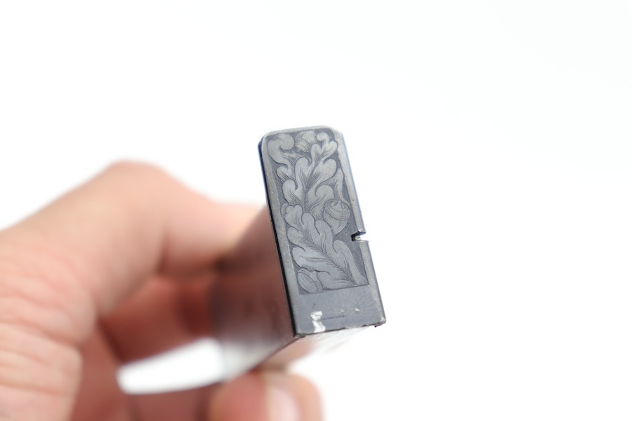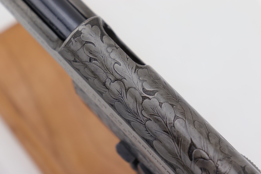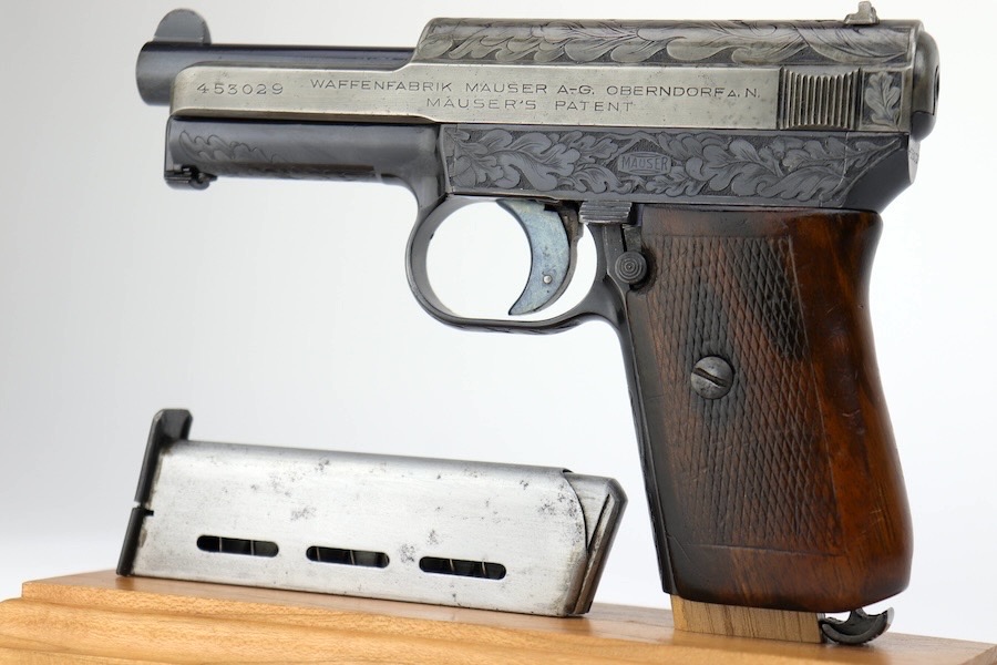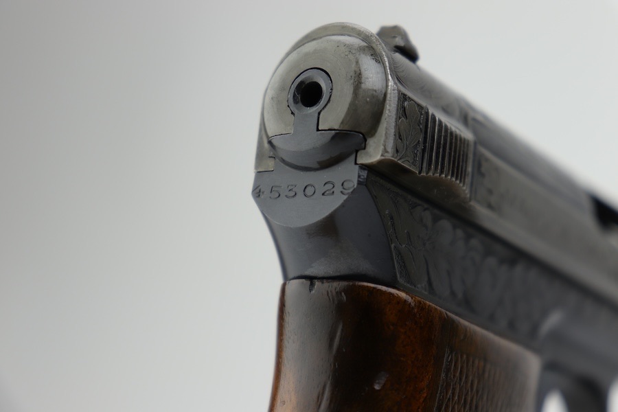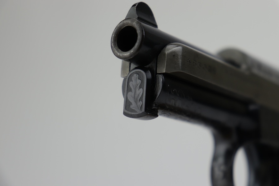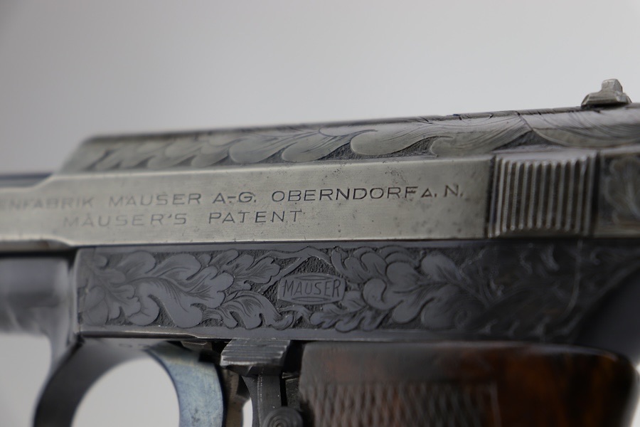 8/6/24 – This is a beautiful post factory hand-engraved Mauser 1914. This pistol features a blued barrel and fame with an oak leaf, acorn-style pattern, and a case-hardened French grey slide. With roughly 85% of the gun engraved, engraving can be seen on the slide, top of the frame on both sides, the front strap, trigger guard, the underside of the frame, the takedown piece under the muzzle, and the base plate of the magazine. The bore is quite clean and has great rifling. We rate the bore 8.5/10. The bluing finish has been skillfully restored; however, all of the fire bluing is original. All mechanical parts on the firearm are fully functional and work correctly. The pistol comes with three sets of grips and one correct magazine. Two of the grips are original, and one is reproduction. The reproduction grip is the first grip on the left side in the first picture.