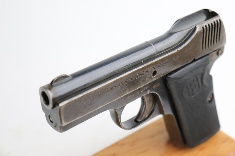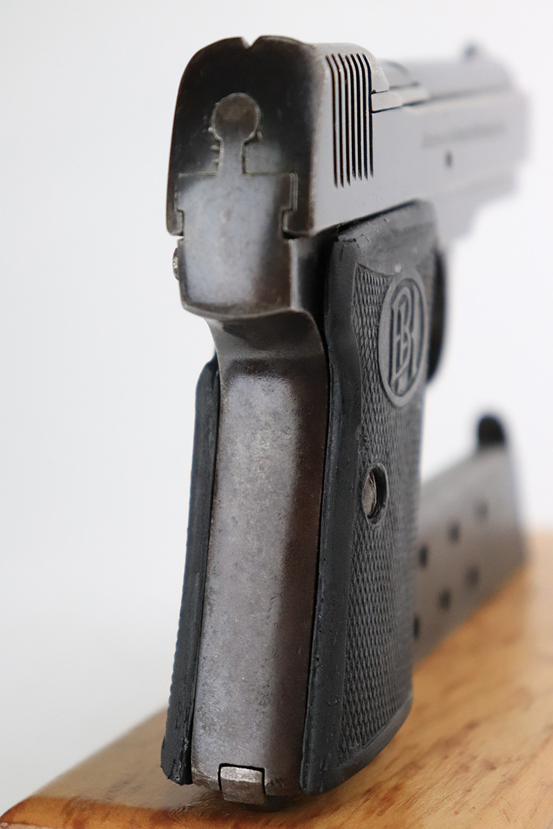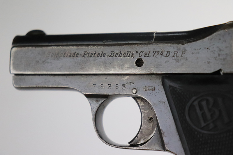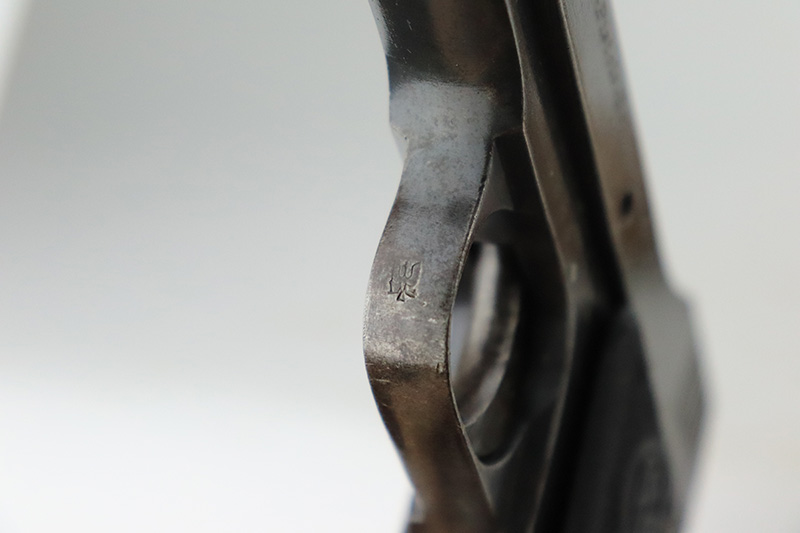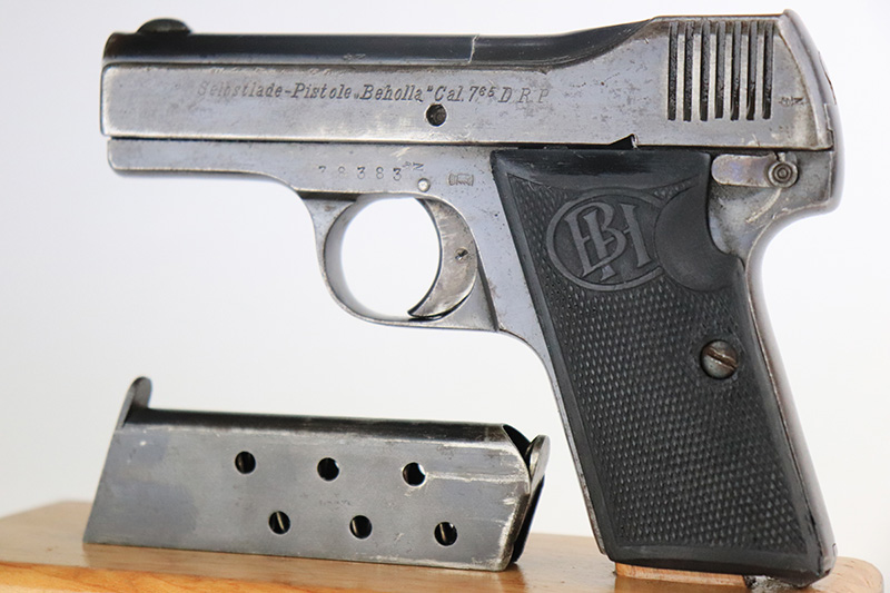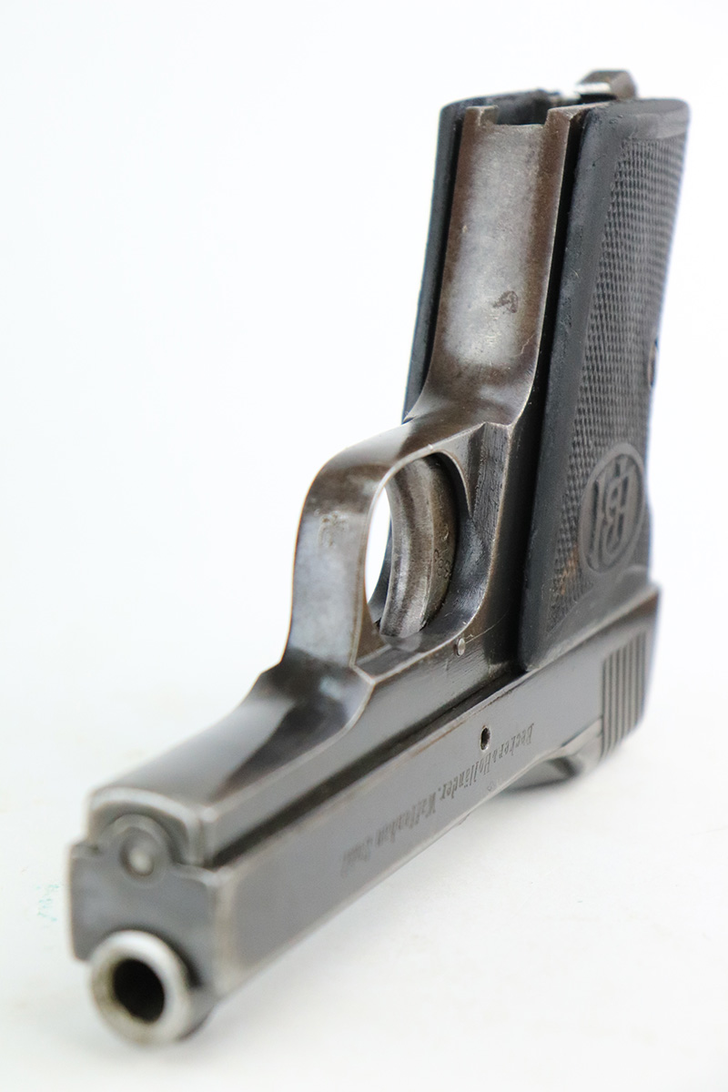 8/26/22 – This is a nice example of a Becker & Hollander Beholla pistol issued to the Imperial German army during WW1. It is all matching, has “Crown N” proofs, an Imperial proof on the left side of the frame, and has a German eagle on the trigger guard. The gun has retained roughly 85% of its original finish. Generally, there is wear around the muzzle and high edges. Some areas of wear on the left side of the slide and frame. Minor thinning on the front strap. Brown patina on the back strap. There is obvious spotty oxidation throughout. It comes with one proper magazine and a set of reproduction black plastic grips. The bore is nice with good rifling.
