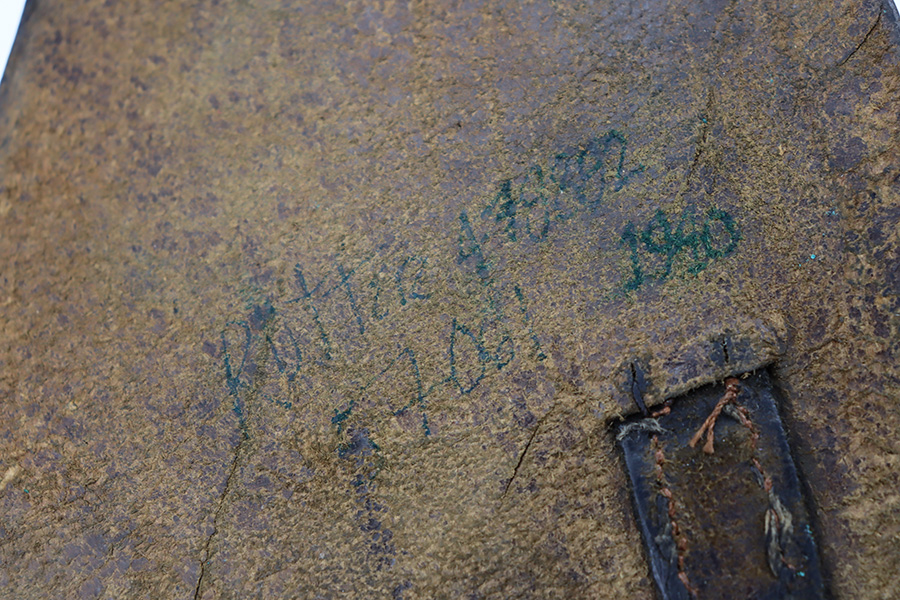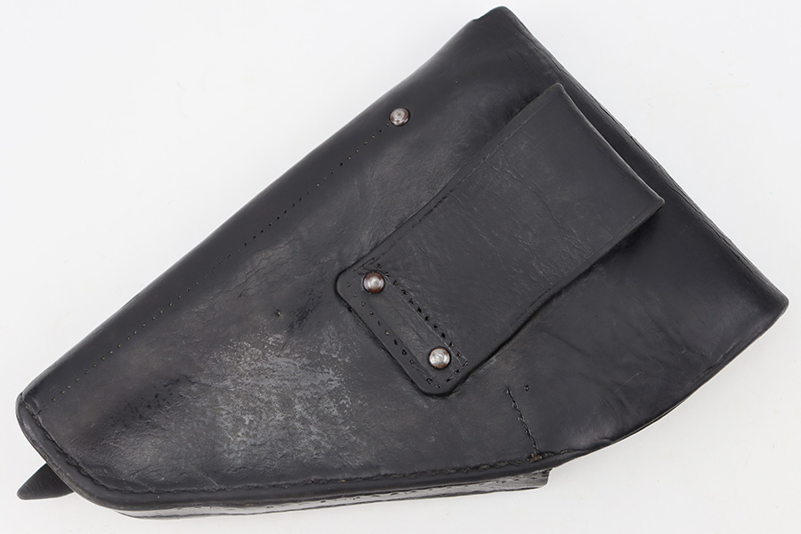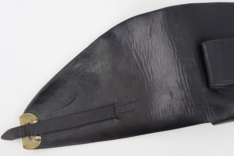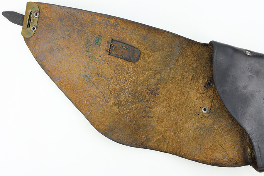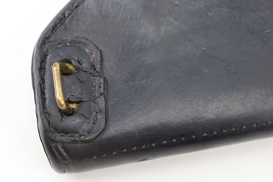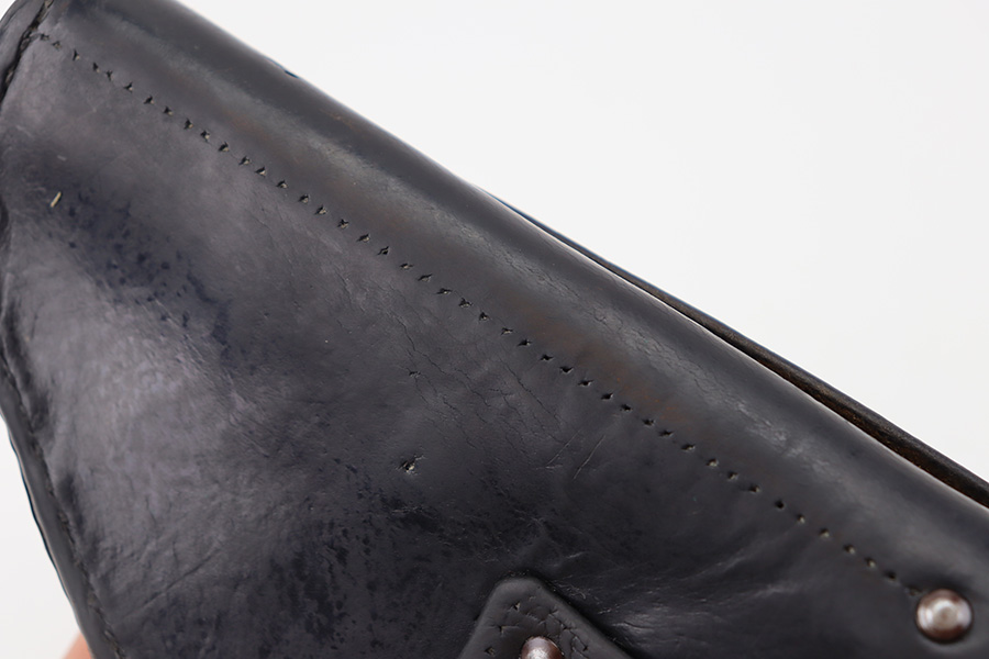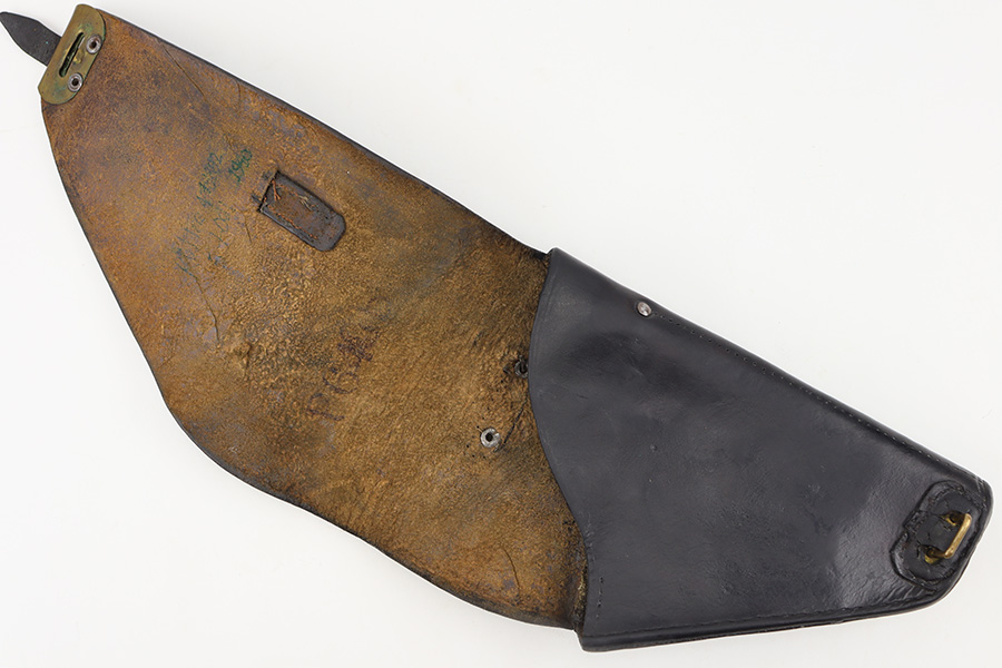 11/28/23 – This is a Belgian style FN Browning High Power holster. Likely pre-WW2 production before the German invasion in 1940. The holster is in very good overall condition with pliable leather and some typical surface wrinkling. The interior leather has some writing from previous owners. No markings or stamps. Features an internal mag pouch, which is still intact. The back leather shows some loose / missing threads, but this doesn’t affect functionality. Priced accordingly.