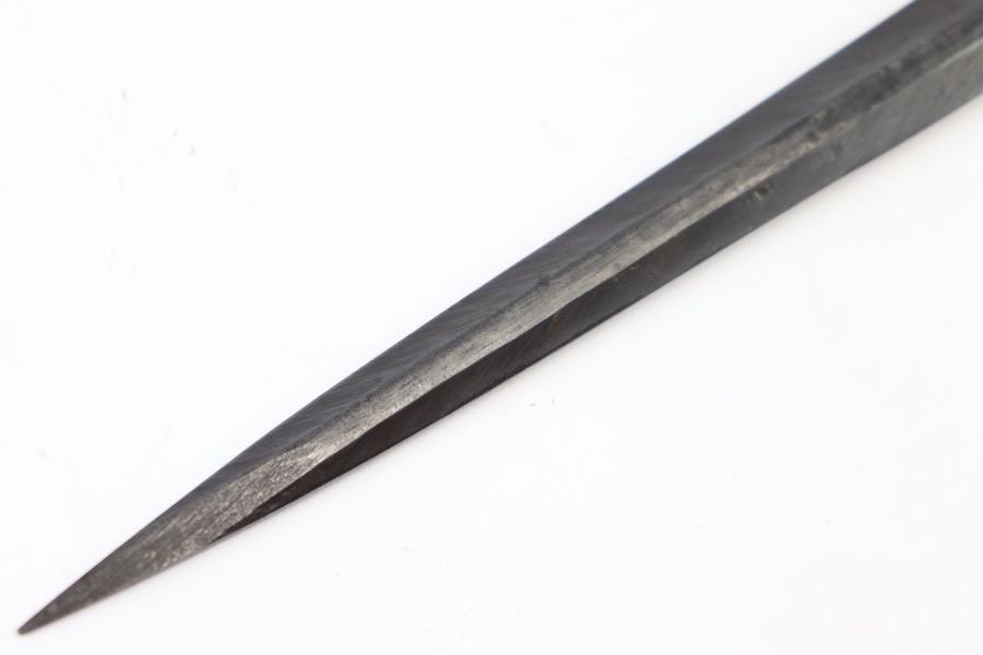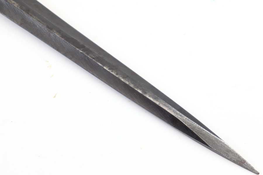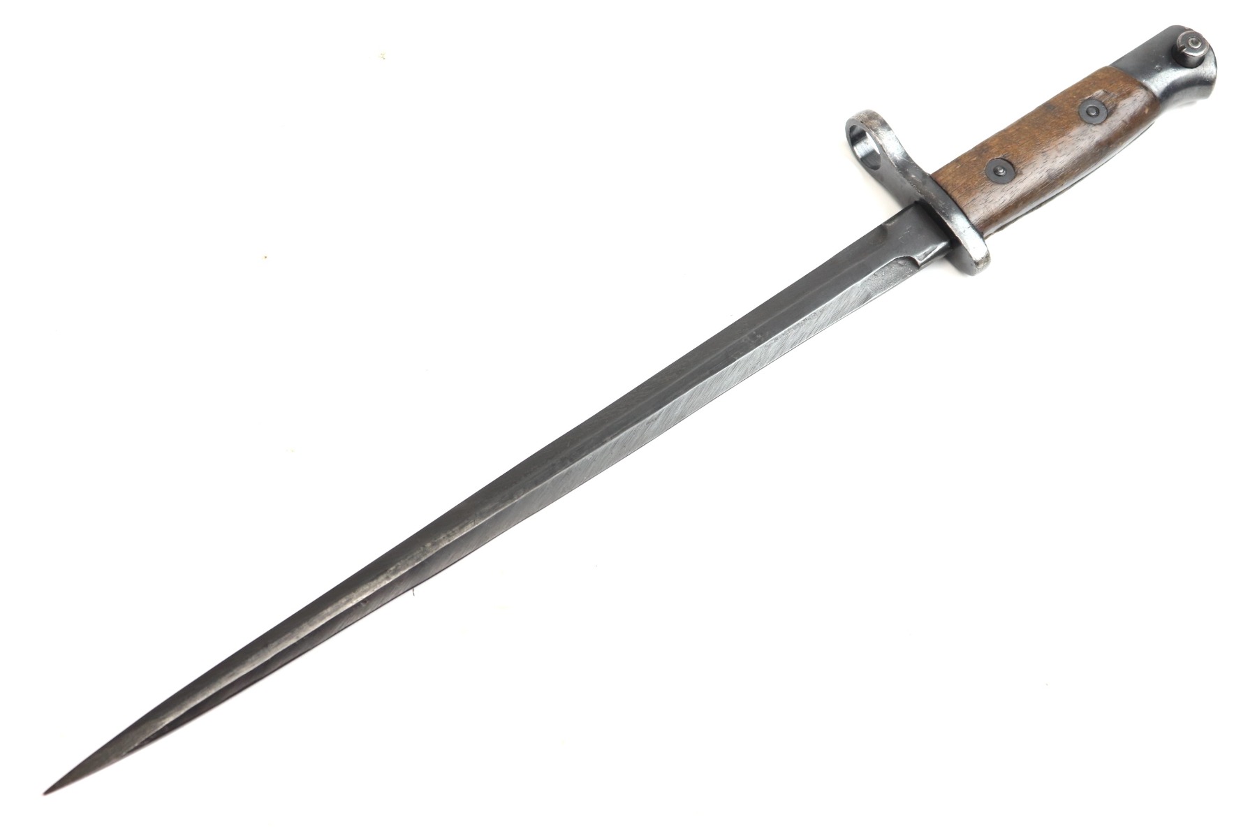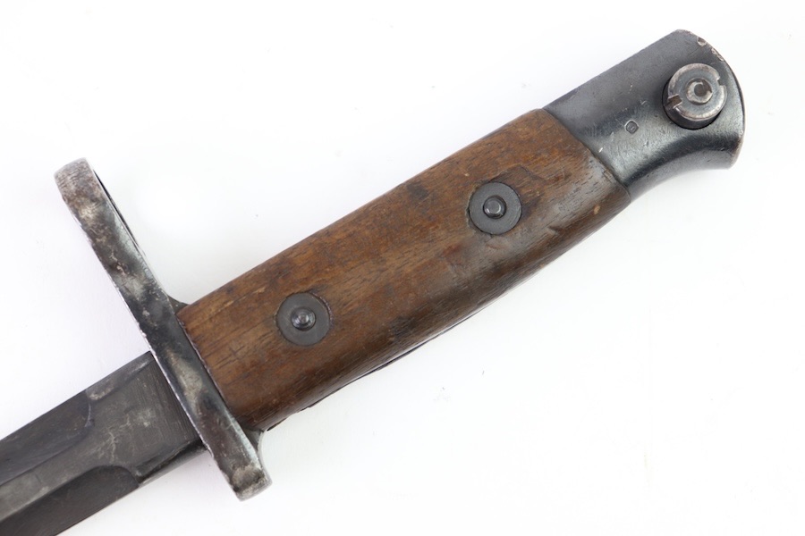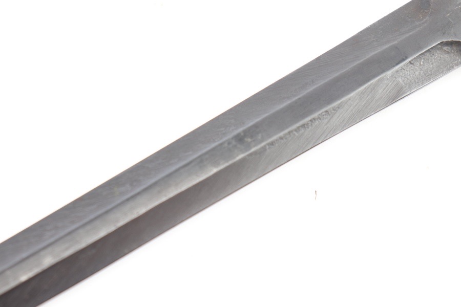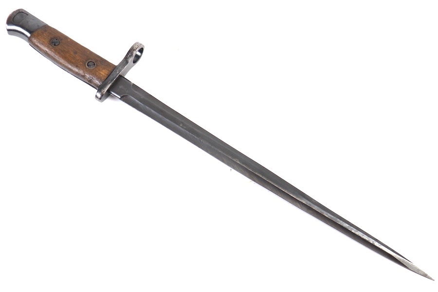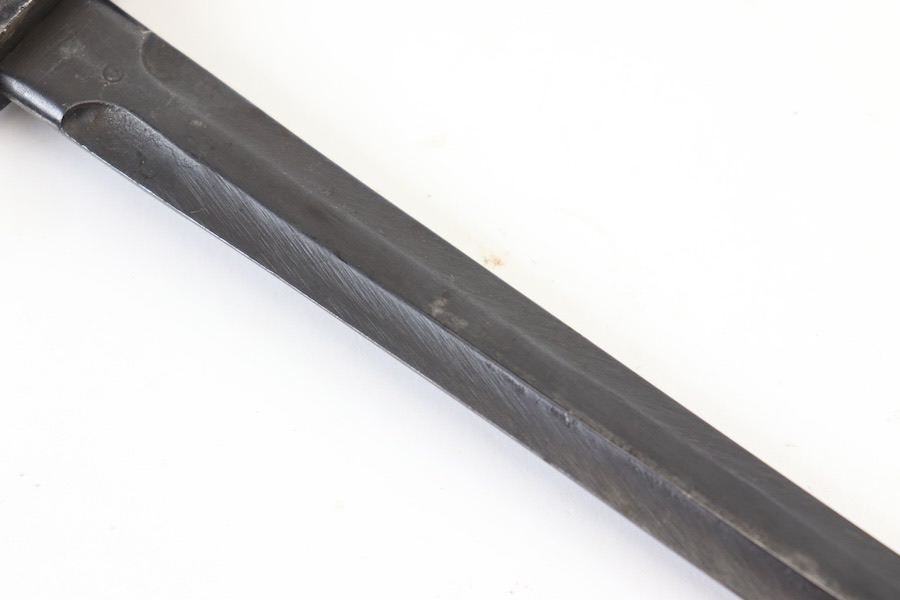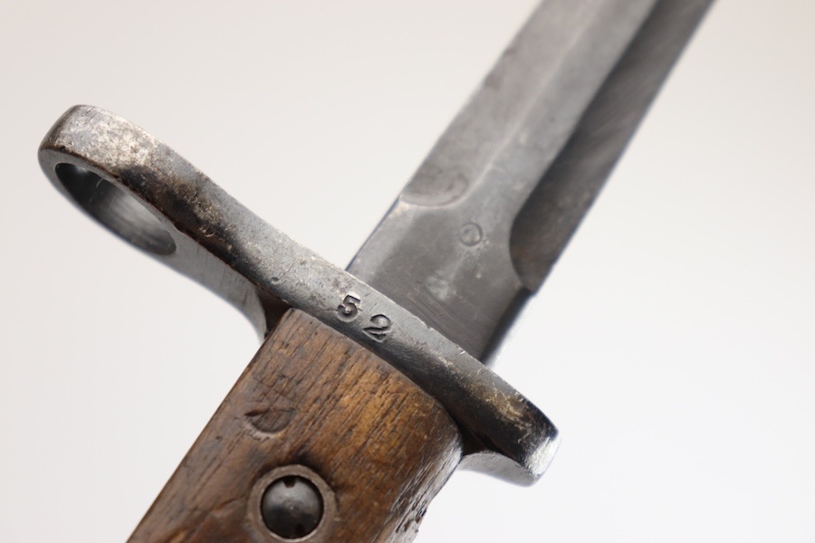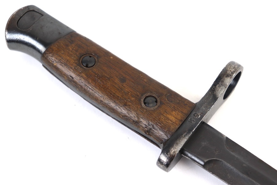 10/3/23 – This is a great and original condition 1916 Gras rifle bayonet from Belgium. The blade is reasonably clean, with no rust or pitting. Neither edge has been sharpened. Ricasso has a circle with what is supposed to be an H but is too worn to tell. The crossguard and pommel have spots of finish loss with no surface rust. The grips have handling marks and show storage aging with no significant wear. No scabbard included.