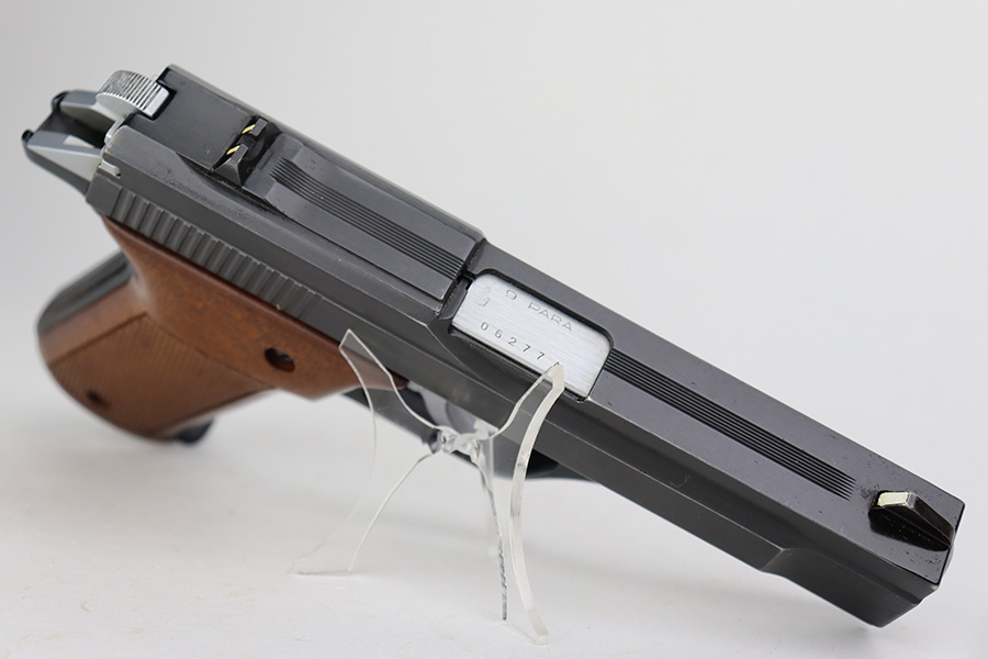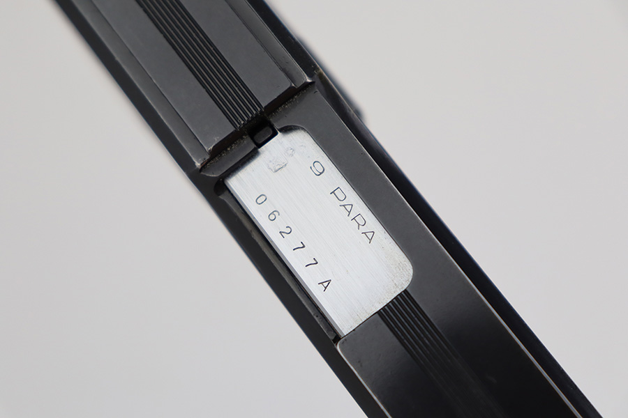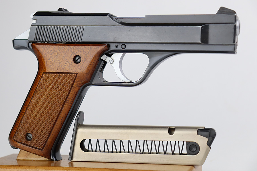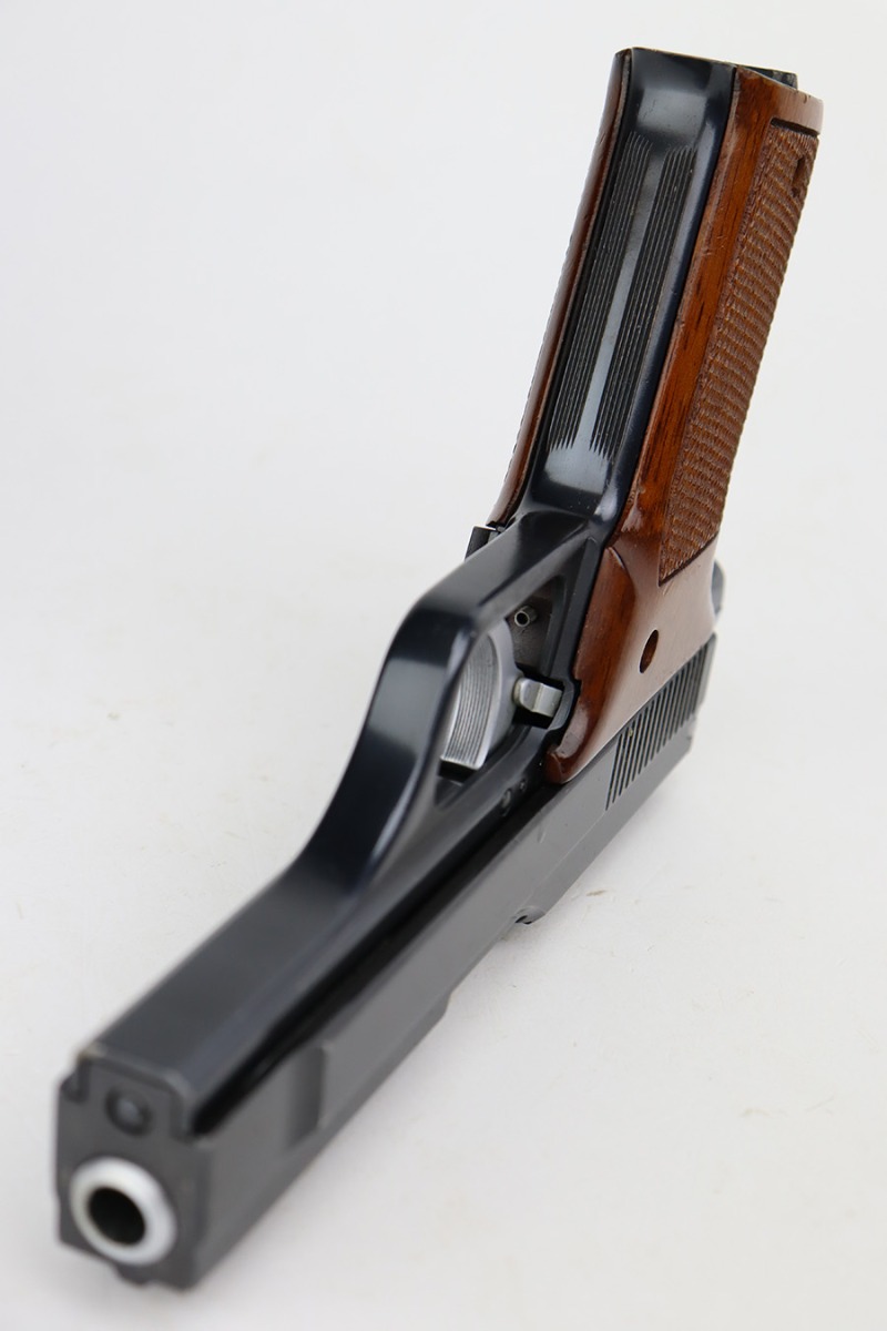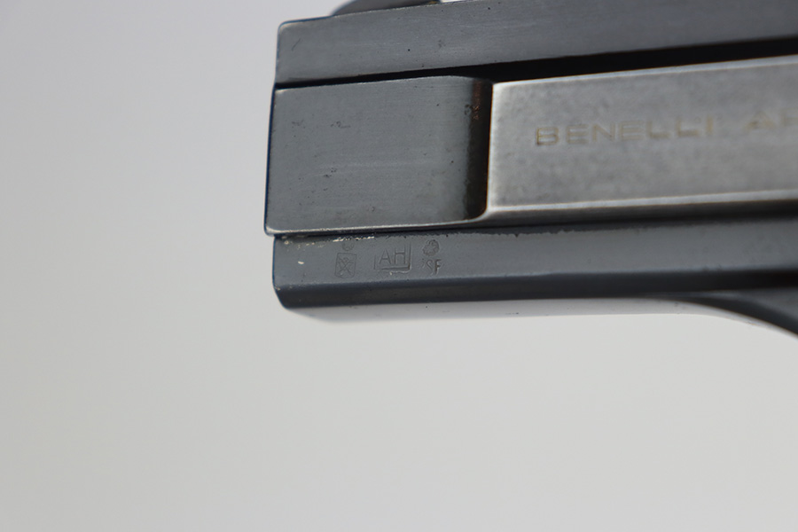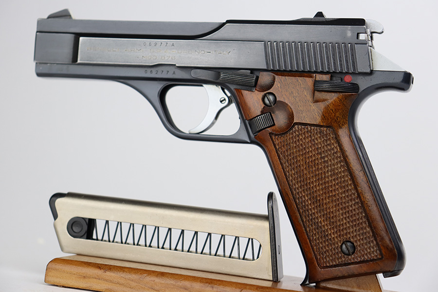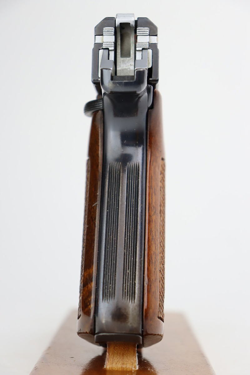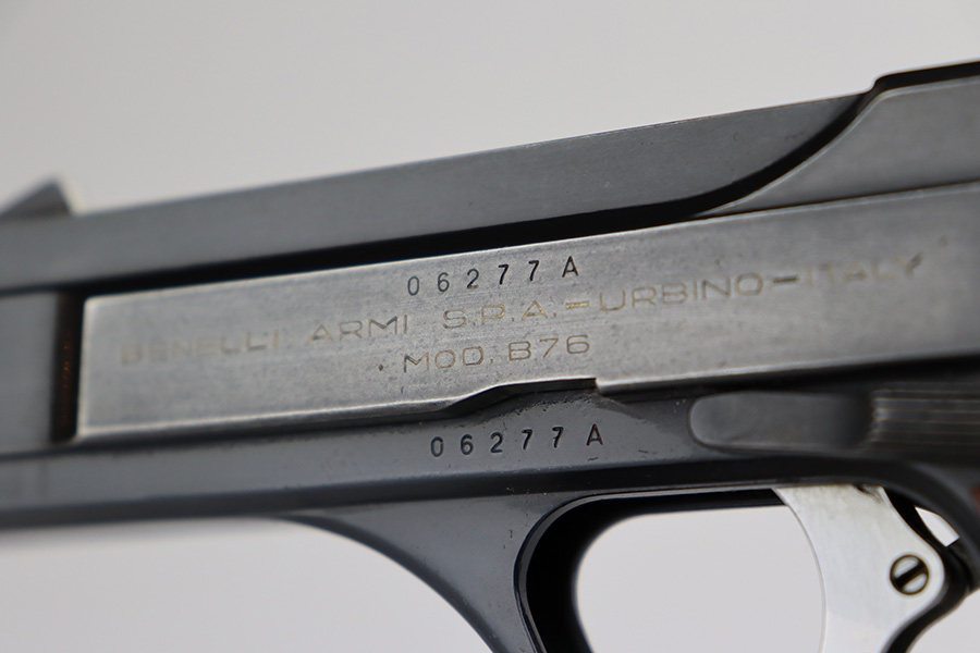 8/7/23 – This is a very nice example of a Benelli B76 pistol from 1981. First manufactured in 1976, the Benelli B76 is a locked-breech, fixed-barrel semi-automatic handgun. The B76’s trigger is of a double-action/single-action type and the firearm works thanks to a unique “inertia lock” system. This one has retained somewhere between 85-90% of its original high polish finish with minor general high edge wear and thinning on both sides of the slide. Fitted with very nice wood grips – just a few tiny dings on both sides. Comes with one proper magazine. Like-new bore. The action is extremely smooth.