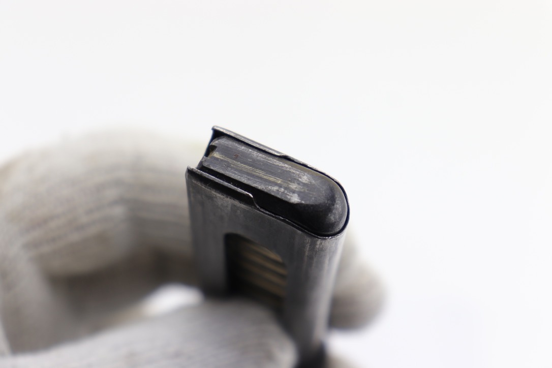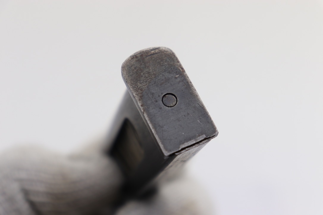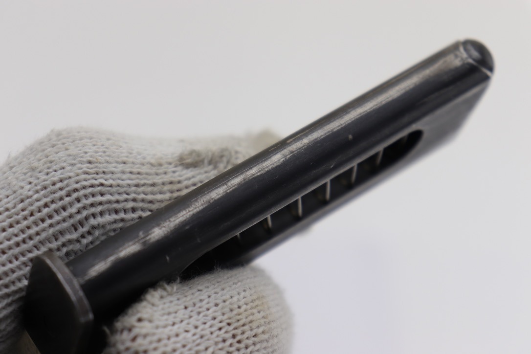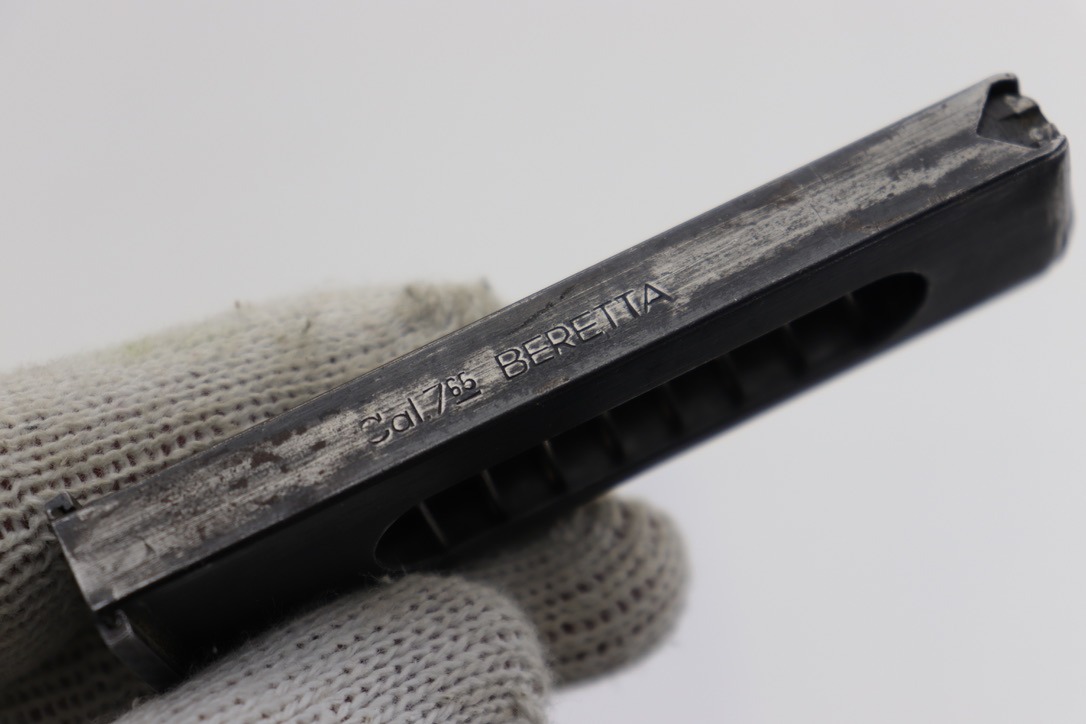 10/30/24 – For sale is an original production Beretta 1935 magazine. This magazine has normal finish wear throughout, mainly on the spine and near the feed lips. Spring has excellent retention and smooth operation. The spine is marked Cal 7.65 Beretta. This mag has the flat bottom instead of the pinky extension. Great overall condition.