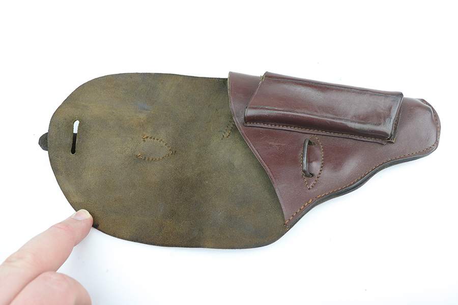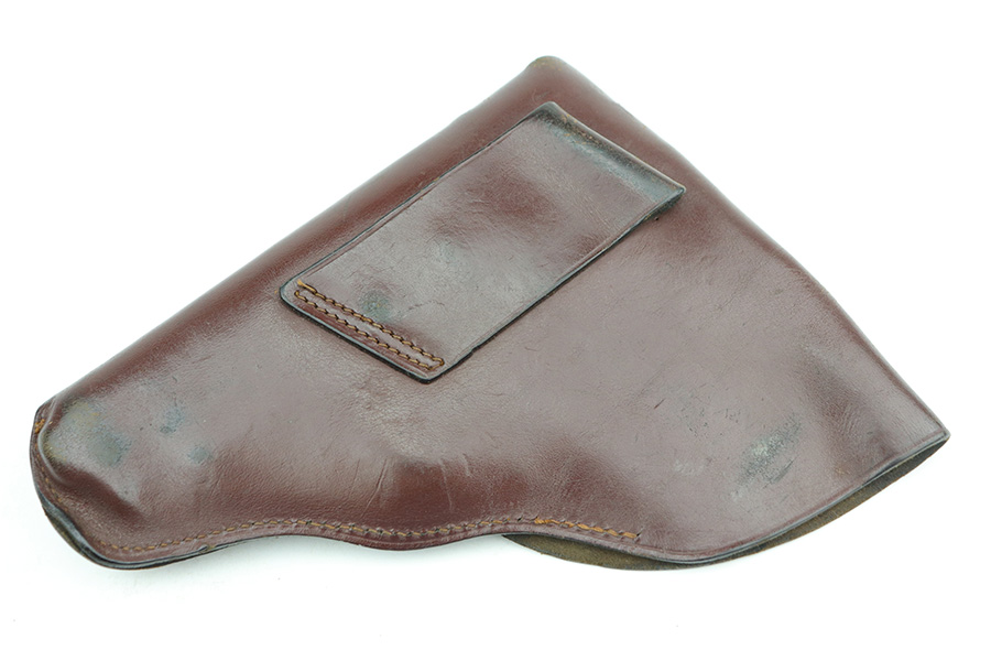 9/20/21 – This is a brown leather holster, most likely for a Beretta M1934 or M1935. We believe this is an early Italian production due to the style of leather and stitching. There are no markings on the holster, and overall the holster is in great condition with normal signs of previous use and some mild aging. No stitching issues.