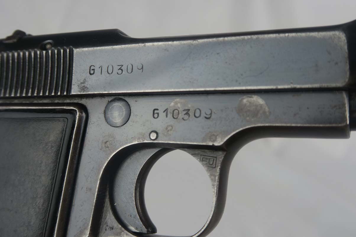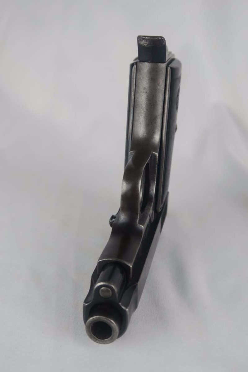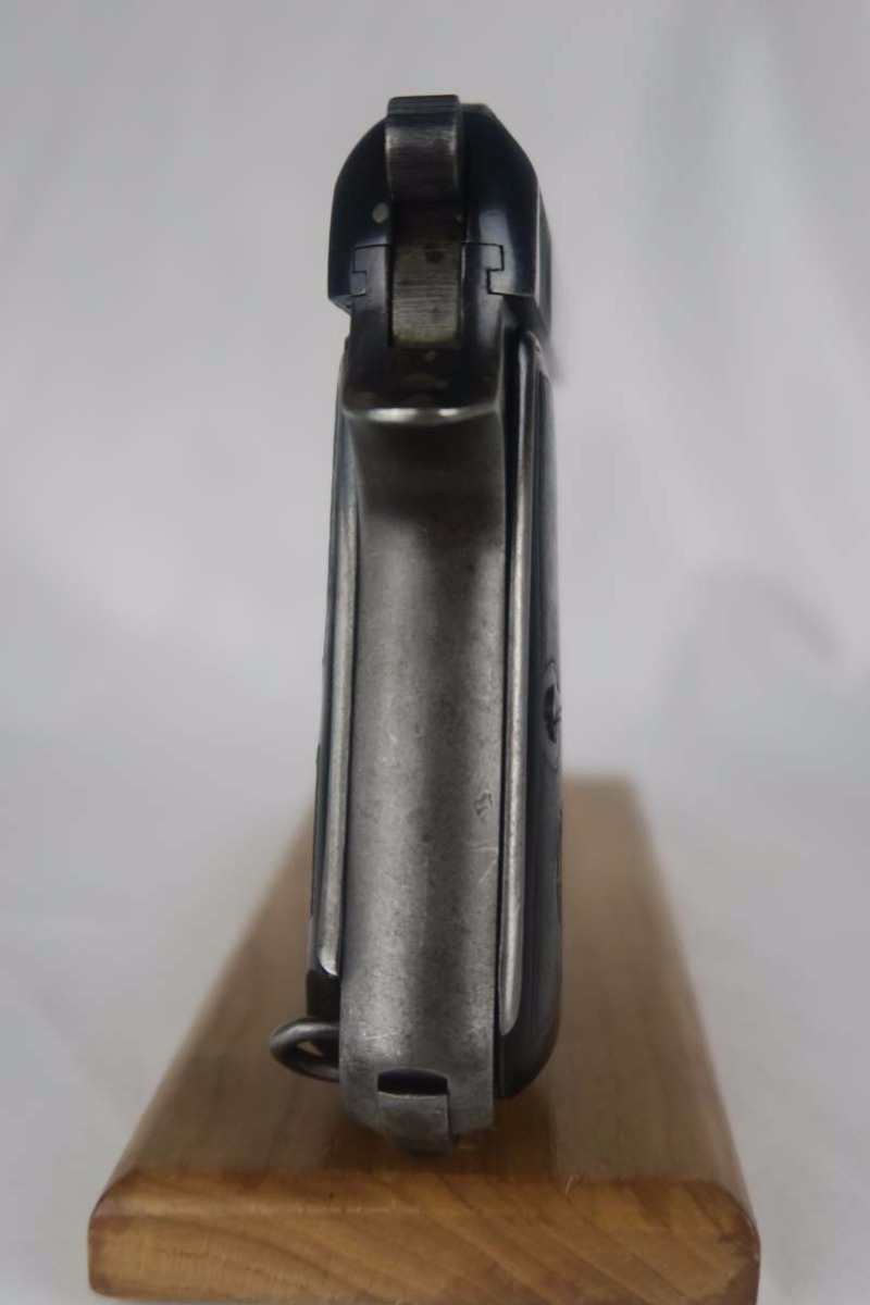10/3/17 – This is a Beretta M1934 in 9mm, and is marked ‘RE’ (Regio Esercito) on the rear left frame to denote use by the Italian Army.  The original finish rates at about 85%, with some wear on the slide but more notably very thin straps.  Late war pistol with no slide legend.  Proper magazine and grips.  Good bore with minor frosting but no pits.
