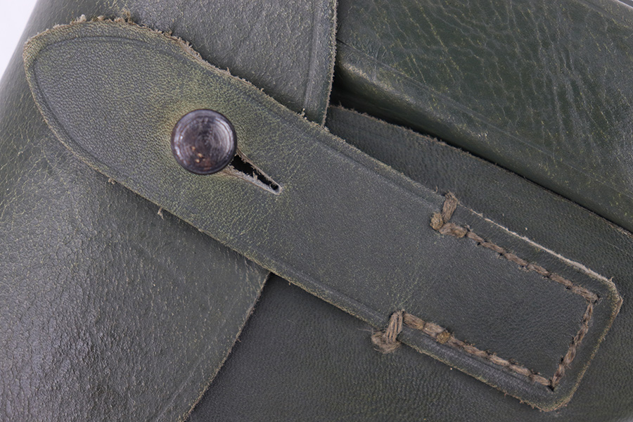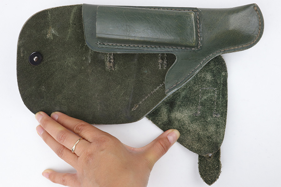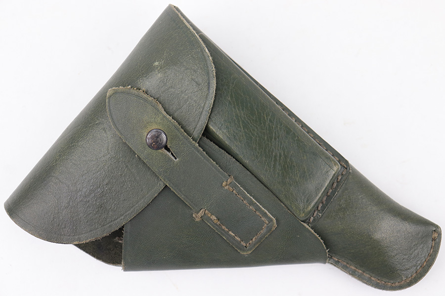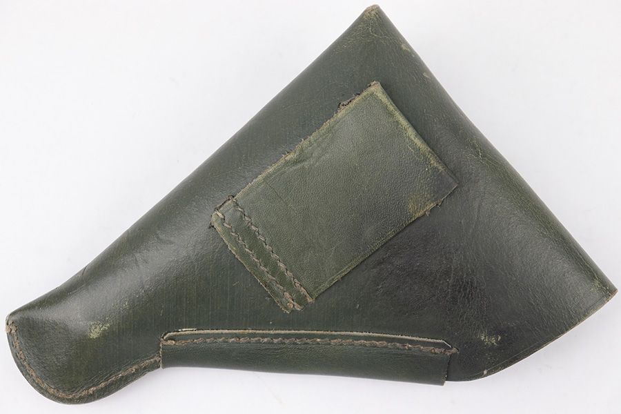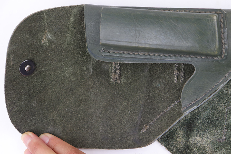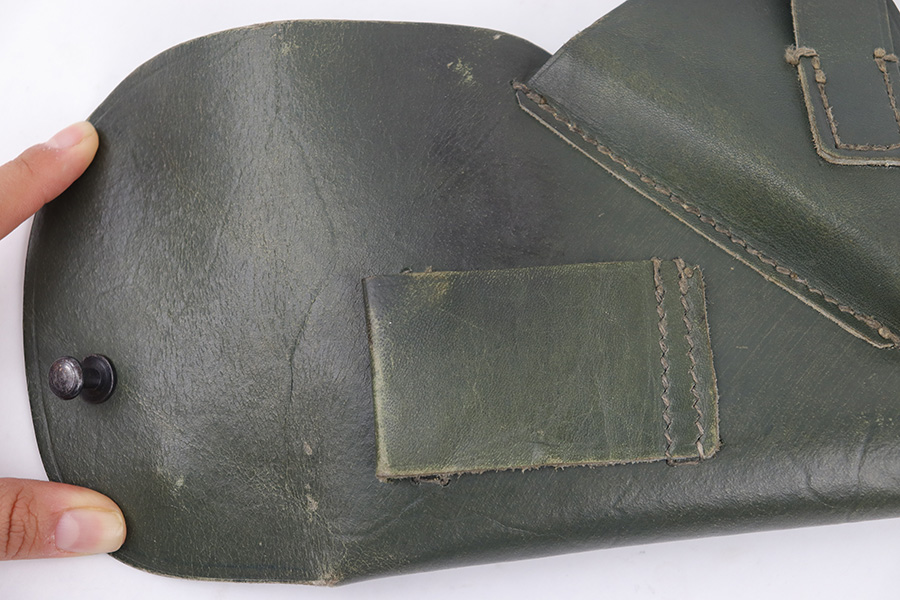 6/6/23 – This is an unmarked green leather holster for a Beretta model 1934/1935, or for a Walther PP. These holsters are most commonly believed to be Italian made for the Beretta, however we’ve seen other examples of this style holster paired with Walther PP pistols as part of the German “forestry police”. The holster is in near-excellent condition with some light use wear and surface aging but no major issues. All original leather and stitching.