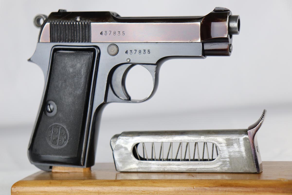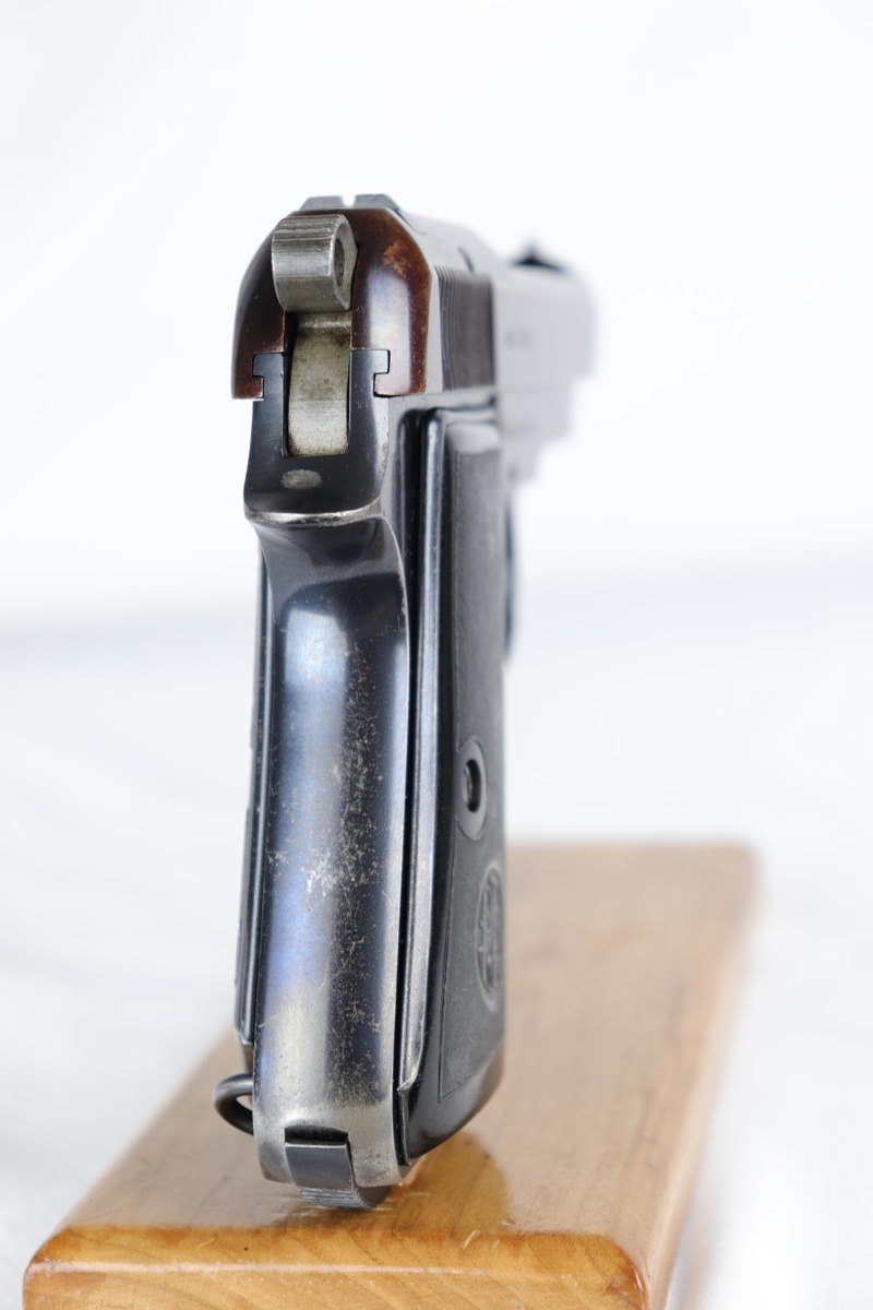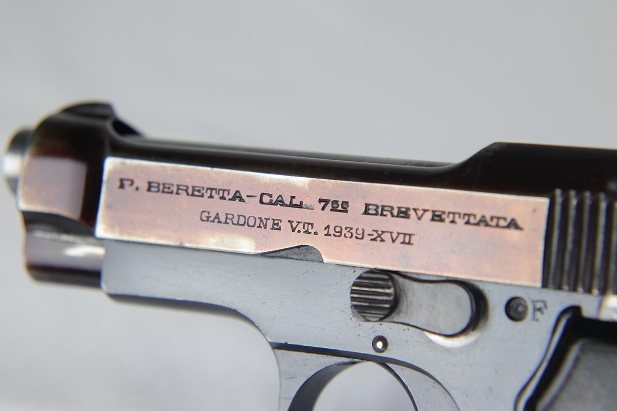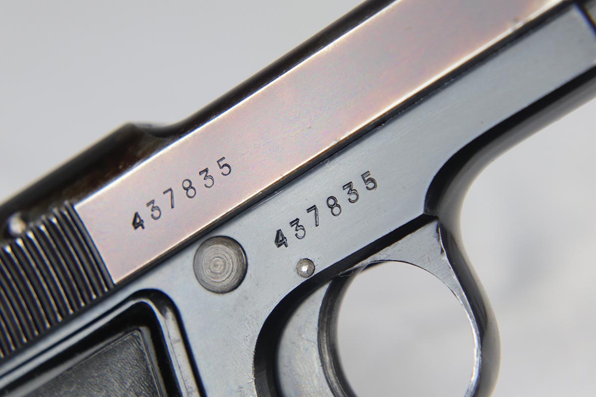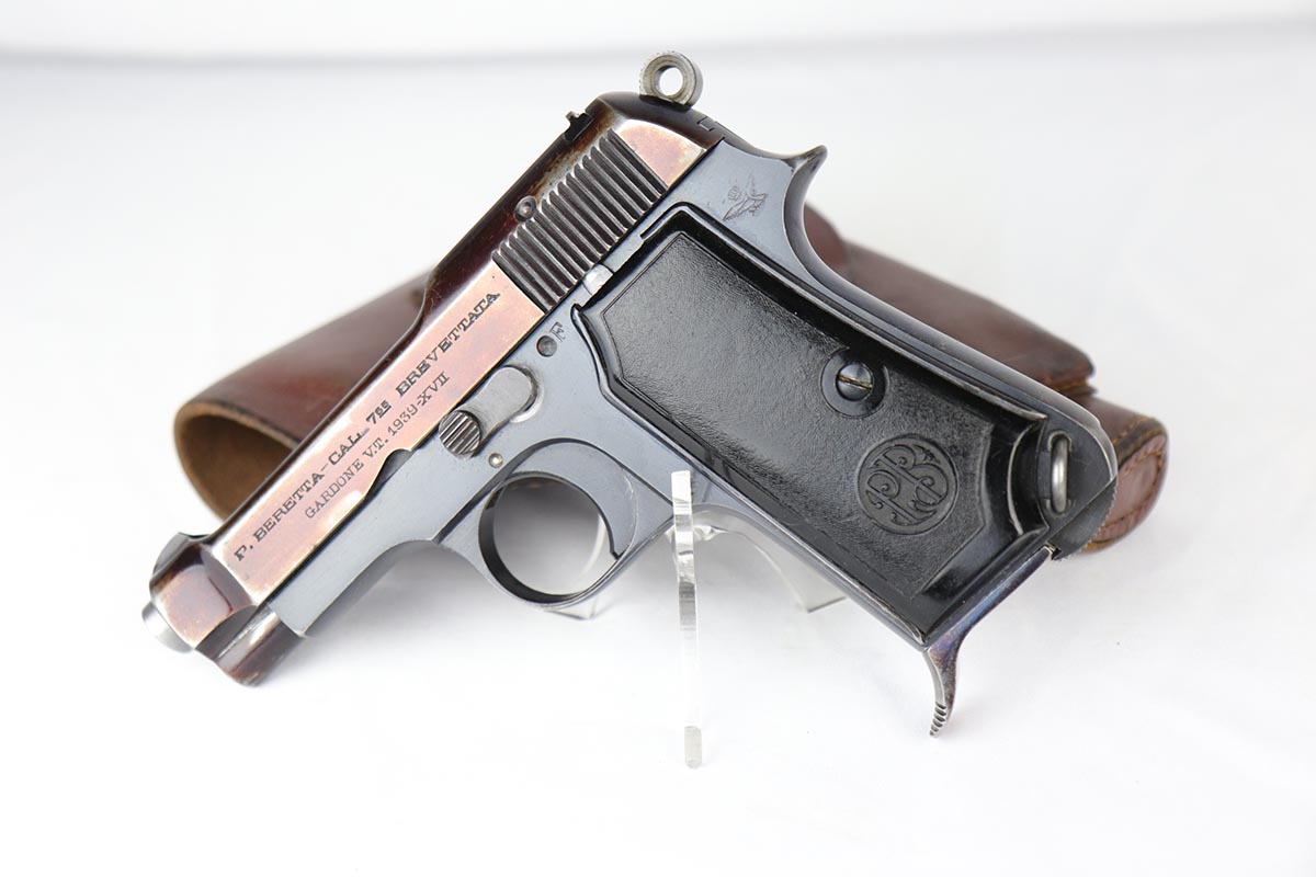 6/19/18 – This is an Italian Air Force issued Beretta M1935 that was manufactured in 1939. This pistol features a nice dual-tone slide and frame, with reddish slide finish contrasted against the polished blue frame. The overall finish rates at about 90% with an excellent frame but some thinning throughout the slide. The pistol comes with a period correct holster and has a minty bore.
