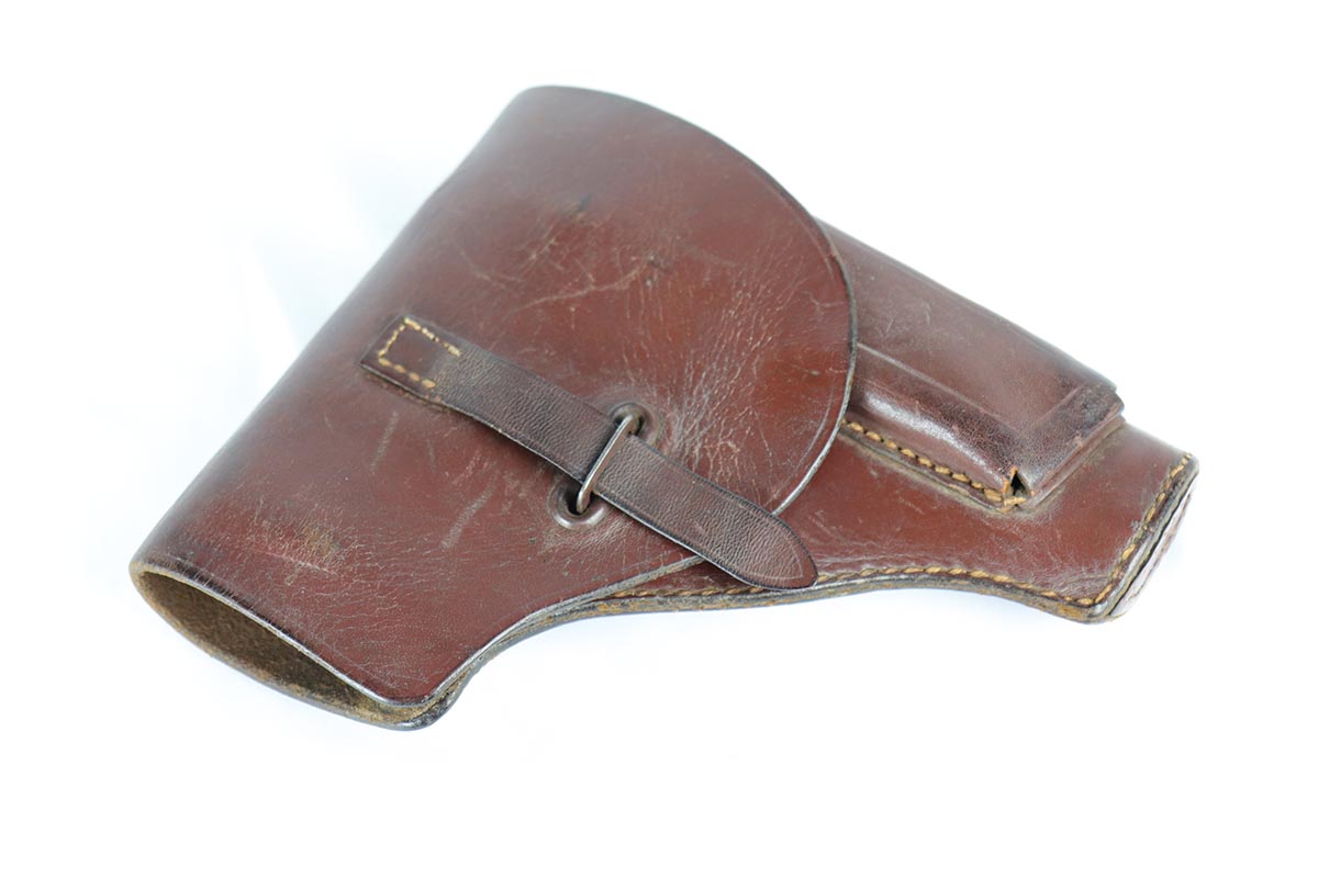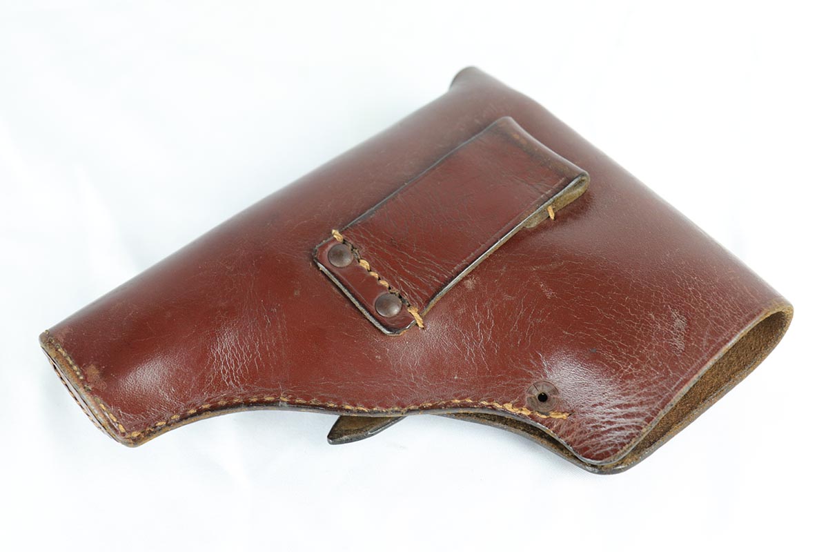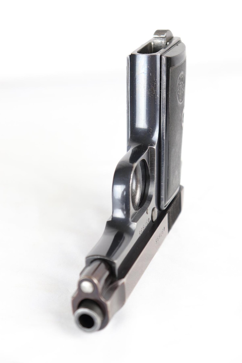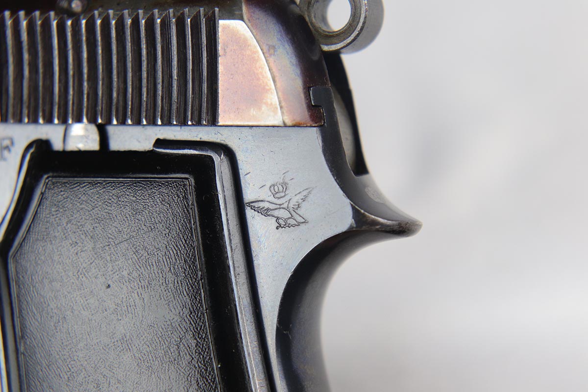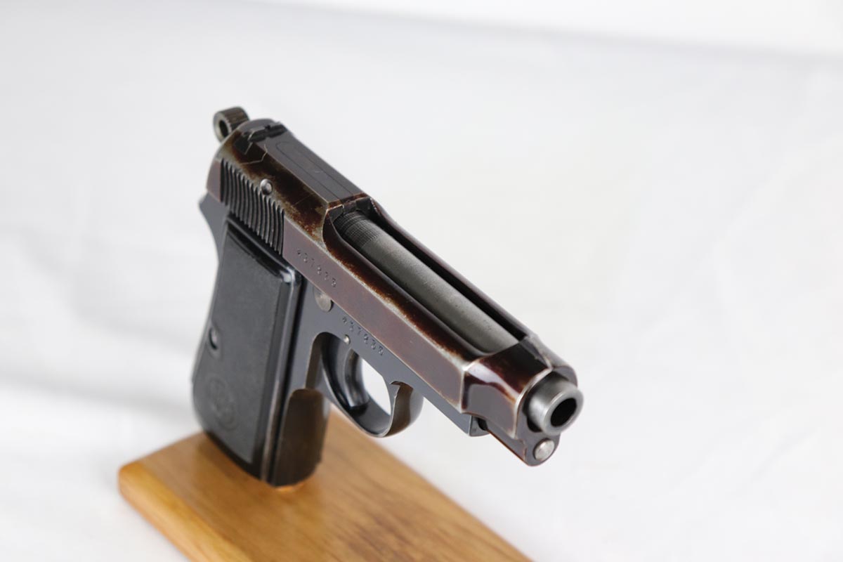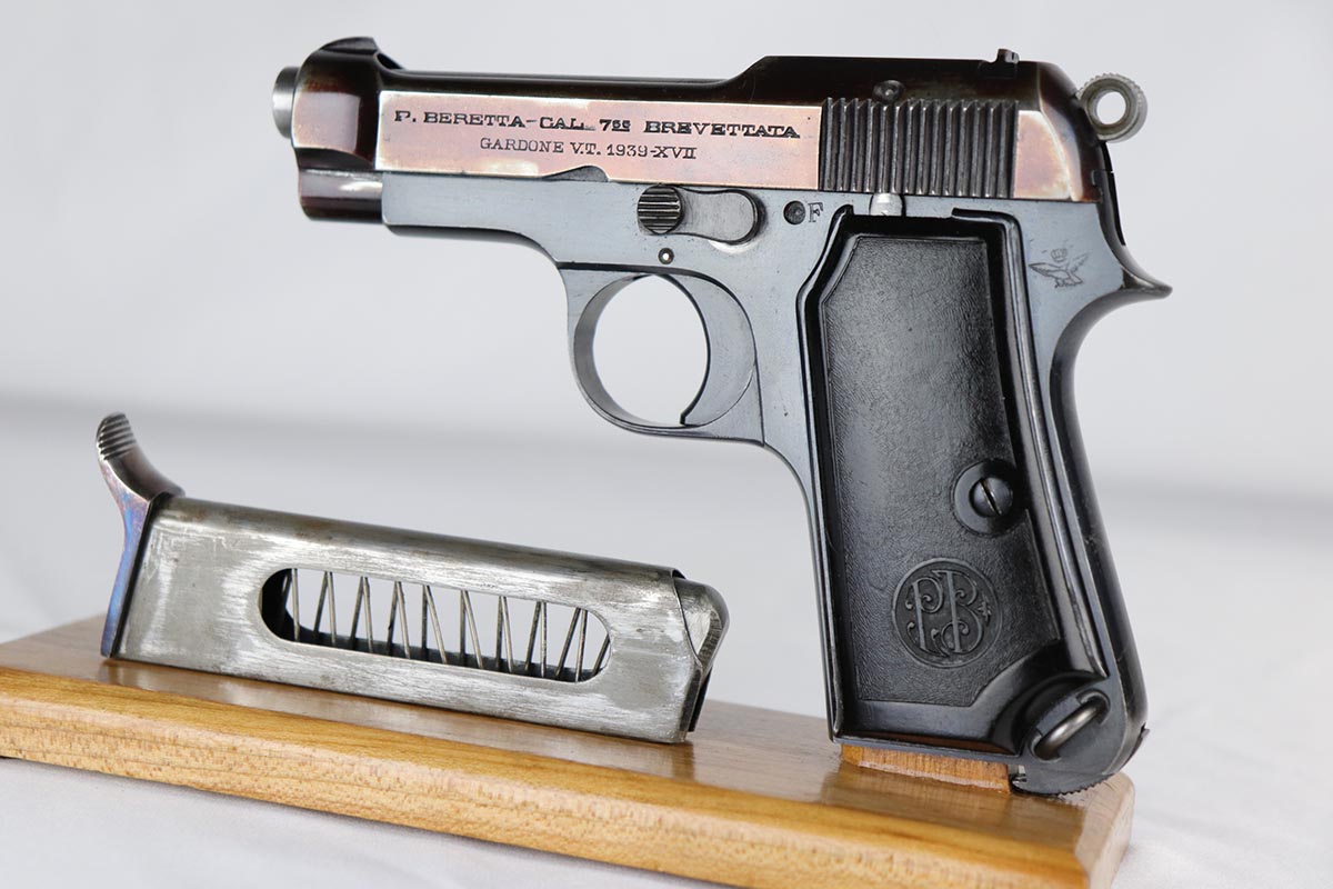 6/19/18 – This is an Italian Air Force issued Beretta M1935 that was manufactured in 1939. This pistol features a nice dual-tone slide and frame, with reddish slide finish contrasted against the polished blue frame. The overall finish rates at about 90% with an excellent frame but some thinning throughout the slide. The pistol comes with a period correct holster and has a minty bore.