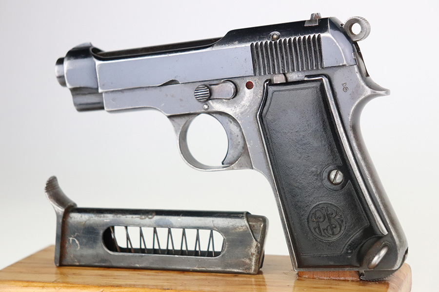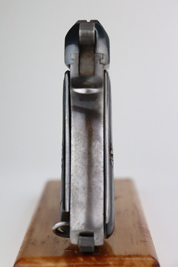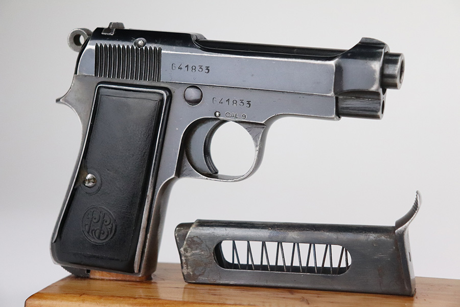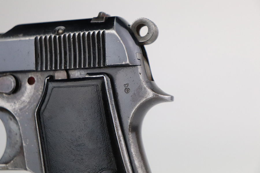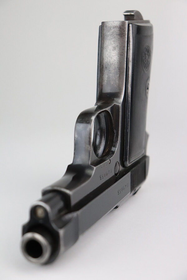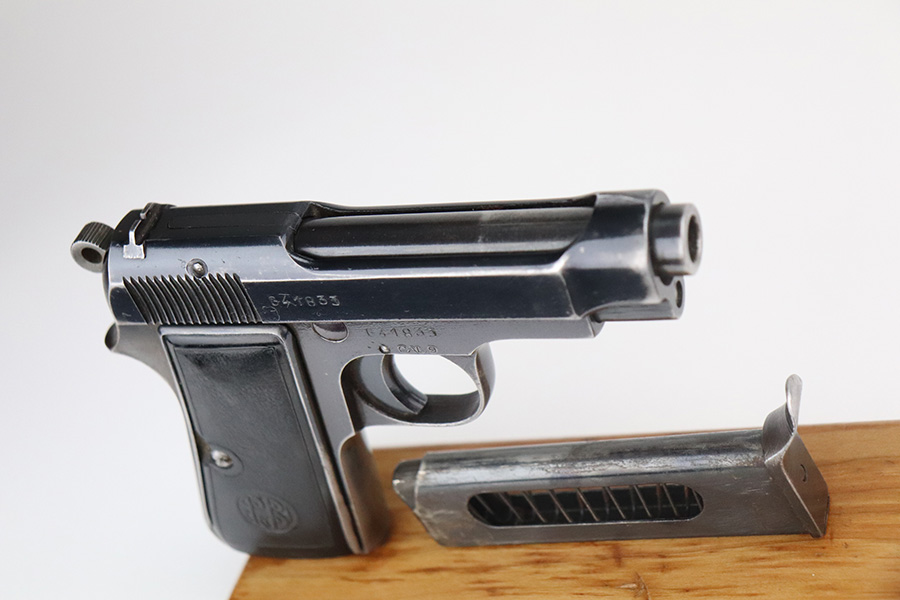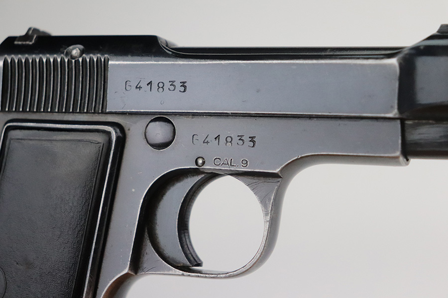 6/30/21 – This is a nice example of a Beretta Model 1934 manufactured under German occupation during WW2. It is all matching, has no slide legend, a “G” serial prefix, and an Italian Brescia proof on the left side of the frame. Chambered in 9mm Corto. The gun has retained about 75% of its original finish. Most of the wear is on the straps, but there is also wear along the high edges of the slide, around the muzzle, and noticeable scratching on the left side of the frame from the safety lever. Spotty oxidation here and there, most noticeable on the left side of the frame and on the straps. The grips are period-correct, but there is a chip on the right side and the screw is buggered-up. Comes with a period-correct magazine. The bore is shiny with strong rifling and very minor frosting in the grooves.