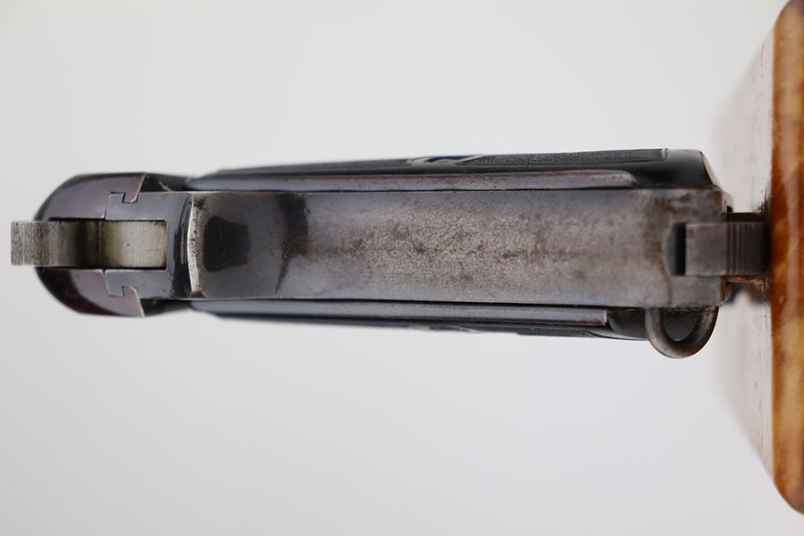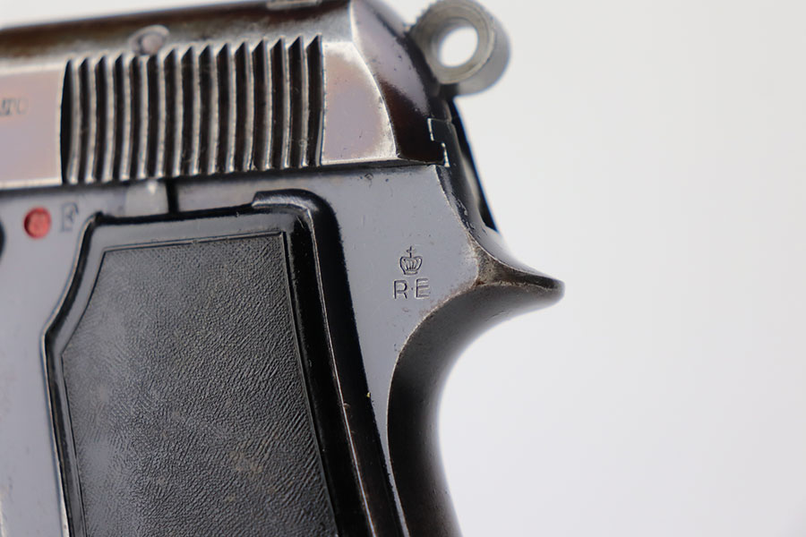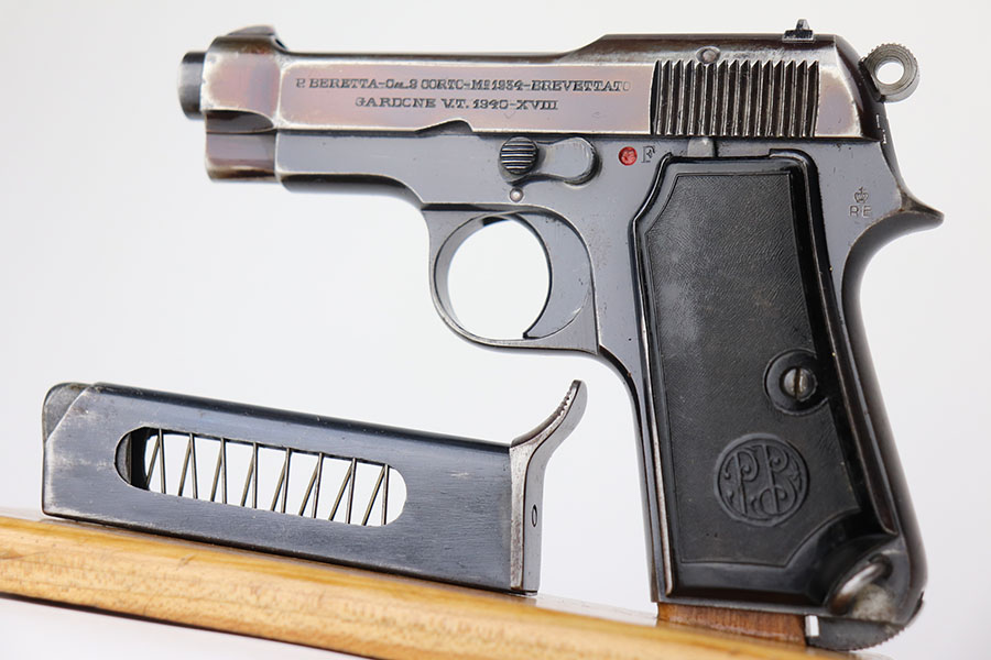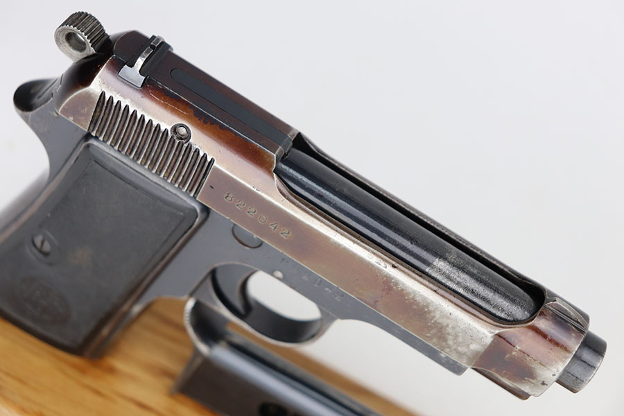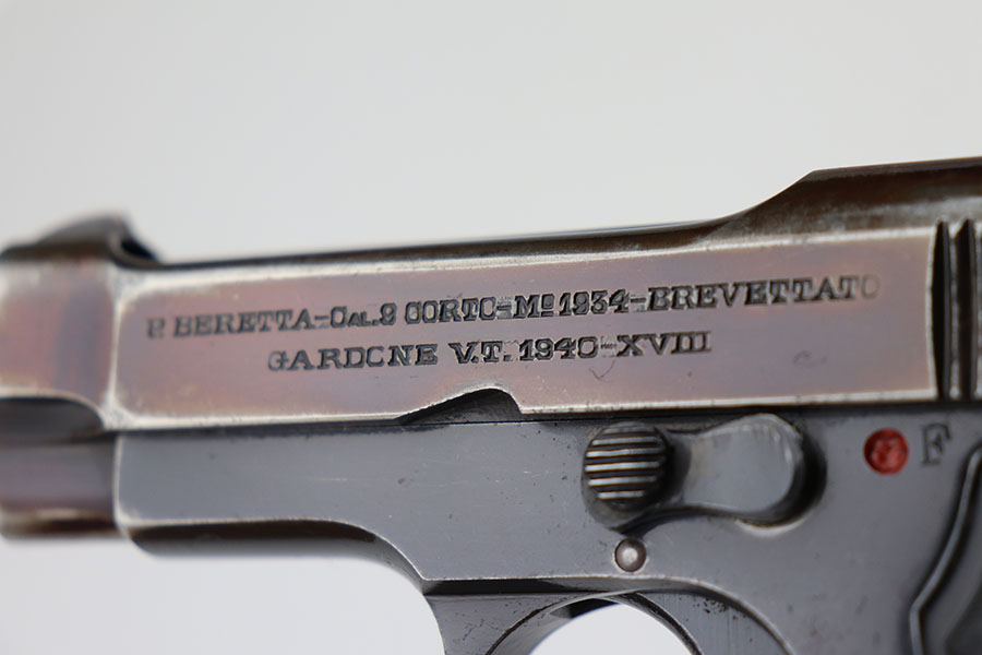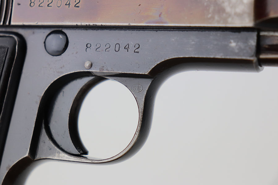 4/7/21 – This is a nice example of a Beretta Model 1934 issued to the Italian military in 1940. The gun is all matching and has the proper “Crown RE” Italian military acceptance proof. Also has an “FAG 39” factory test proof. The gun comes with a greenish Beretta holster and two proper magazines. The gun has retained roughly 80% of its original finish. The slide is plumb-colored. There is spotty wear on both straps and along all sides of the slide. There is spotty oxidation on the straps and minor pitting near the muzzle. Comes with very nice grips. The bore has good rifling with tiny pin-pricking throughout.