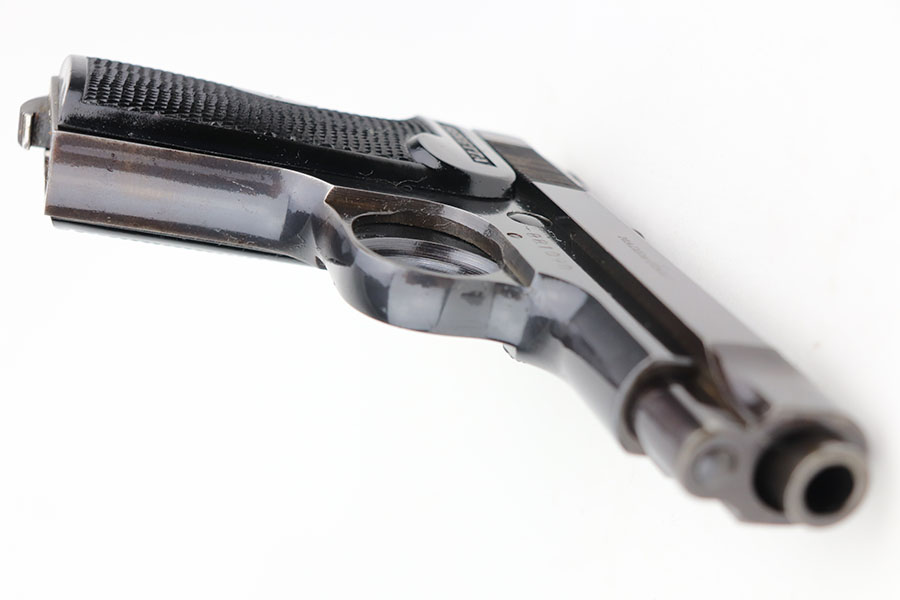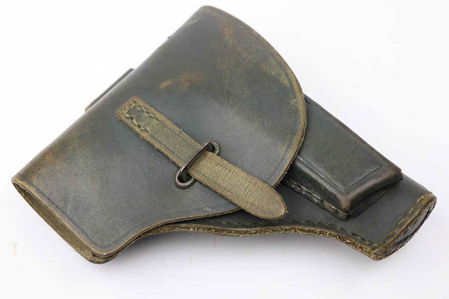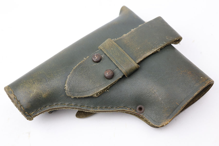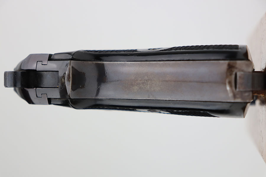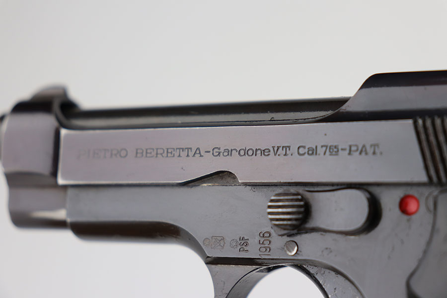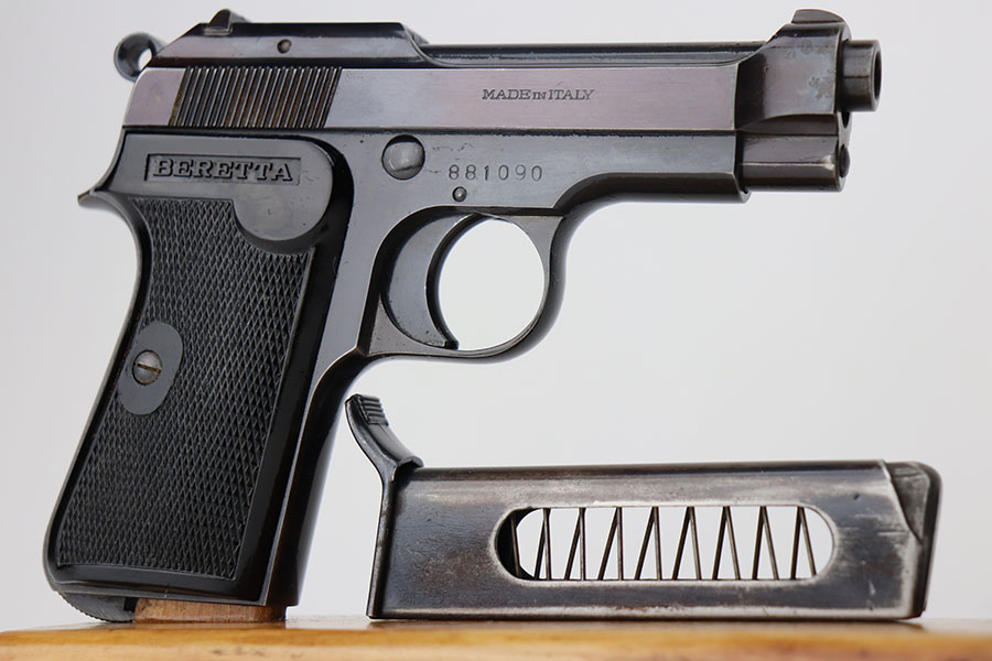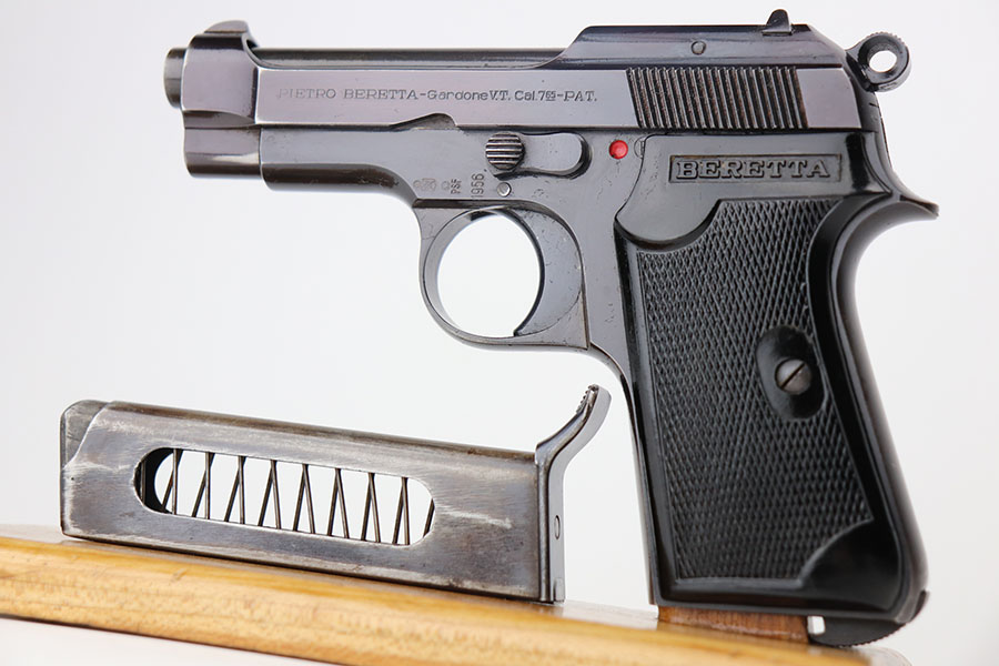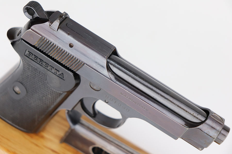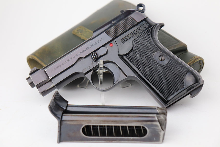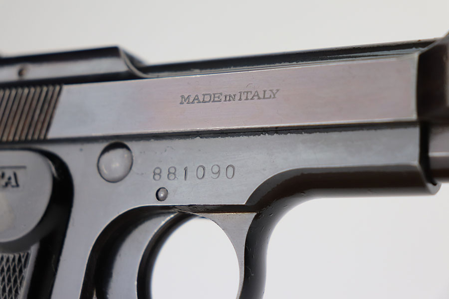 4/7/21 – This is an excellent example of a Beretta Model 1935 manufactured in 1956. It is all matching and has the proper Italian proofs. The rig comes with an original green Beretta holster and two proper magazines. The gun has retained about 95% of its original finish. There is minor wear and patina on the straps. There is a hint of wear around the muzzle. Very light pin-pricking on the right side of the slide near the muzzle. Comes with excellent grips. Excellent bore – shiny with strong rifling.