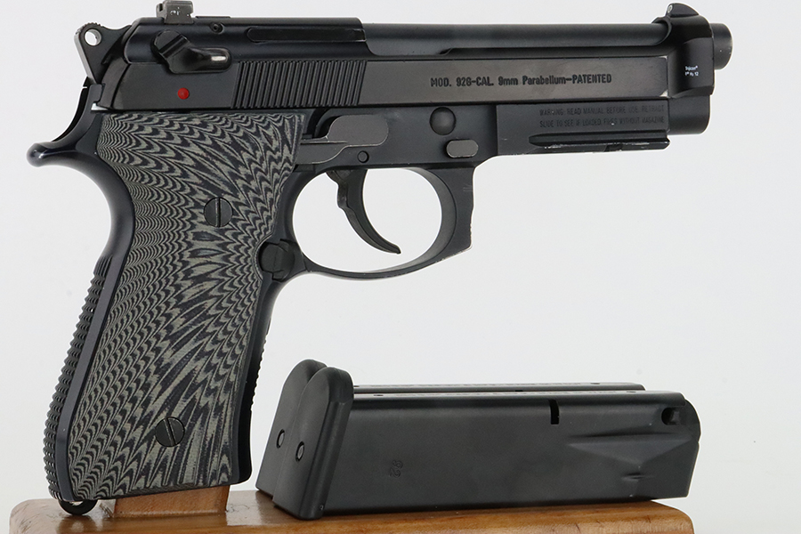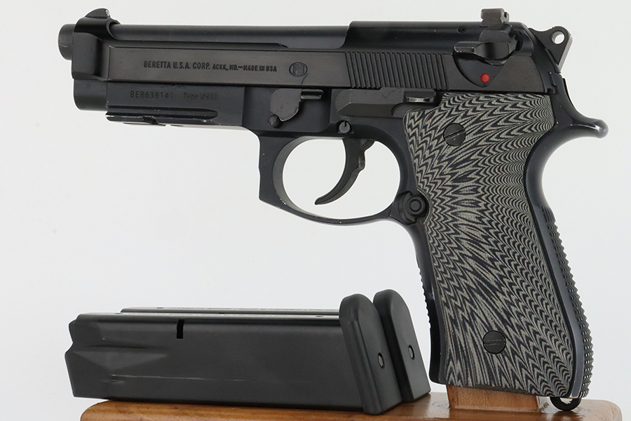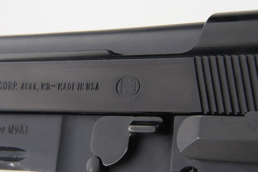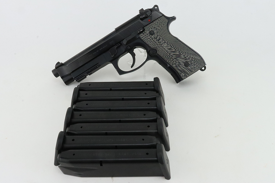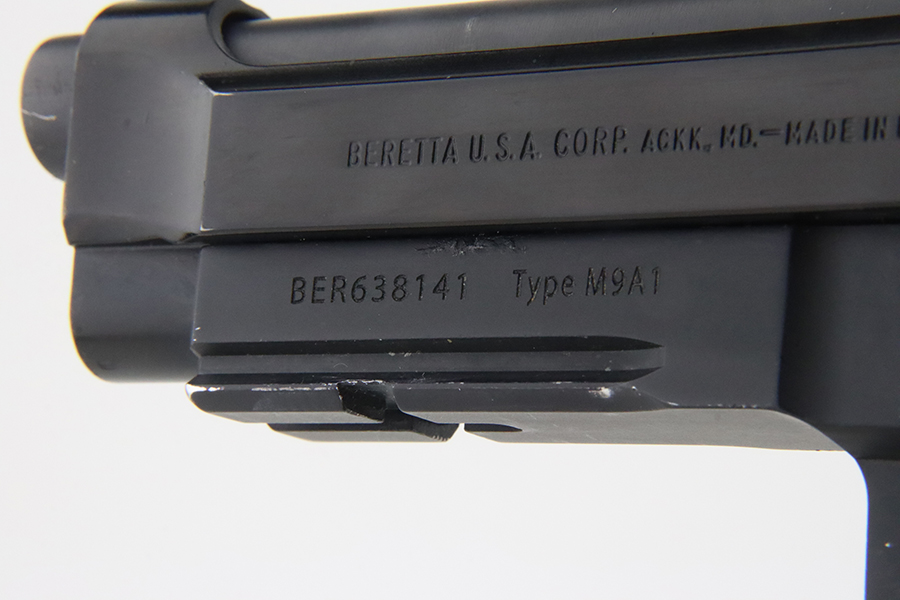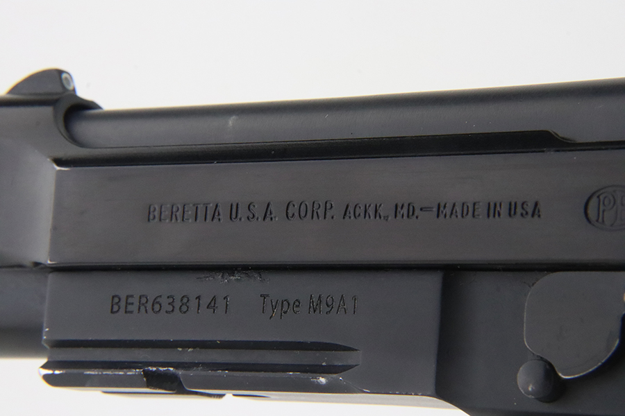 2/2/24 – This is an excellent example of a Beretta Model M9A1, chambered in 9mm. It comes with seven magazines. Overall, it is excellent, but there are some light scratches and handling marks here and there on the slide and on the front strap. Fitted with really nice composite black and grey composite grips. Minty bore.
