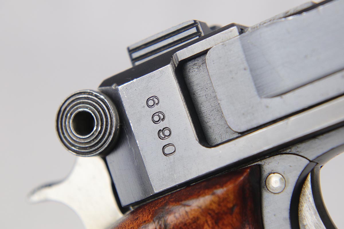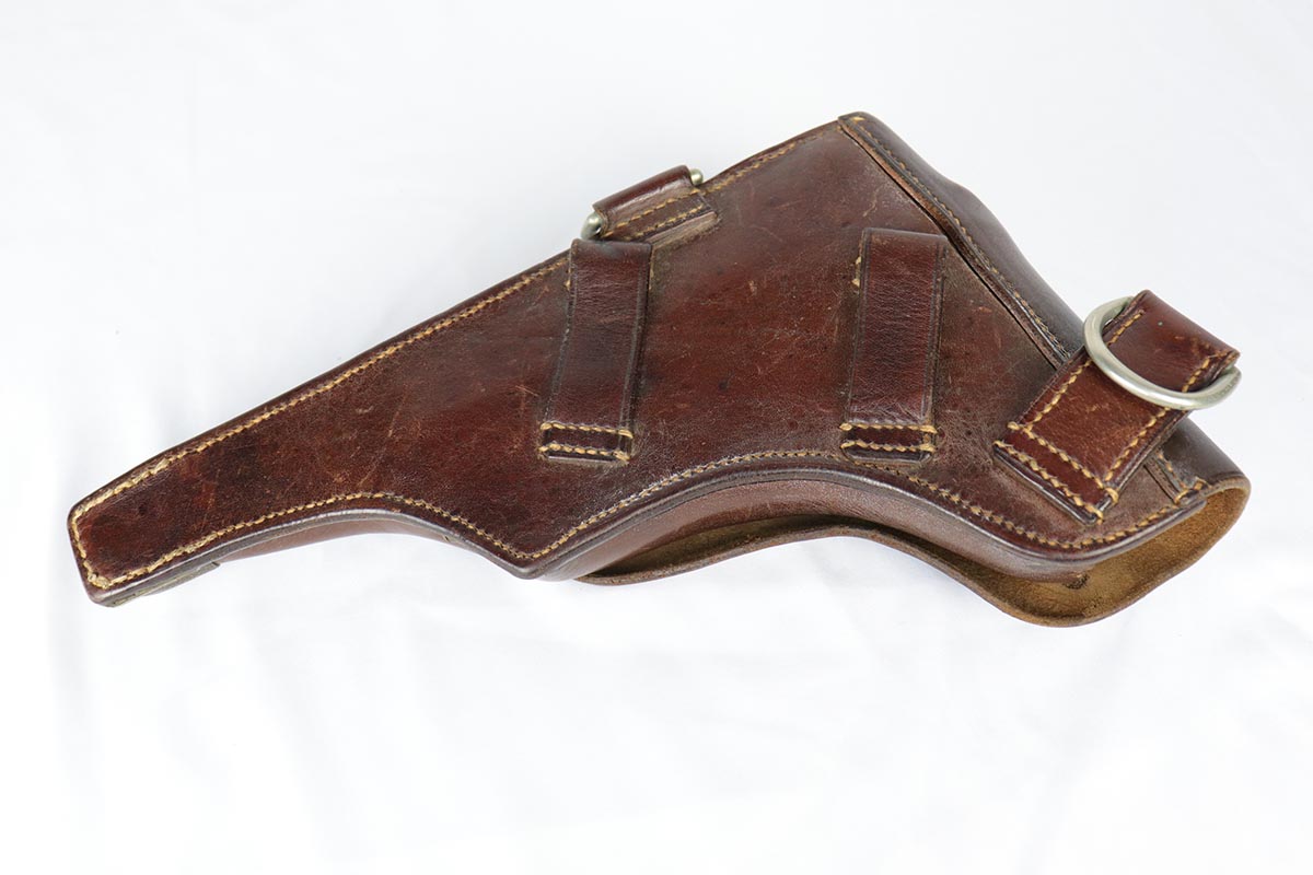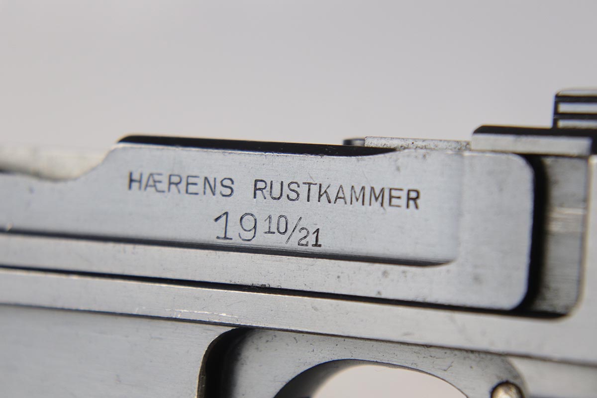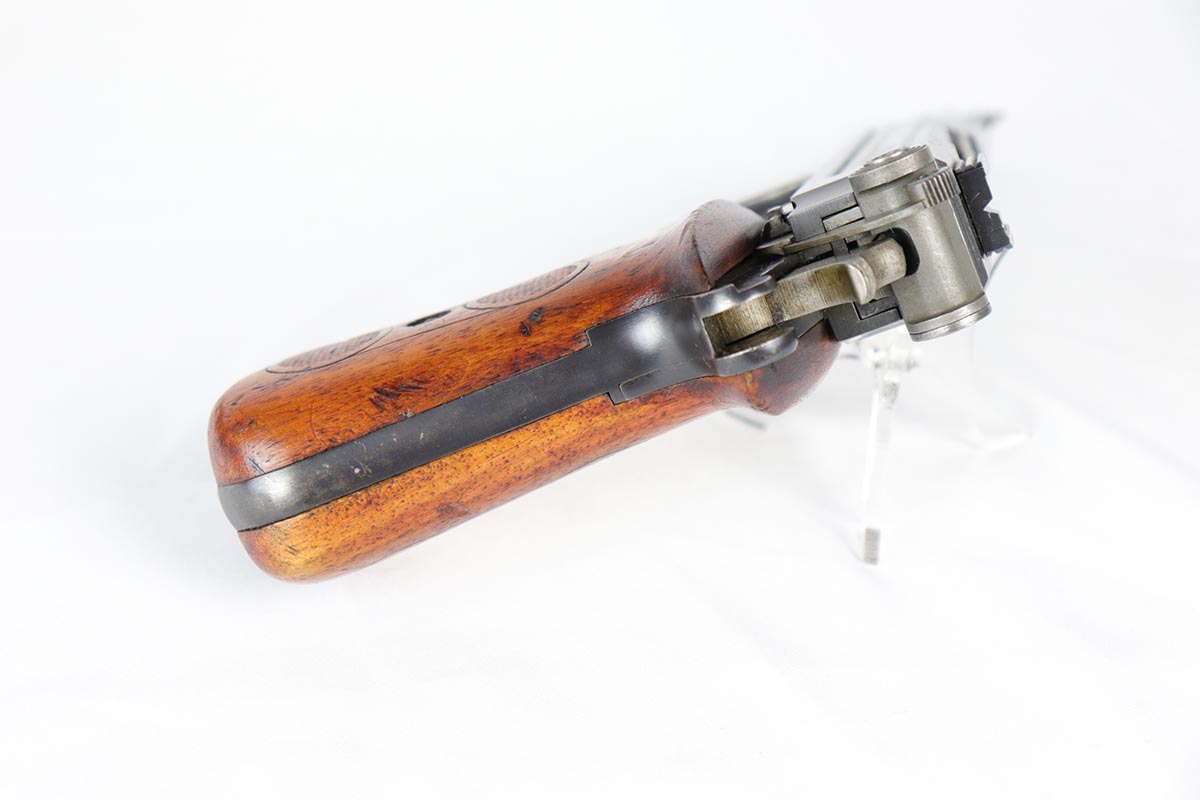 6/15/18 –  This is a superb and complete example of a Bergmann Bayard 1910/21 Dannish Army contract pistol rig.  The  Danish contract guns were made under contract by two Dannish Arsenals: Toijus and Rustkammer, with Rustkammer production being about half of the Toijus production.  Danish made guns had a very nice finish and beautifully carved wood grips with an interesting checkering design. This is a complete set that includes an excellent unit marked holster and two matched magazines. The gun is in excellent condition, retaining about 95% of its original blue, with minor holster wear to the grip frame and high edges. There is no pitting anywhere. The bore is excellent, as are the grips. This is a rare example of an “as issued” rig that would be difficult, if not impossible, to upgrade. This is the first such complete rig that we have ever offered.