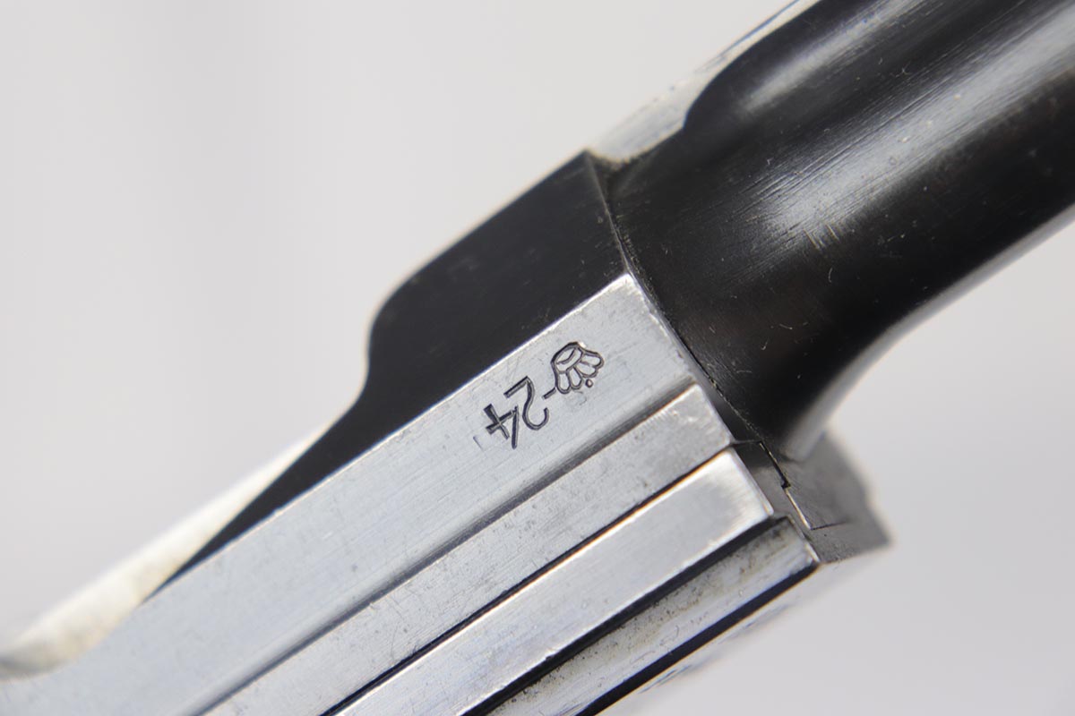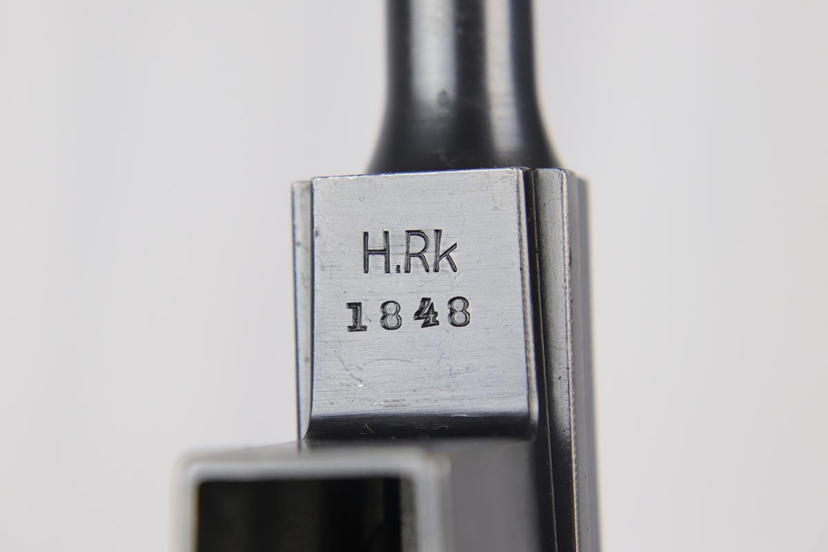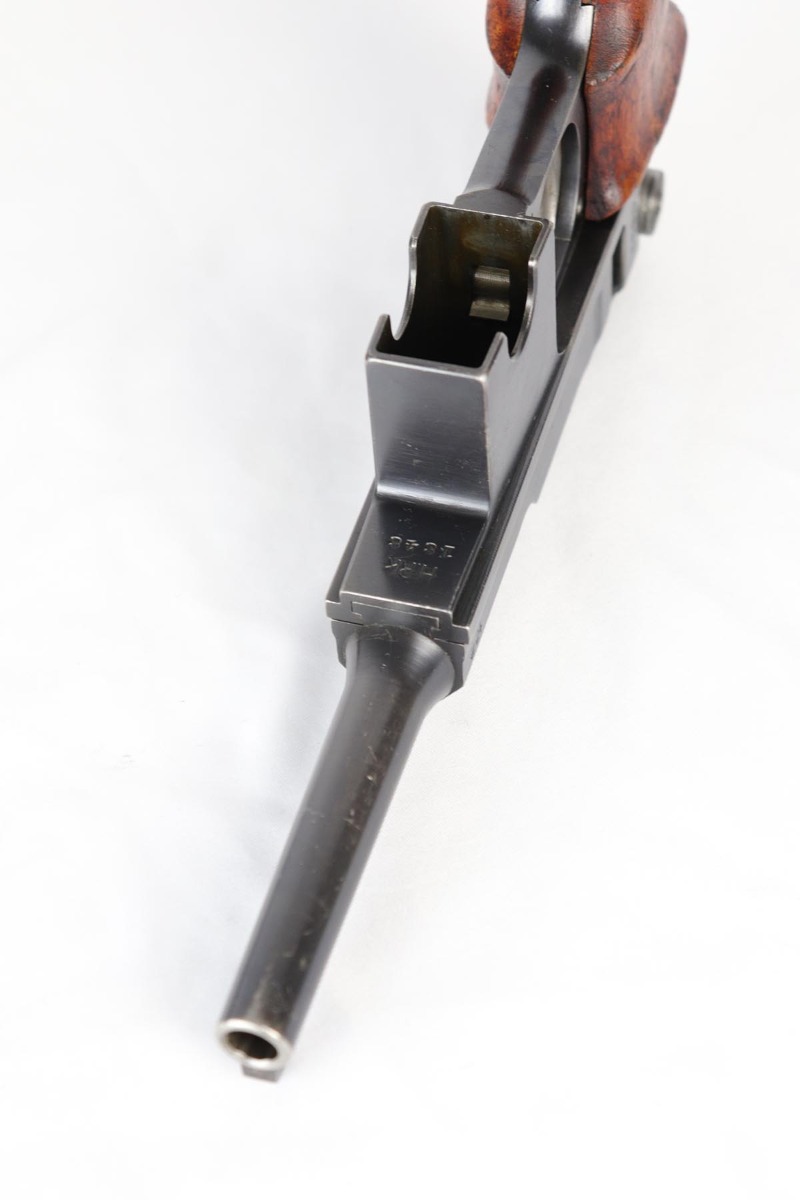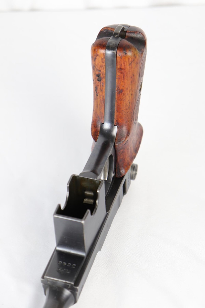 6/15/18 –  This is a superb and complete example of a Bergmann Bayard 1910/21 Dannish Army contract pistol rig.  The  Danish contract guns were made under contract by two Dannish Arsenals: Toijus and Rustkammer, with Rustkammer production being about half of the Toijus production.  Danish made guns had a very nice finish and beautifully carved wood grips with an interesting checkering design. This is a complete set that includes an excellent unit marked holster and two matched magazines. The gun is in excellent condition, retaining about 95% of its original blue, with minor holster wear to the grip frame and high edges. There is no pitting anywhere. The bore is excellent, as are the grips. This is a rare example of an “as issued” rig that would be difficult, if not impossible, to upgrade. This is the first such complete rig that we have ever offered.