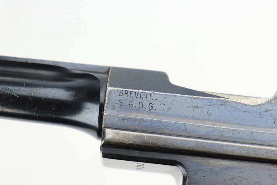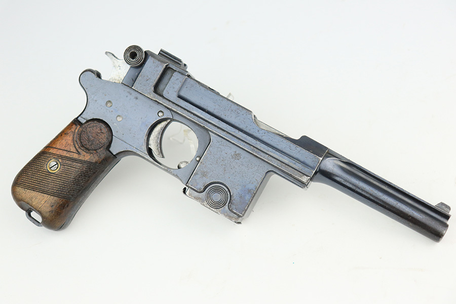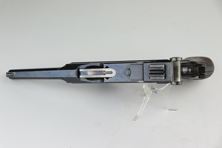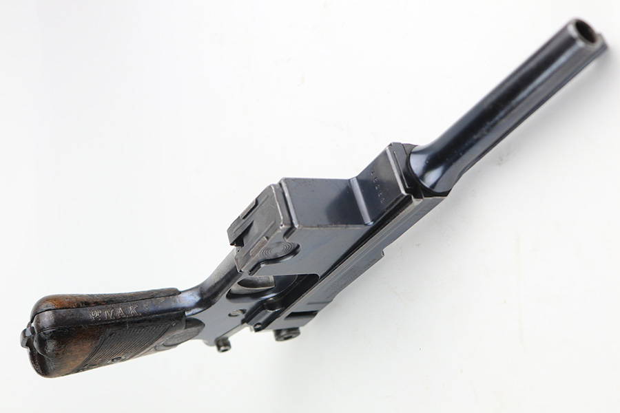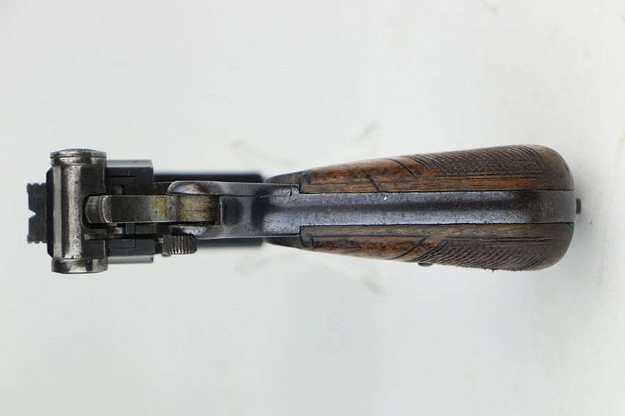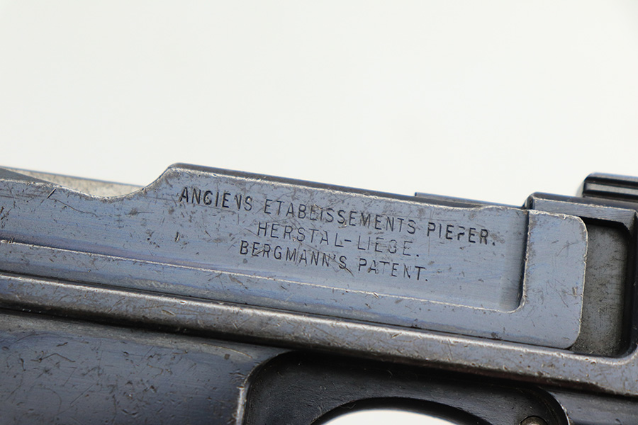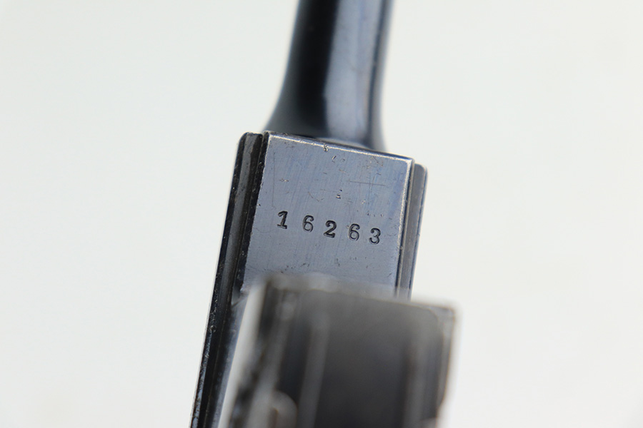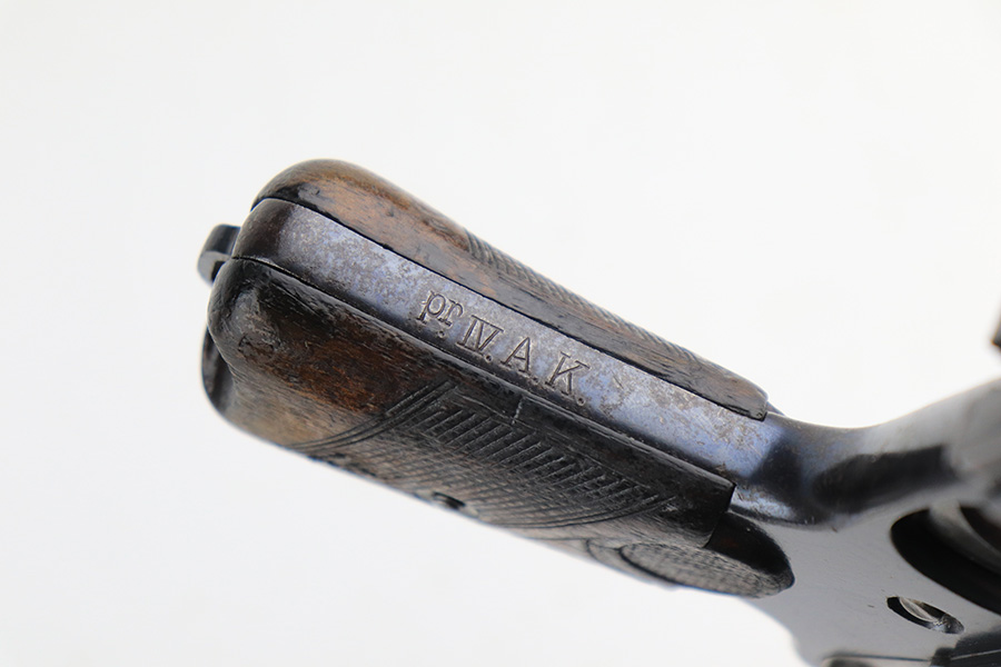12/3/21 – This is a WW!-era Belgian Bergmann Model 1910. The slide reads “Anciens Etabeissements Pieper Herstal-Liege Bergmann’s Patent”. The gun does not have Danish military proof marks. It has wood grips that do not appear to be numbered. Here is a brief history of the gun – The Danish military initially ordered about 5,000 of these pistols in 1910. These will have Danish military proofs. Then in WW1, when the Germans occupied Belgium, another 1,000 guns were produced. These guns should be in the serial range of around 15000-16000. They should have no proof marks. That’s when this gun was produced. This particular pistol has retained around 85% of its bluing. Most of the wear is on the high edges, and there are small dings and scratches throughout. There is a marking on the front strap that reads “pr IV. A. K.”. We are not sure what it means. Could be a unit marking. The gun is fully functional. The bore has very strong rifling, but some mild frosting. It comes with an original magazine that is not numbered. C&R eligible.