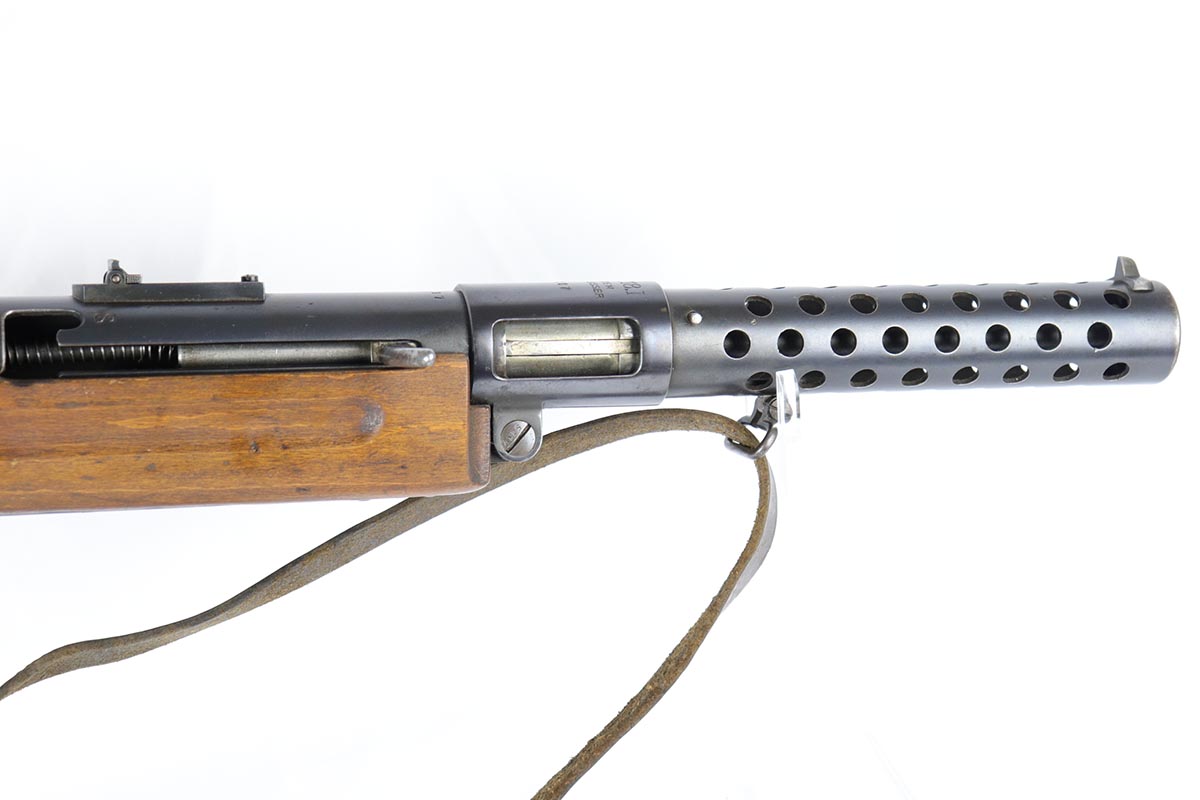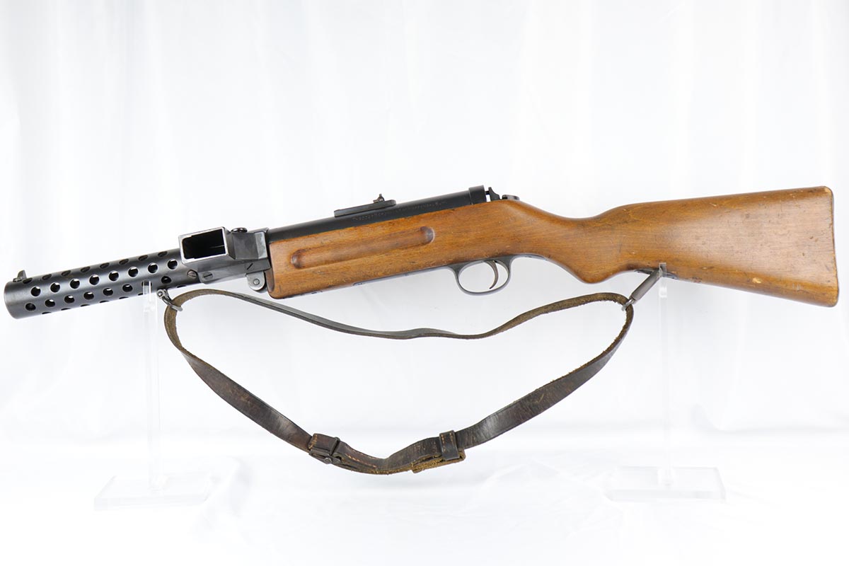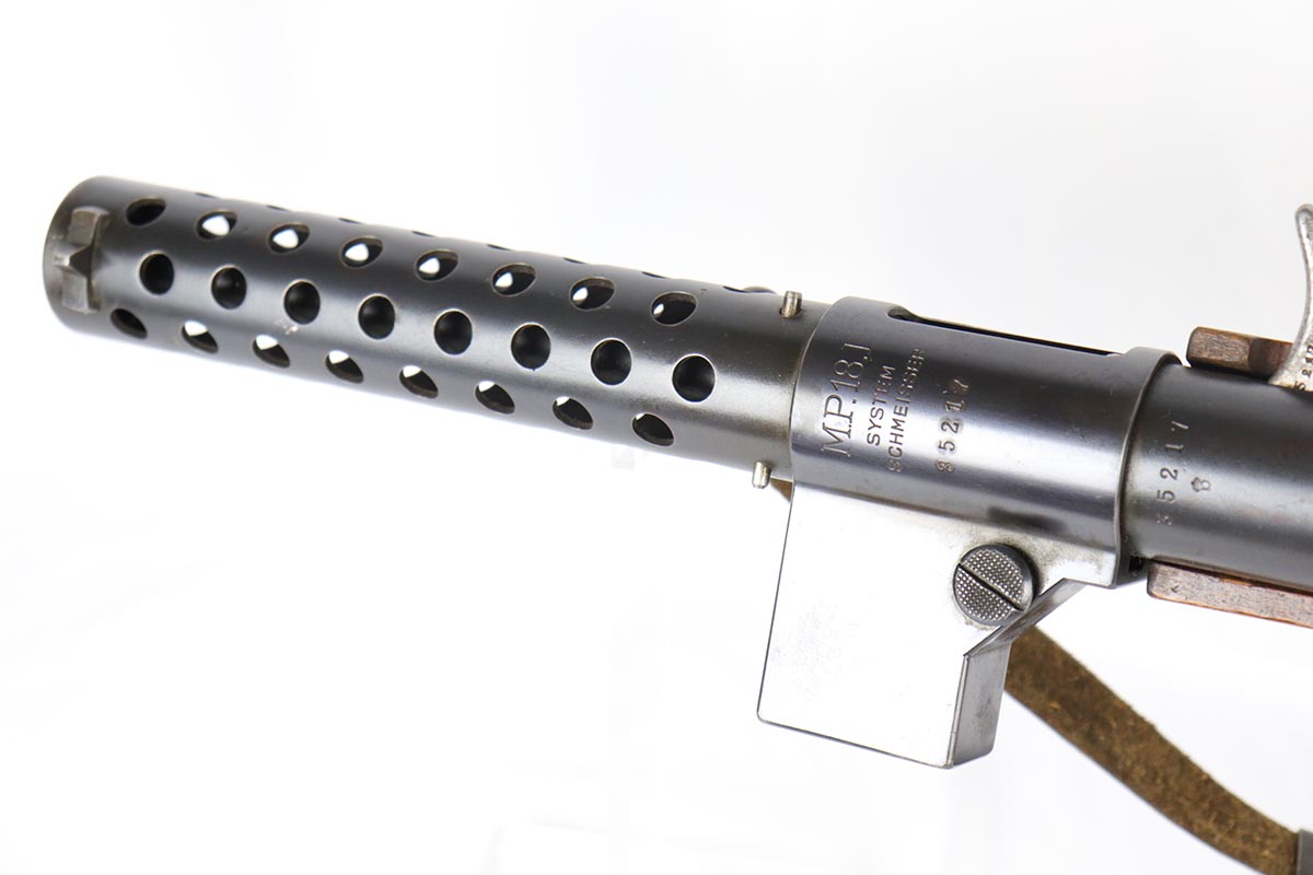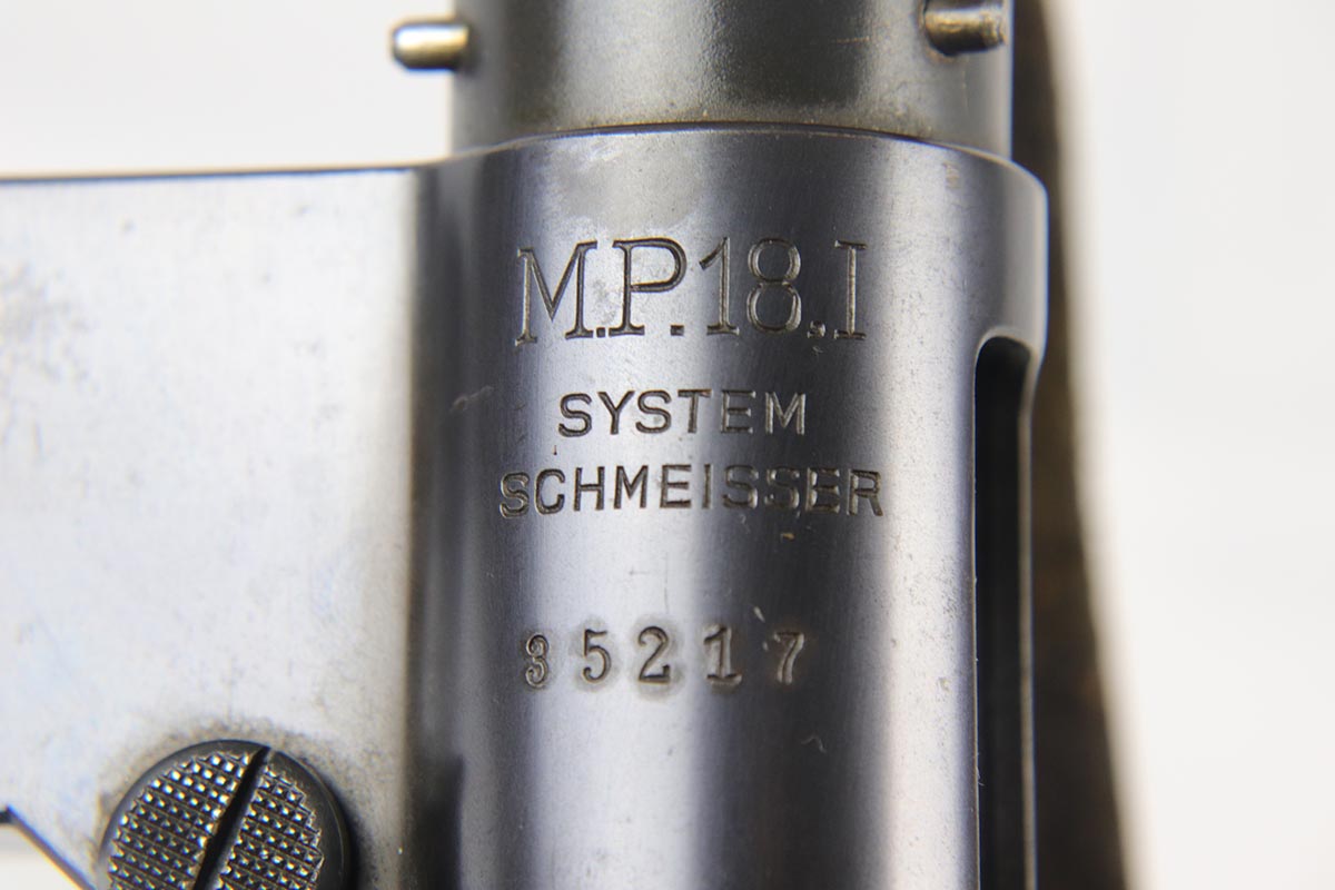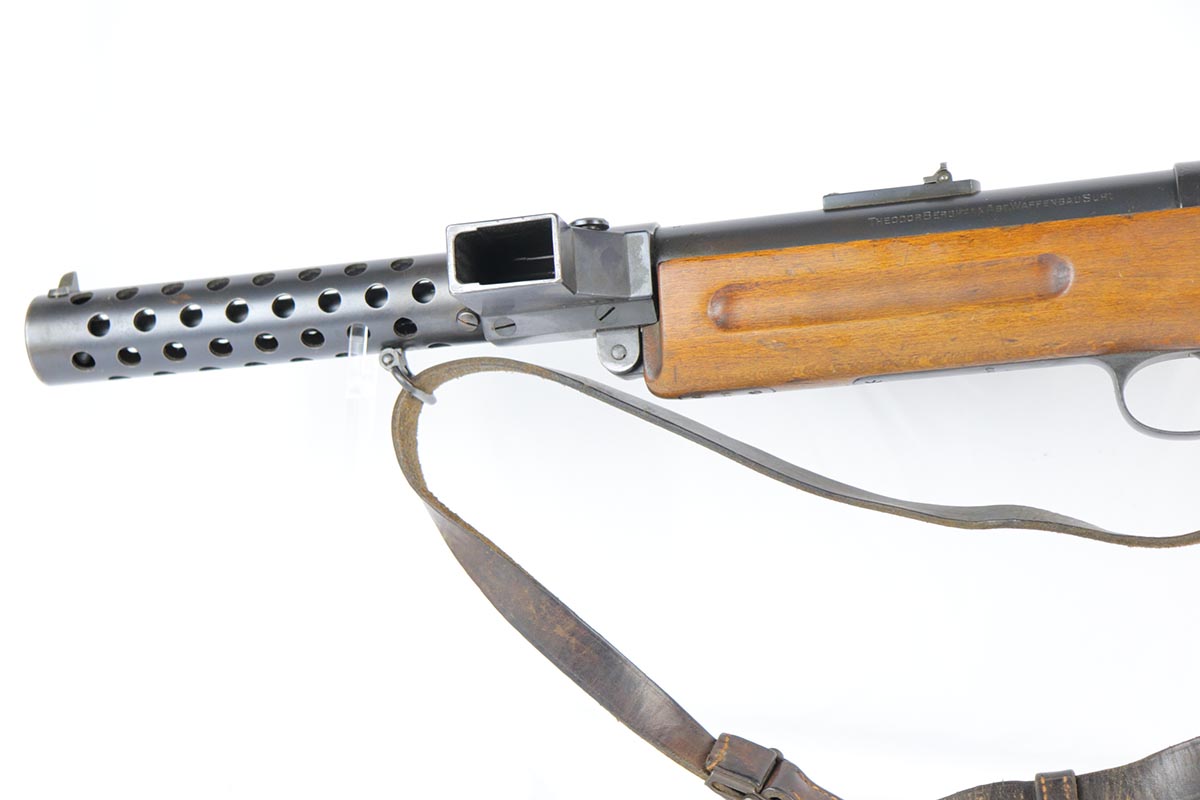 2/22/19 – This is an exceedingly fine specimen of the MP-18.1 which includes orig leather sling and magazine.  Manufactured by Bergmann, this sub machine gun has all matching numbers except for rear sight tension spring and detent latch numbers.   This weapon retains 90% blue with minor dulling to the receiver and some finish loss on the muzzle end of the compensator.  Mag housing retains more of a high luster finish with some slight areas of light freckling.  Buttplate is a light gray metal finish. Crown proof marks visible on top of receiver and on buttplate. Mechanics are fine.  Bore is shiny and bright with strong rifling with some slight frosting.  This class III weapon was formerly on loan to Evergreen Aviation & Space Museum.  This weapon is fully transferable on an ATF form 3 or form 4 as Curio & Relic eligible.  NOTE: Magazine is not pictured as it was shipped separately.