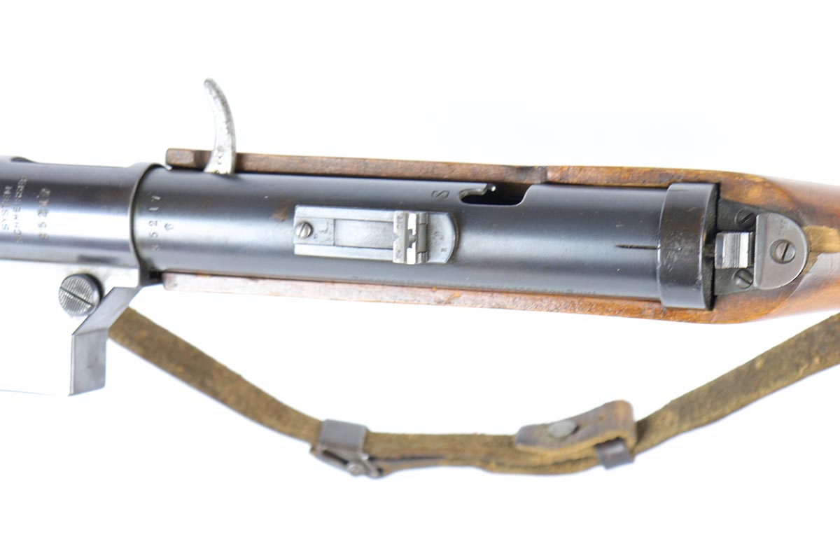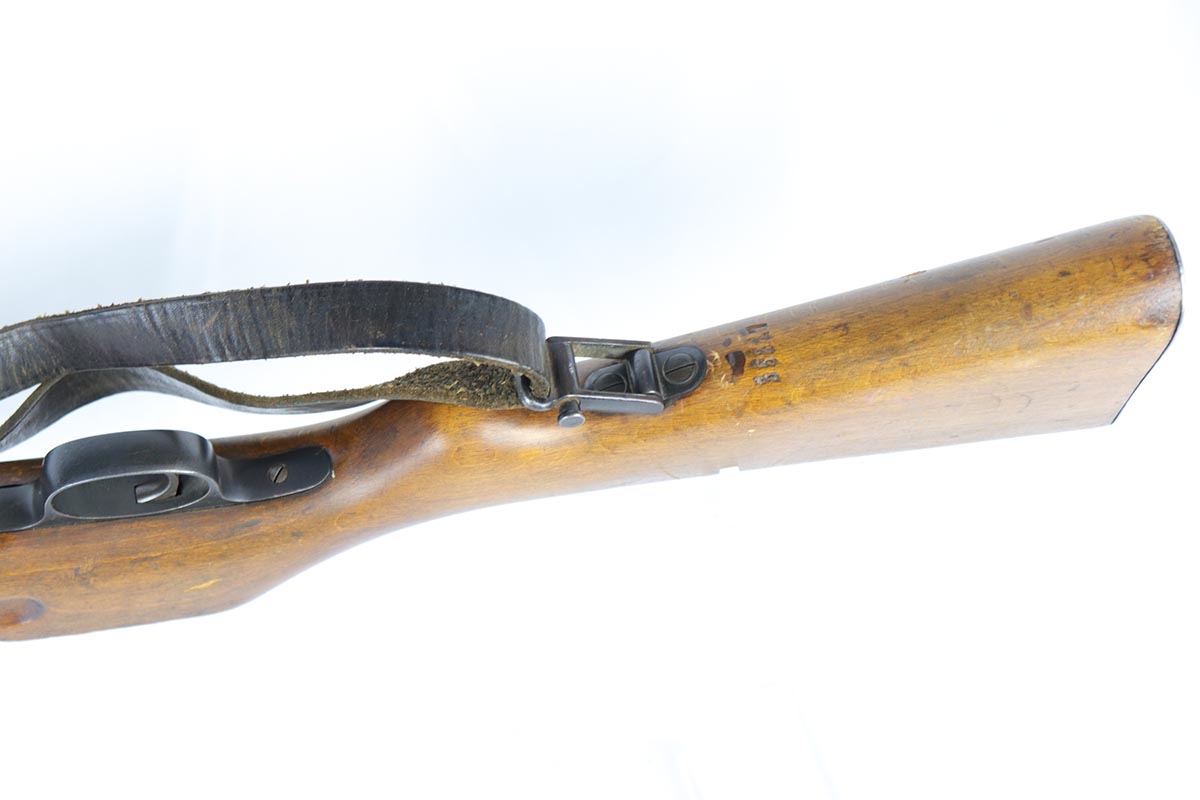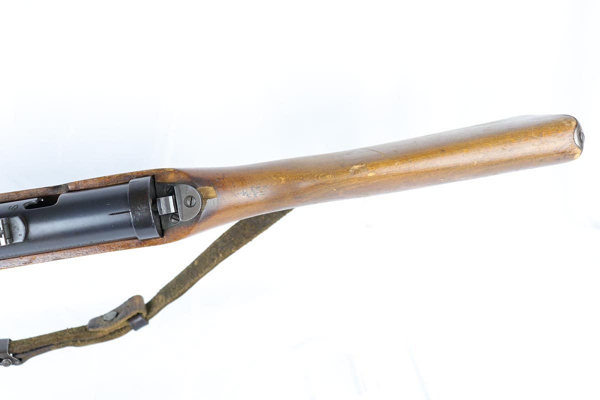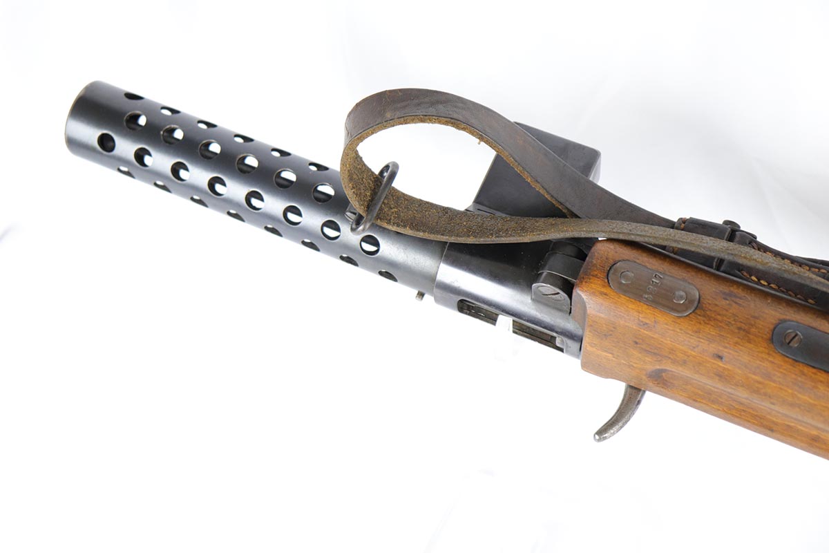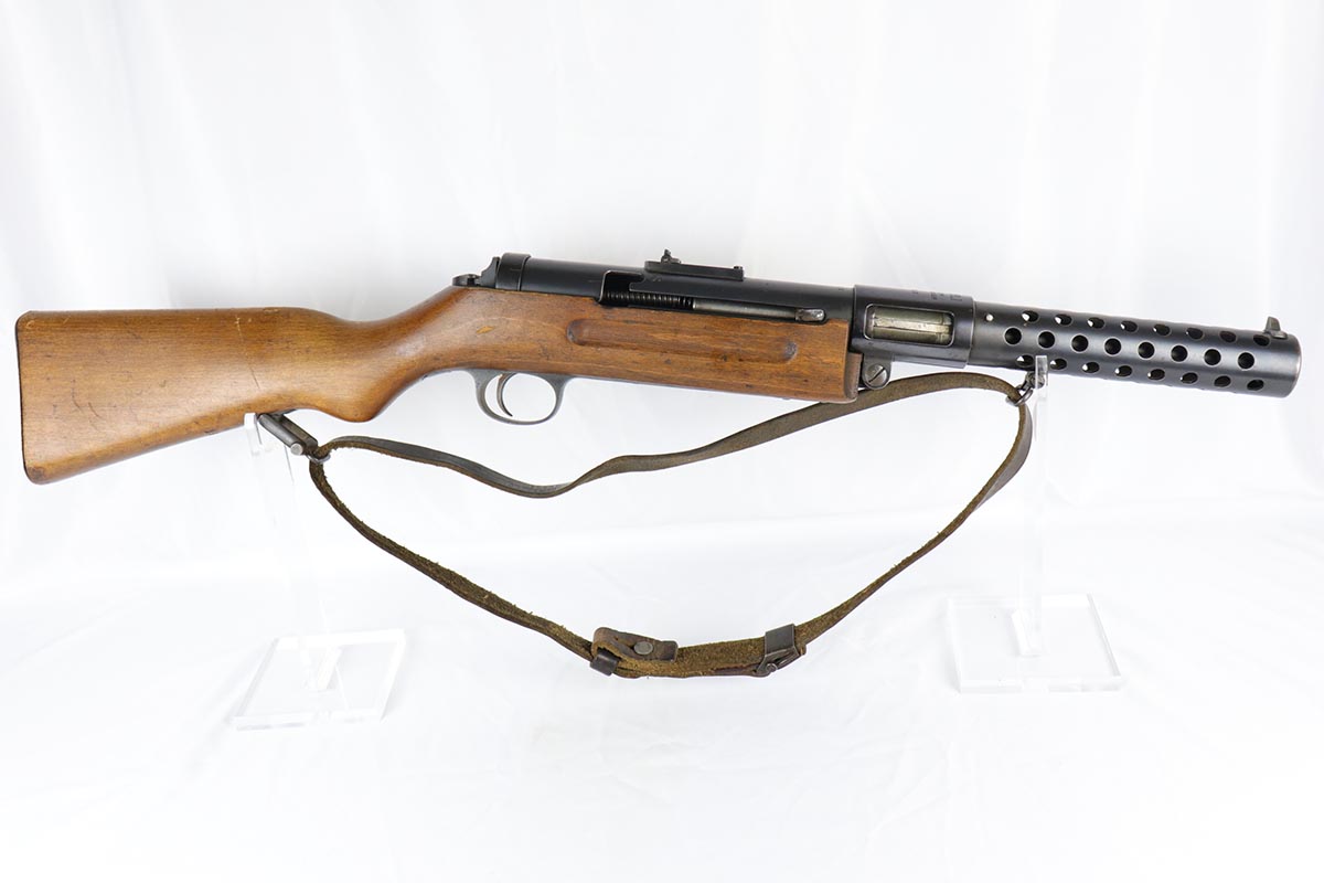2/22/19 – This is an exceedingly fine specimen of the MP-18.1 which includes orig leather sling and magazine.  Manufactured by Bergmann, this sub machine gun has all matching numbers except for rear sight tension spring and detent latch numbers.   This weapon retains 90% blue with minor dulling to the receiver and some finish loss on the muzzle end of the compensator.  Mag housing retains more of a high luster finish with some slight areas of light freckling.  Buttplate is a light gray metal finish. Crown proof marks visible on top of receiver and on buttplate. Mechanics are fine.  Bore is shiny and bright with strong rifling with some slight frosting.  This class III weapon was formerly on loan to Evergreen Aviation & Space Museum.  This weapon is fully transferable on an ATF form 3 or form 4 as Curio & Relic eligible.  NOTE: Magazine is not pictured as it was shipped separately.
