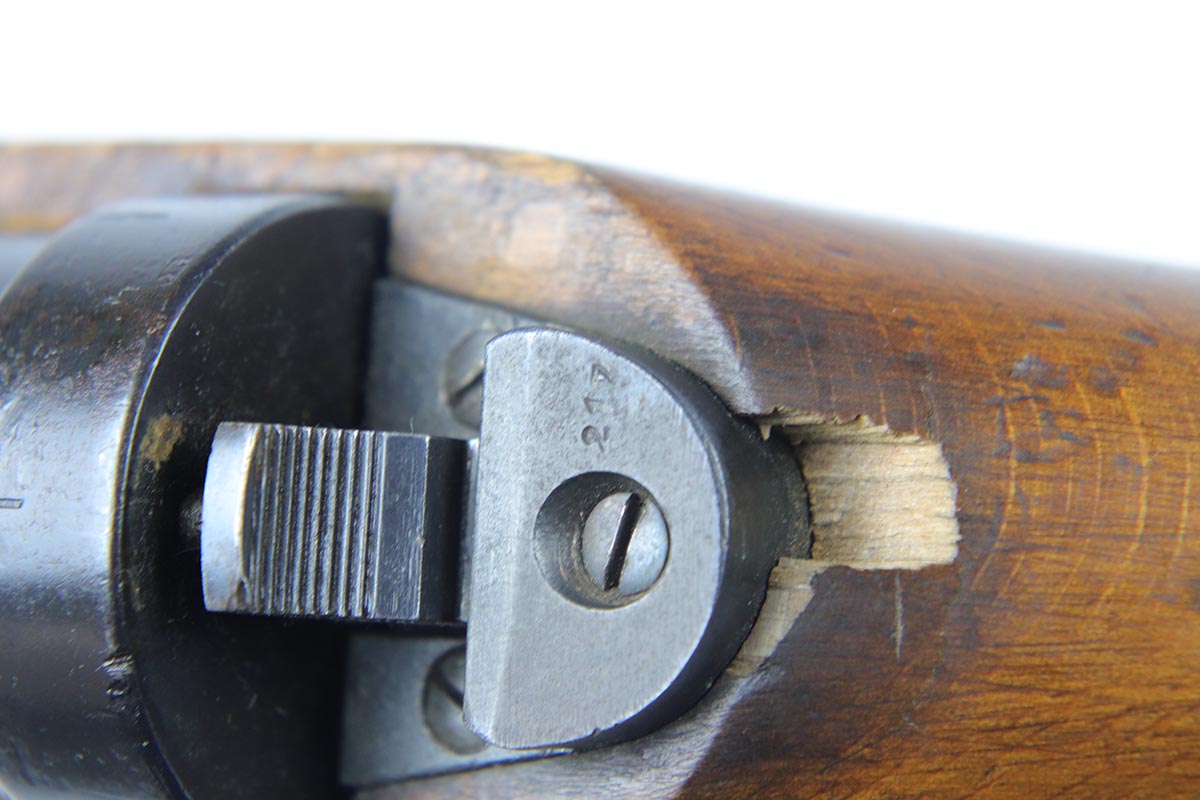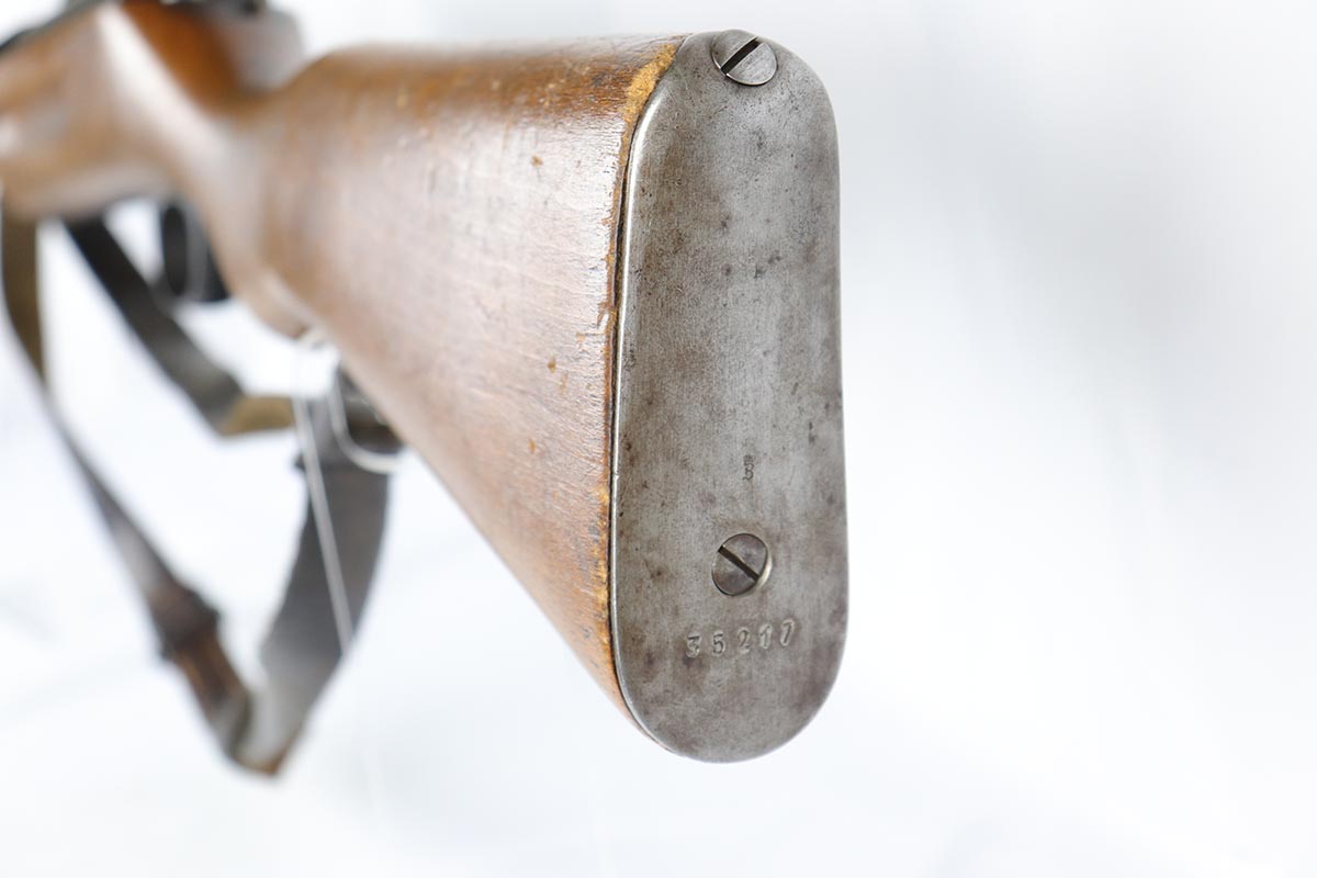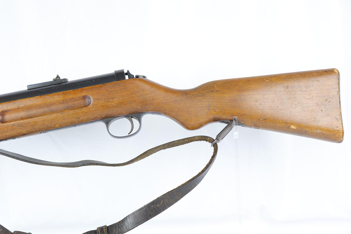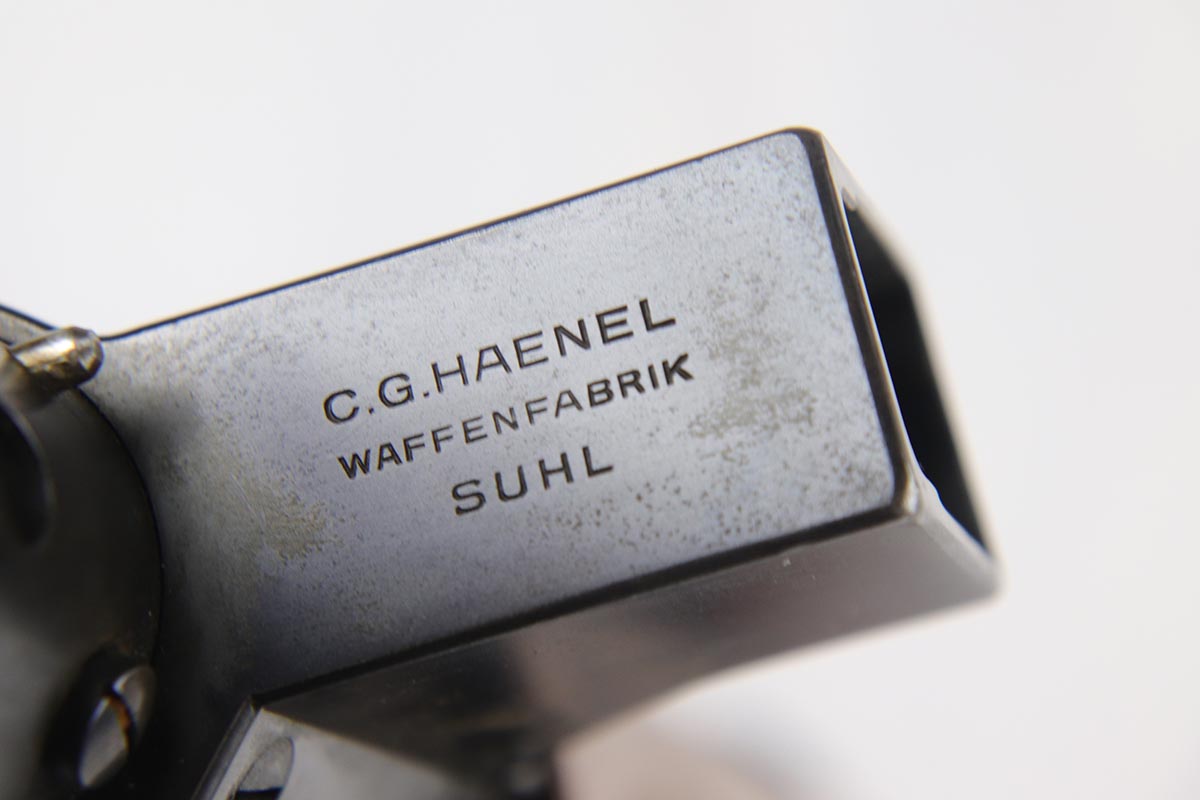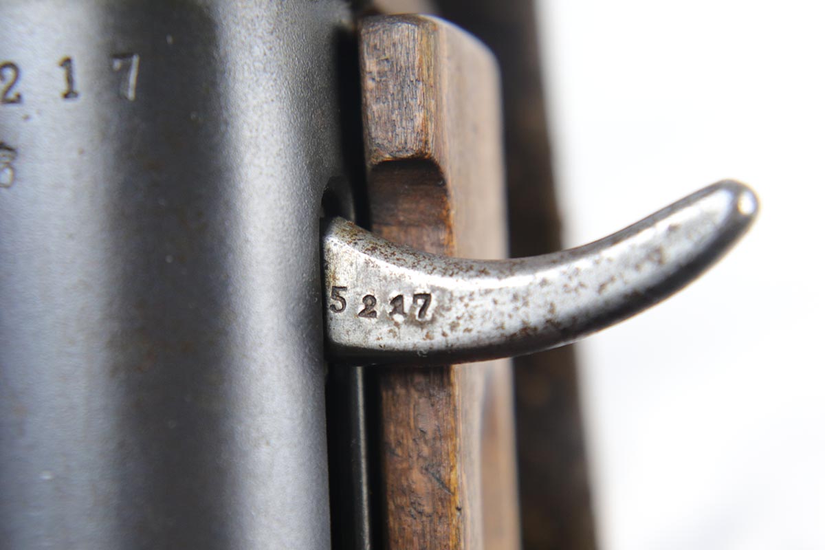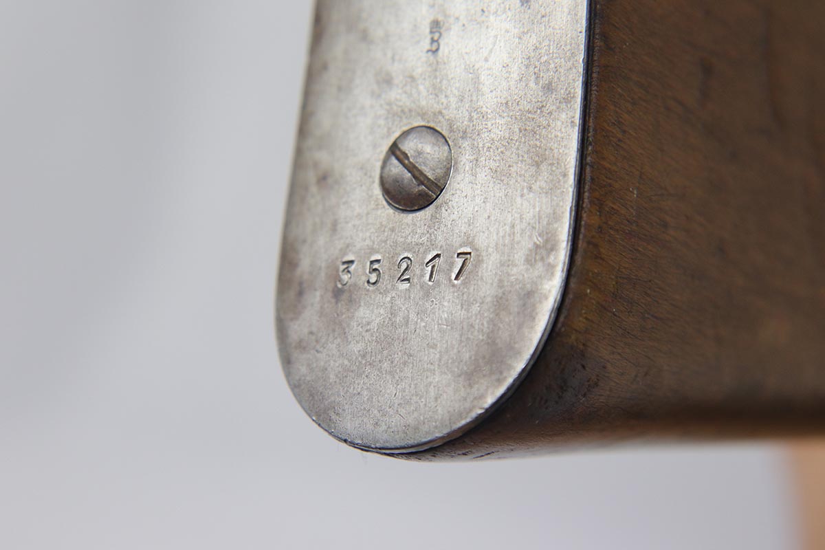 2/22/19 – This is an exceedingly fine specimen of the MP-18.1 which includes orig leather sling and magazine.  Manufactured by Bergmann, this sub machine gun has all matching numbers except for rear sight tension spring and detent latch numbers.   This weapon retains 90% blue with minor dulling to the receiver and some finish loss on the muzzle end of the compensator.  Mag housing retains more of a high luster finish with some slight areas of light freckling.  Buttplate is a light gray metal finish. Crown proof marks visible on top of receiver and on buttplate. Mechanics are fine.  Bore is shiny and bright with strong rifling with some slight frosting.  This class III weapon was formerly on loan to Evergreen Aviation & Space Museum.  This weapon is fully transferable on an ATF form 3 or form 4 as Curio & Relic eligible.  NOTE: Magazine is not pictured as it was shipped separately.