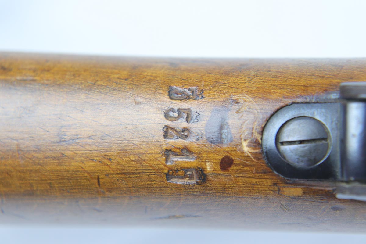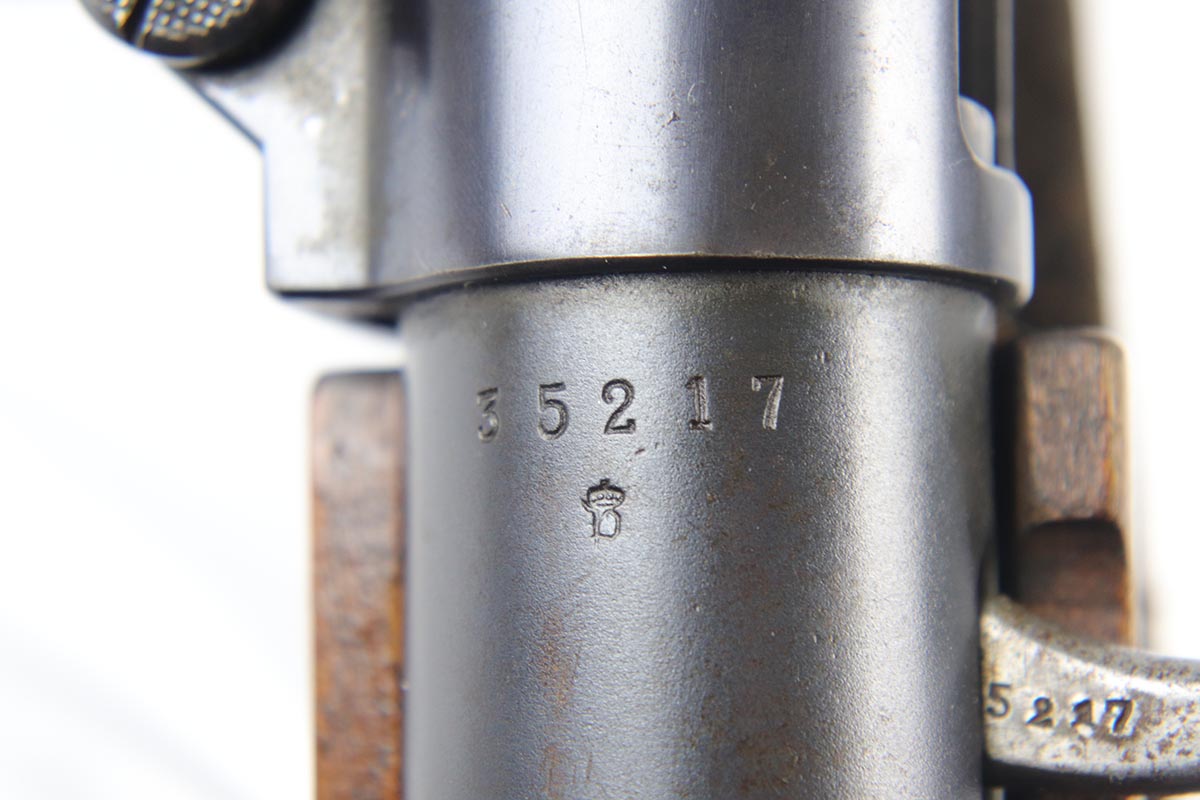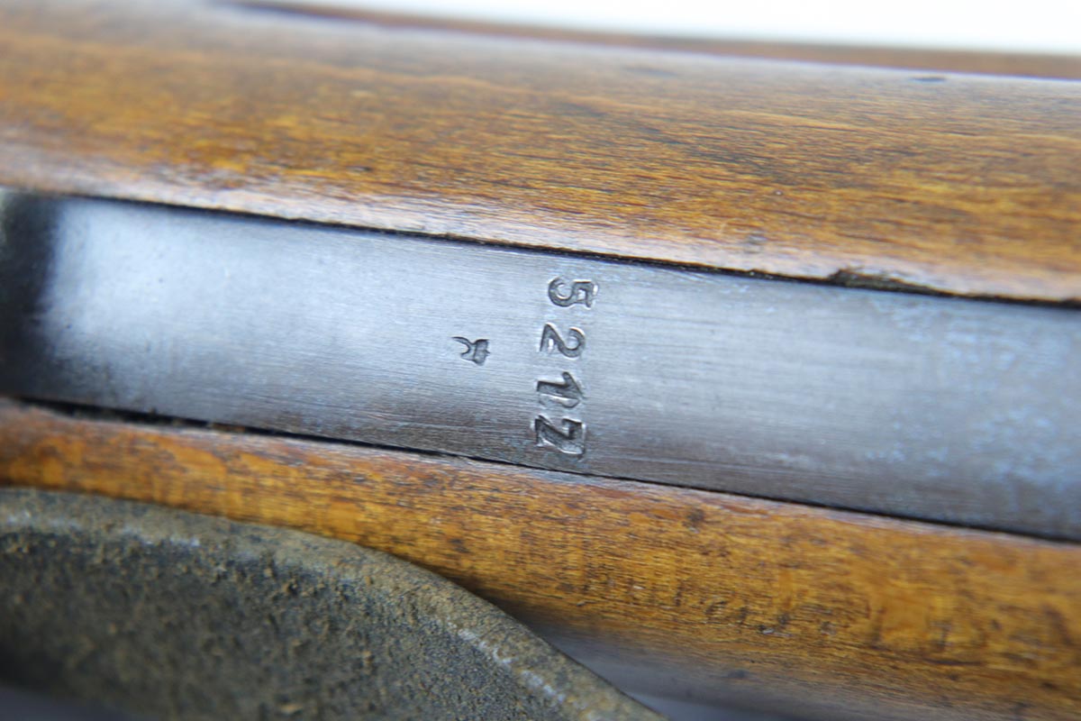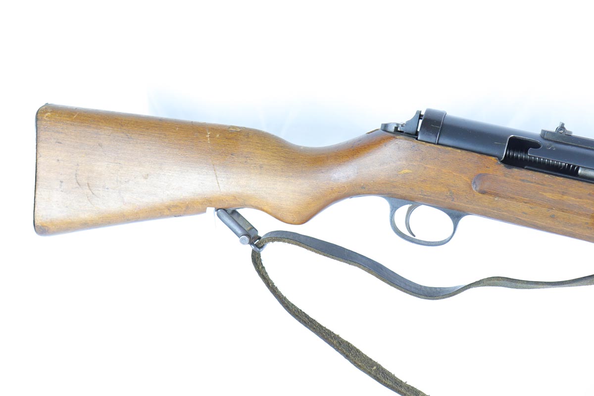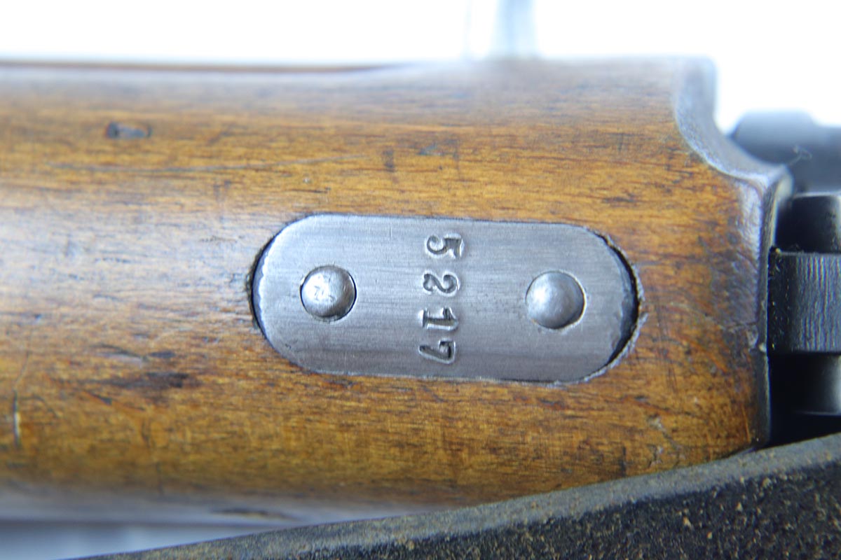 2/22/19 – This is an exceedingly fine specimen of the MP-18.1 which includes orig leather sling and magazine.  Manufactured by Bergmann, this sub machine gun has all matching numbers except for rear sight tension spring and detent latch numbers.   This weapon retains 90% blue with minor dulling to the receiver and some finish loss on the muzzle end of the compensator.  Mag housing retains more of a high luster finish with some slight areas of light freckling.  Buttplate is a light gray metal finish. Crown proof marks visible on top of receiver and on buttplate. Mechanics are fine.  Bore is shiny and bright with strong rifling with some slight frosting.  This class III weapon was formerly on loan to Evergreen Aviation & Space Museum.  This weapon is fully transferable on an ATF form 3 or form 4 as Curio & Relic eligible.  NOTE: Magazine is not pictured as it was shipped separately.