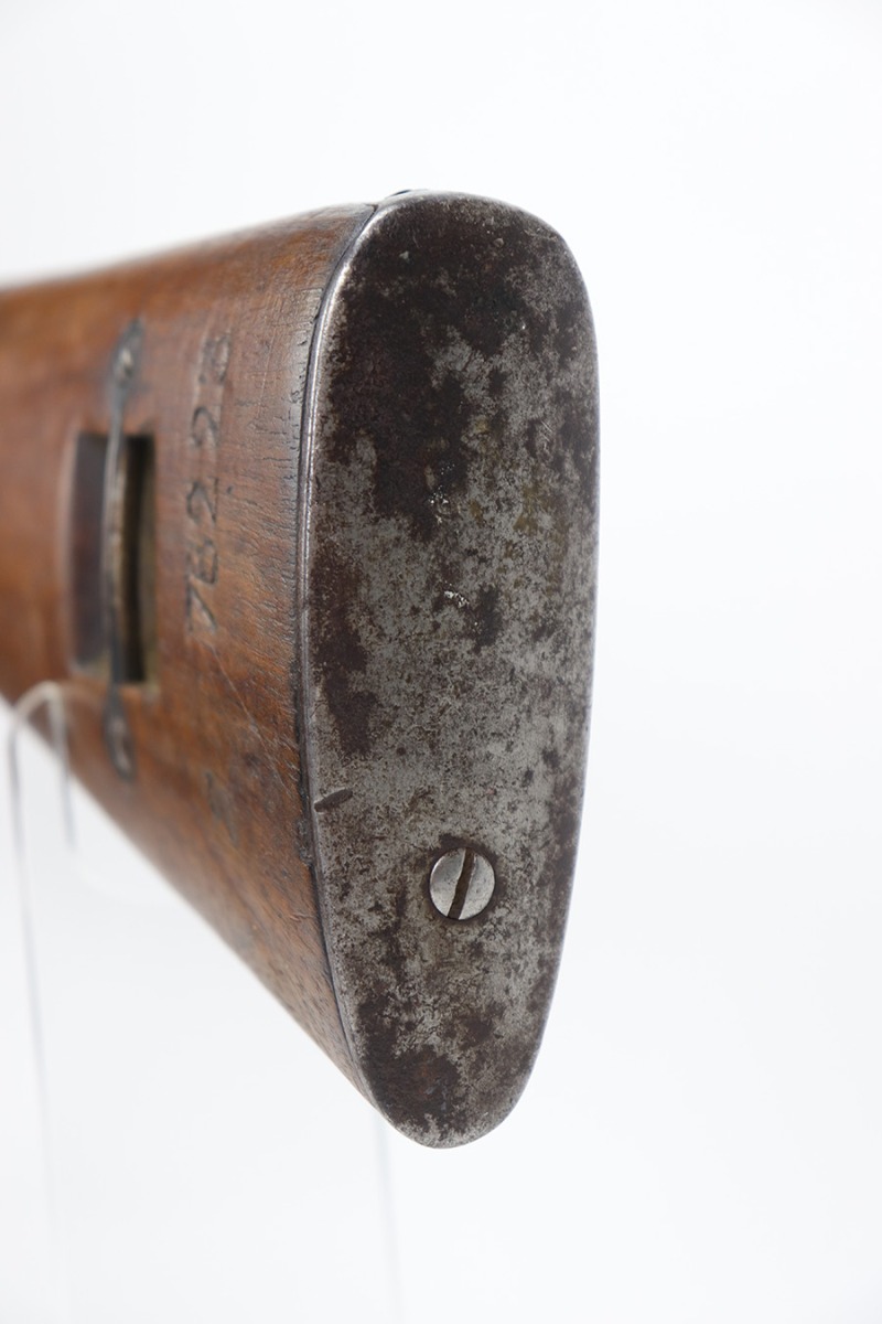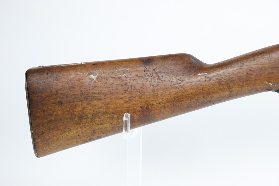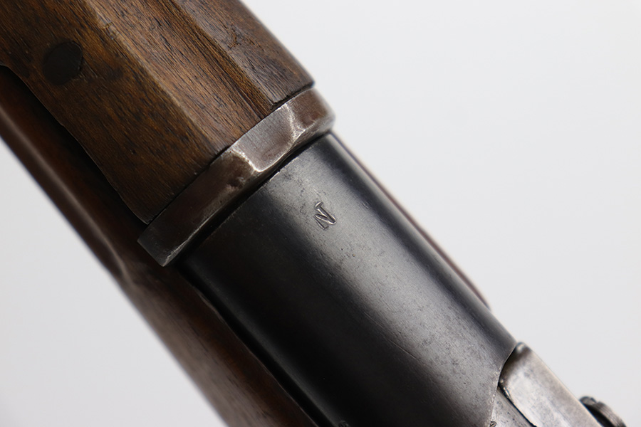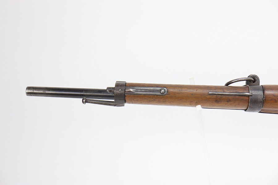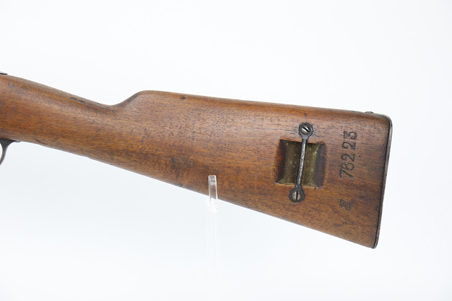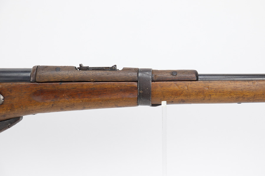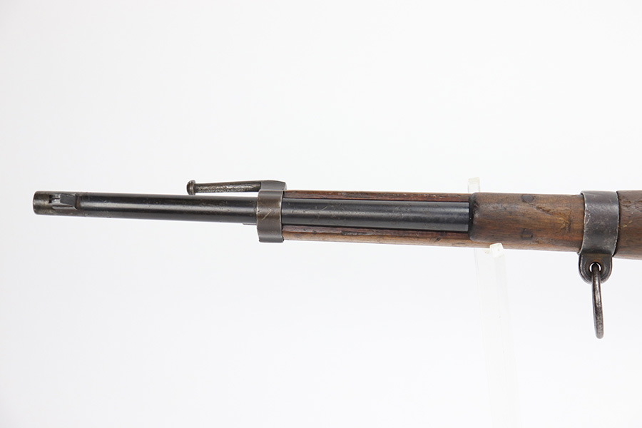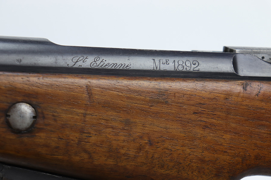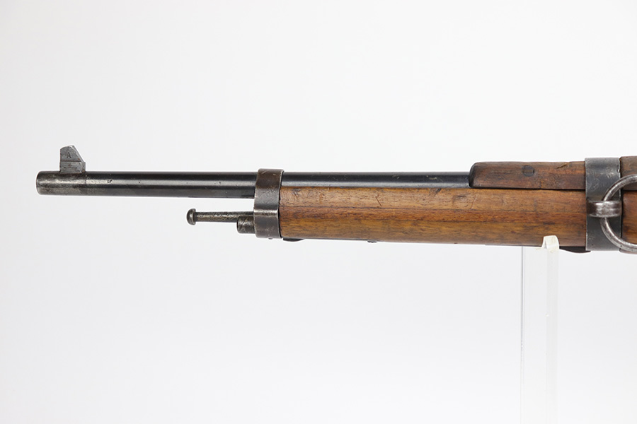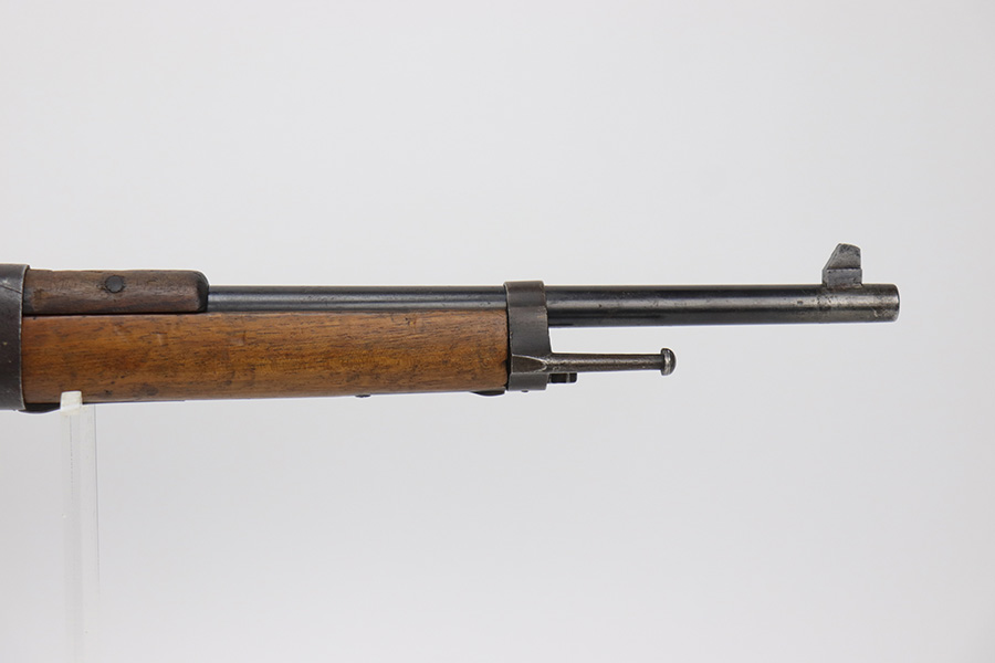 7/24/23 – This is a clean example of an early French Berthier Mle 1892 Artillery Musketoon, featuring a 17.5″ barrel, and was issued during The Great War. France would adopt this carbine as a compact rifle for auxiliary troops. Unlike the Mle 1890 Cavalry Carbine, these would have a bayonet lug and stacking rod attached to them. This rifle features the war time magazine extension to increase the capacity of the rifle from 3 rounds to 5 round en bloc clips. The receiver is marked with the maker, St Etienne, and Mle 1892. The barrel is marked with the serial number and “MAS 1893.” Both the barrel and receiver are “Balle N” marked, indicating a higher pressure spitzer cartridge. Rifle is mismatched and has retained about 80% of its bluing, with most of the wear concentrated at the muzzle. There is a thin surface scratch the top of the barrel, and minor pitting and areas of finish loss throughout the barrel. The buttplate has also lost roughly half its finish. The forestock shows a crescent shaped chip, and is in worse general condition than the rest of the stock, which for the most part shows no major damage and only minor handling marks. The bore is bright with good rifling, but is frosted throughout. Antique, so no licensing required.