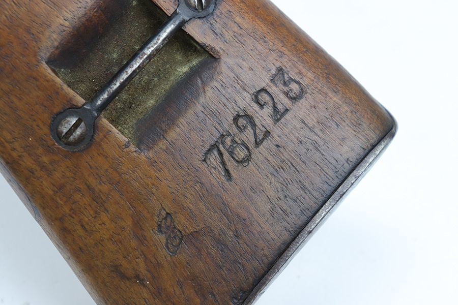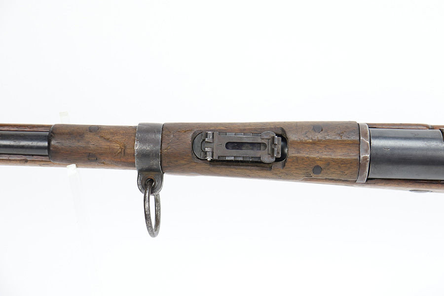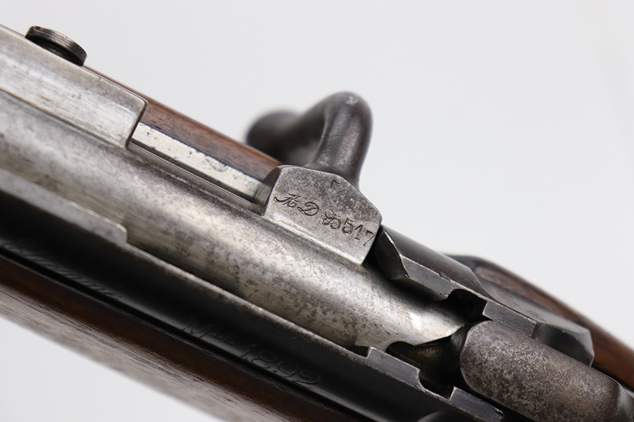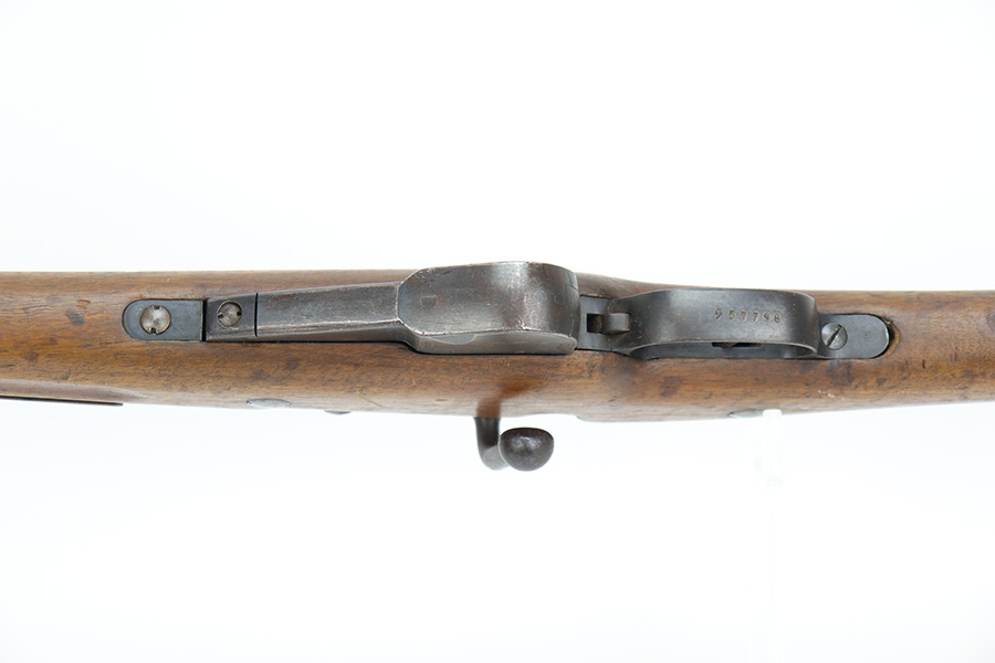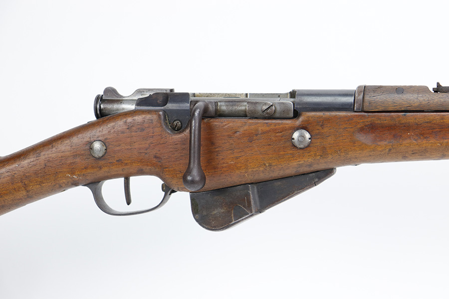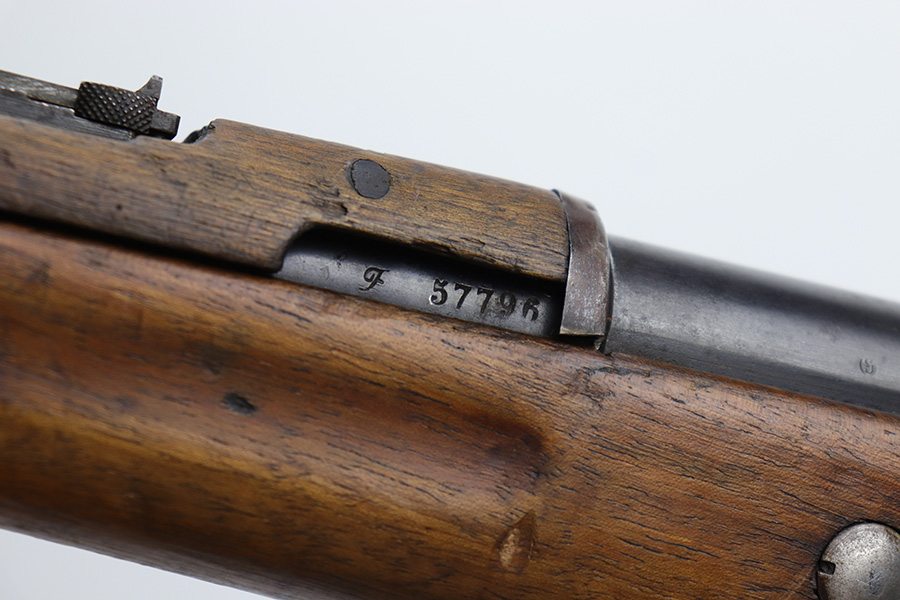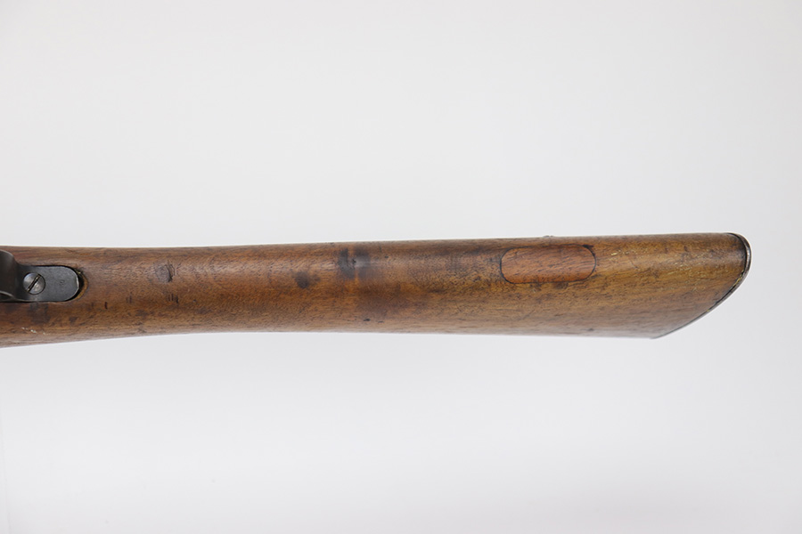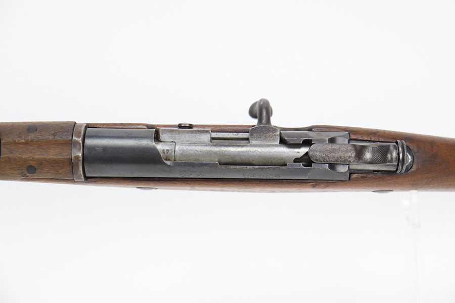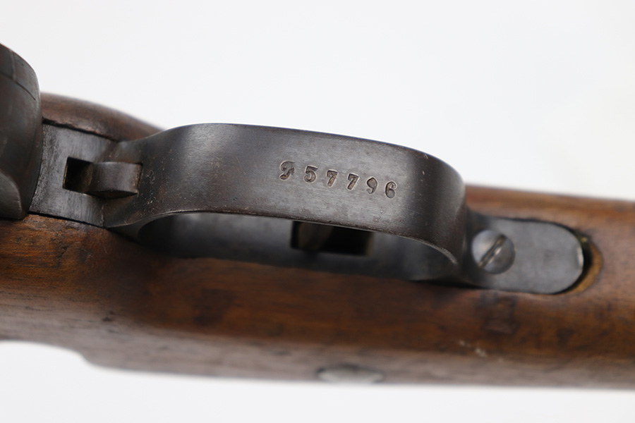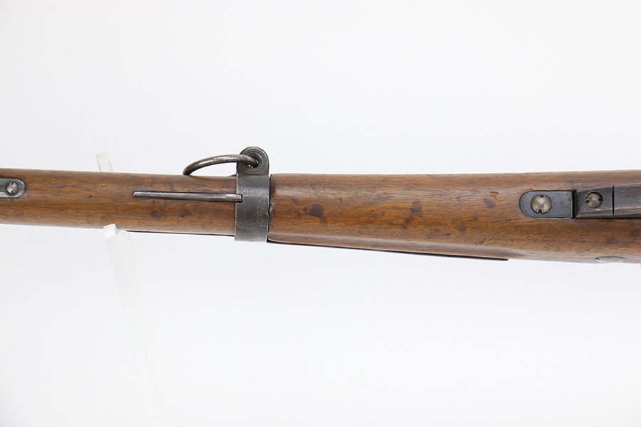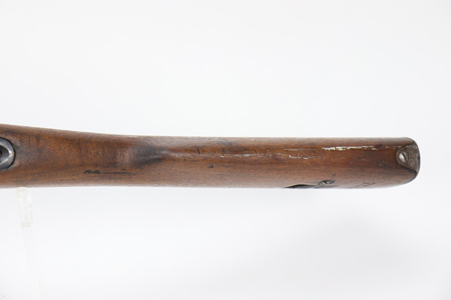 7/24/23 – This is a clean example of an early French Berthier Mle 1892 Artillery Musketoon, featuring a 17.5″ barrel, and was issued during The Great War. France would adopt this carbine as a compact rifle for auxiliary troops. Unlike the Mle 1890 Cavalry Carbine, these would have a bayonet lug and stacking rod attached to them. This rifle features the war time magazine extension to increase the capacity of the rifle from 3 rounds to 5 round en bloc clips. The receiver is marked with the maker, St Etienne, and Mle 1892. The barrel is marked with the serial number and “MAS 1893.” Both the barrel and receiver are “Balle N” marked, indicating a higher pressure spitzer cartridge. Rifle is mismatched and has retained about 80% of its bluing, with most of the wear concentrated at the muzzle. There is a thin surface scratch the top of the barrel, and minor pitting and areas of finish loss throughout the barrel. The buttplate has also lost roughly half its finish. The forestock shows a crescent shaped chip, and is in worse general condition than the rest of the stock, which for the most part shows no major damage and only minor handling marks. The bore is bright with good rifling, but is frosted throughout. Antique, so no licensing required.