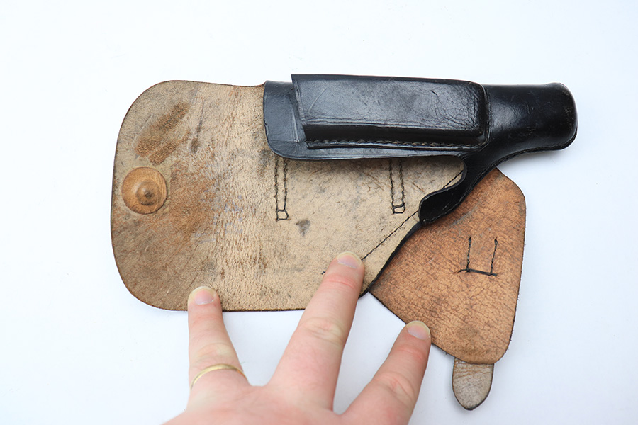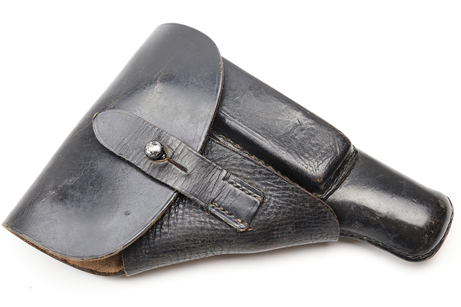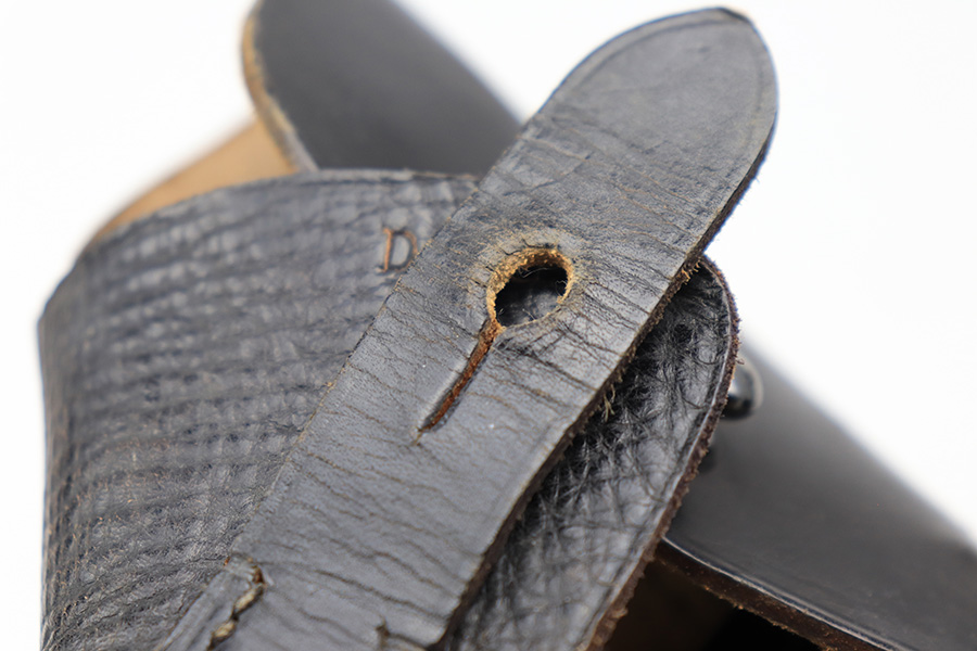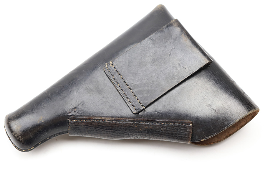 4/11/22 – This is an original black leather AKAH Walther PP holster from WW2. The holster has very nice leather with mild pliability and a fairly clean interior. The interior leather features a faint remnant of the original Walther PP ink stamp. There’s an AKAH maker stamp under the closure strap. The stitching is all tight, original, and intact.