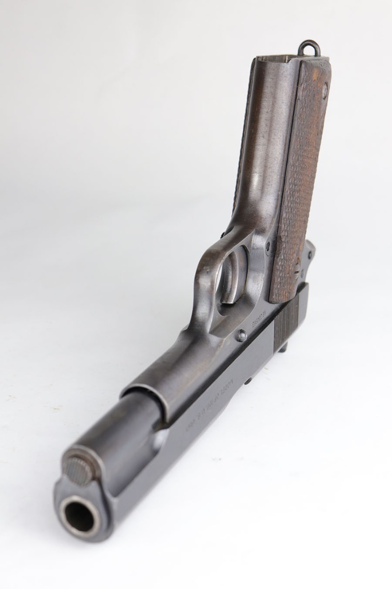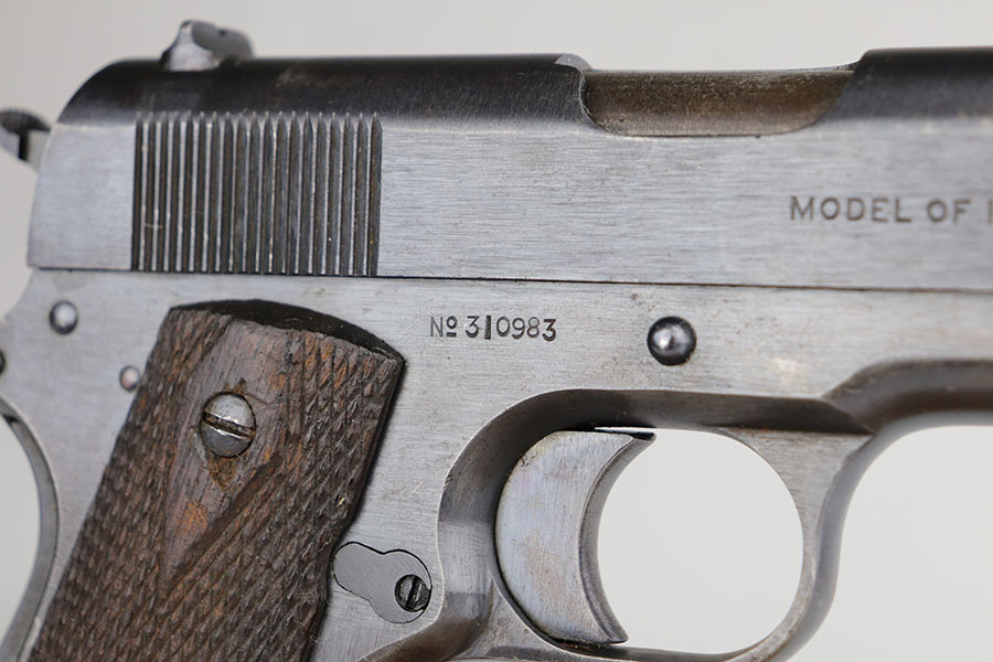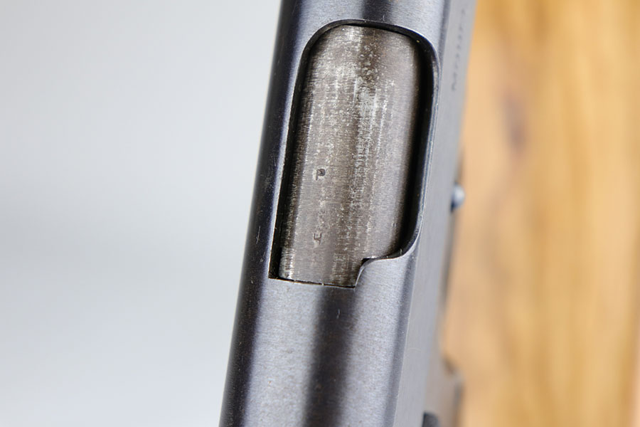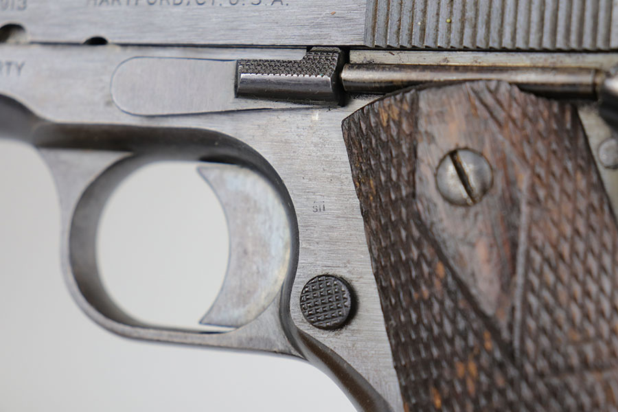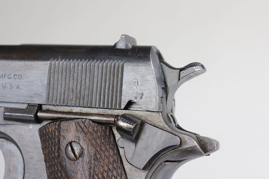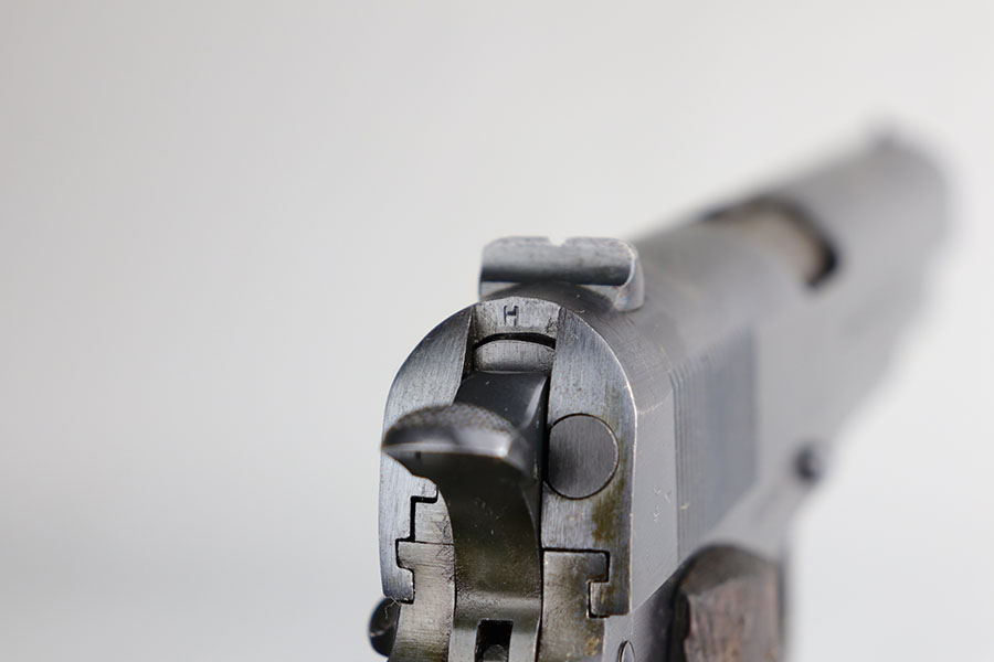 4/24/20 – This is a very nice and all original Black Army Colt 1911 from 1918. The profile view is excellent with minimal finish loss, just some browning under the finish. Nearly all of the finish loss is on the straps, especially the mainspring housing. P H marked barrel with minty bore. Grips show some handling wear but no major cracks or chips. Two-tone magazine.