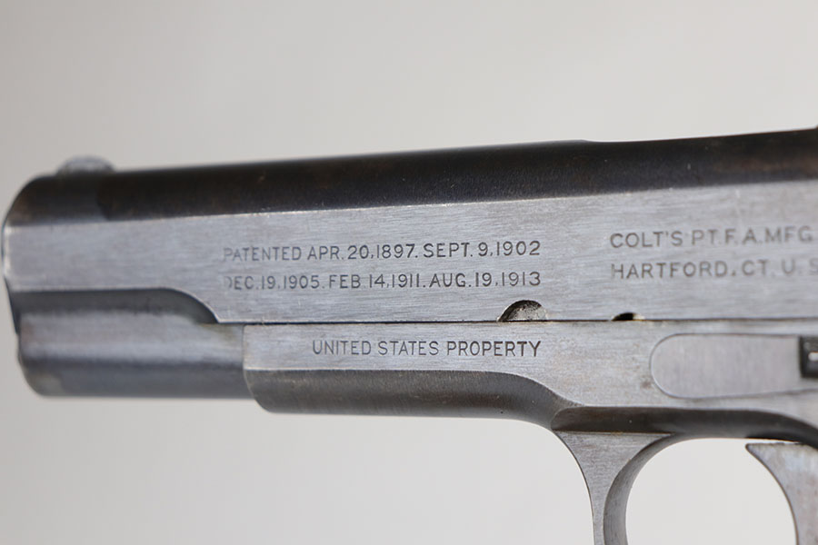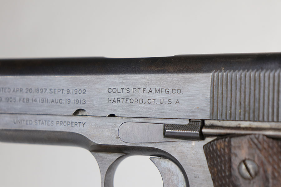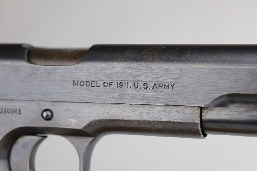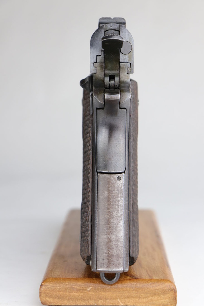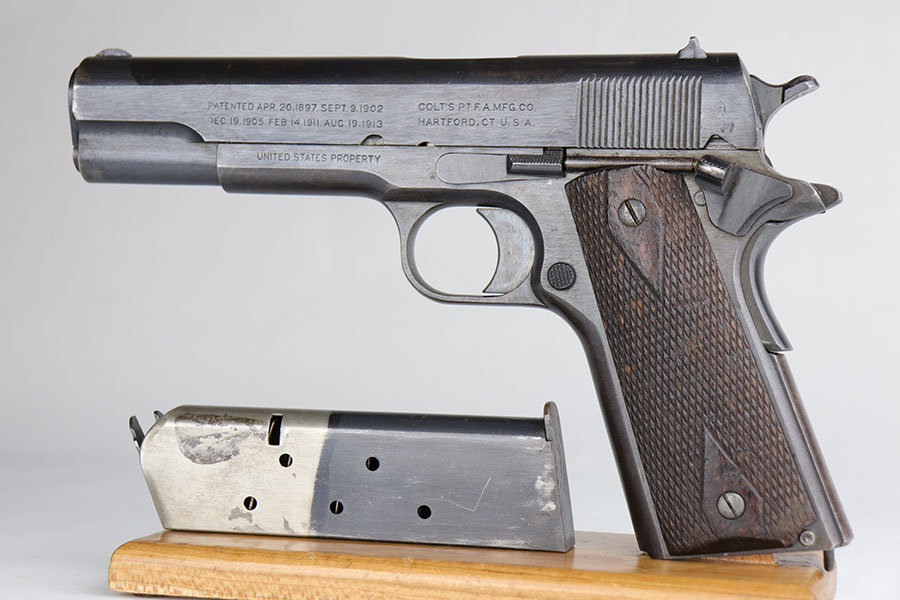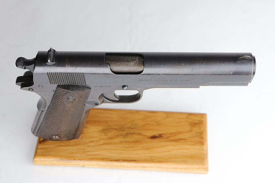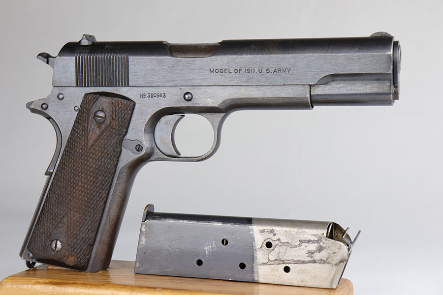 4/24/20 – This is a very nice and all original Black Army Colt 1911 from 1918. The profile view is excellent with minimal finish loss, just some browning under the finish. Nearly all of the finish loss is on the straps, especially the mainspring housing. P H marked barrel with minty bore. Grips show some handling wear but no major cracks or chips. Two-tone magazine.