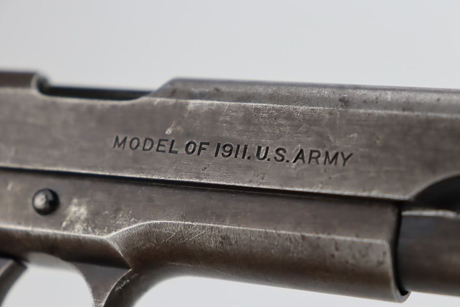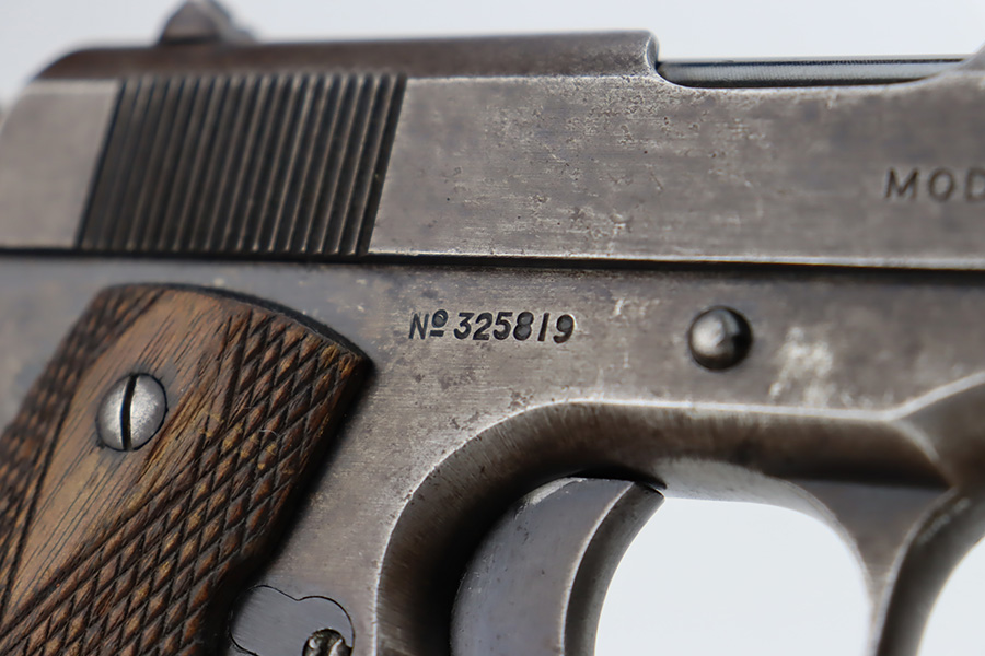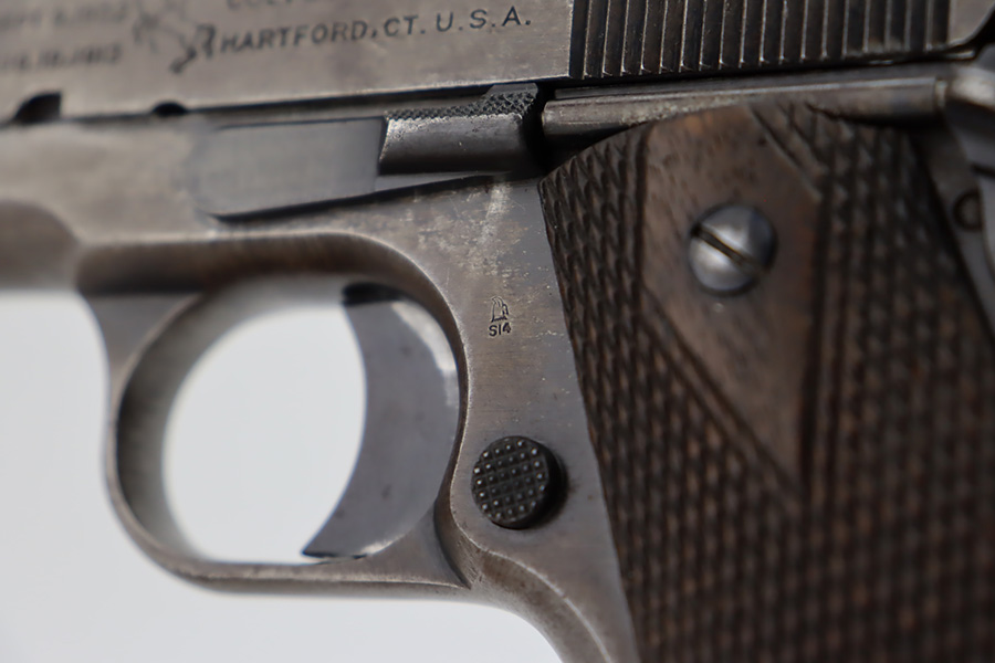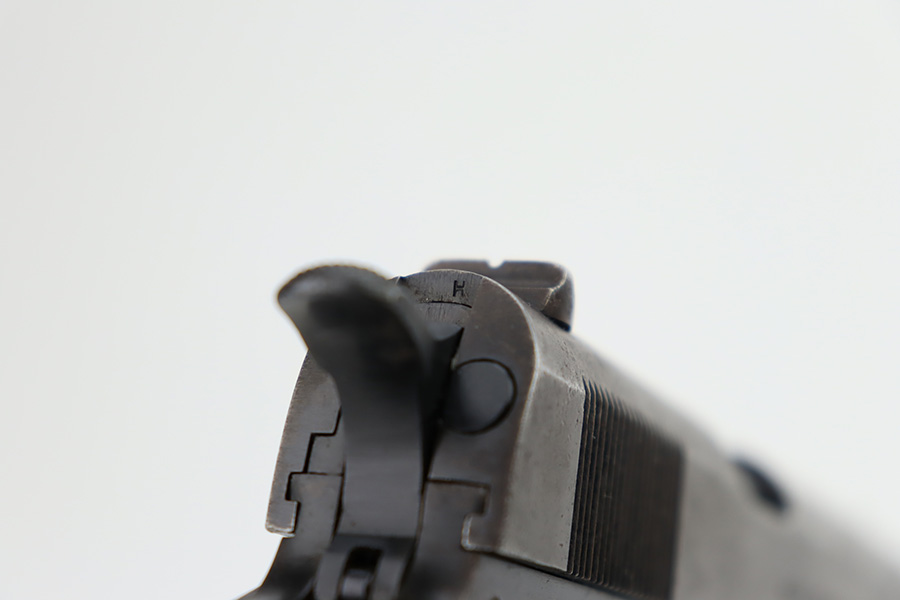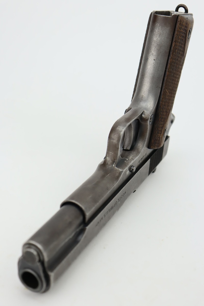 11/2/23 – This is an original Colt 1911 from 1918 with Black Army finish. To increase production, Colt modified the finishing processes to speed things along and it resulted in a finish that was almost black. The quality was lower and this finish would wear down and “flake” much quicker, as you see on this pistol. Many of the small parts had been outsourced or finished previously, so it’s common to see the finish on small parts of these pistols be in much better condition, which is what you see here. The finish is almost entirely worn with obvious brown patina throughout. Fitted with fairly worn wood grips and comes with one period-correct two-tone magazine. Mint bore. The barrel has a vertical “H” marking on the hood, but we do not believe it is original.
