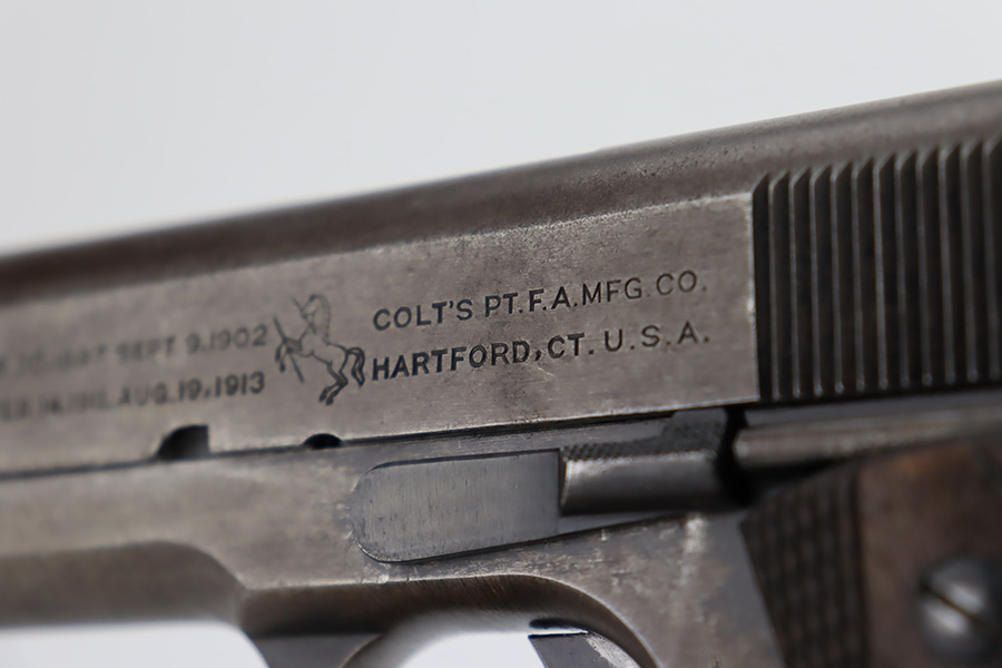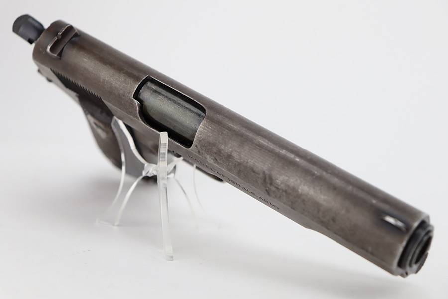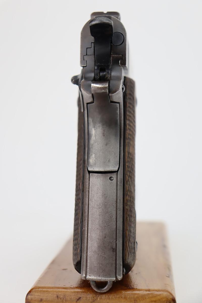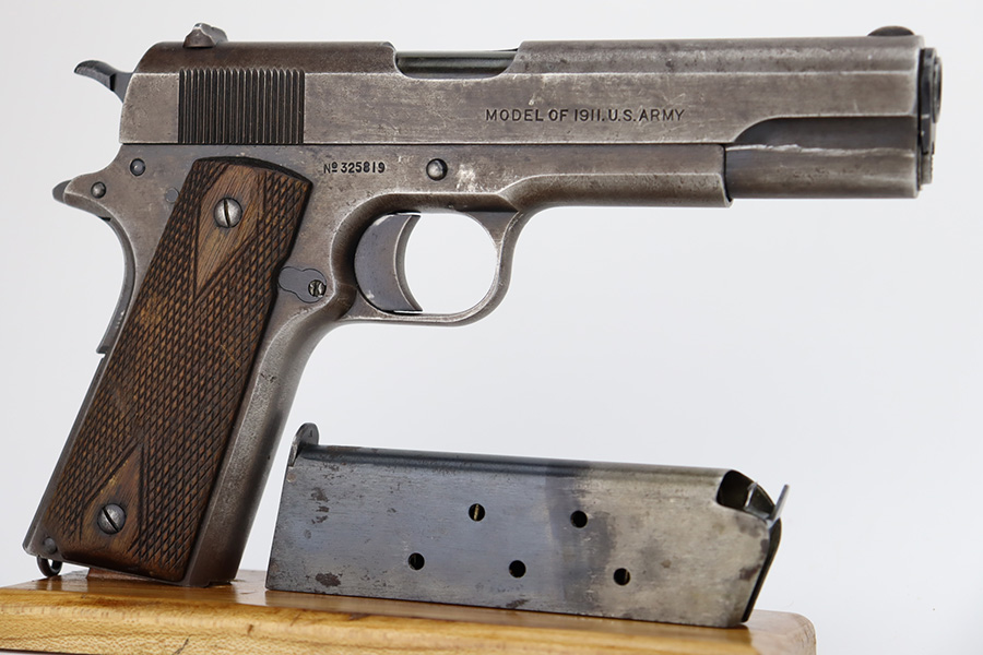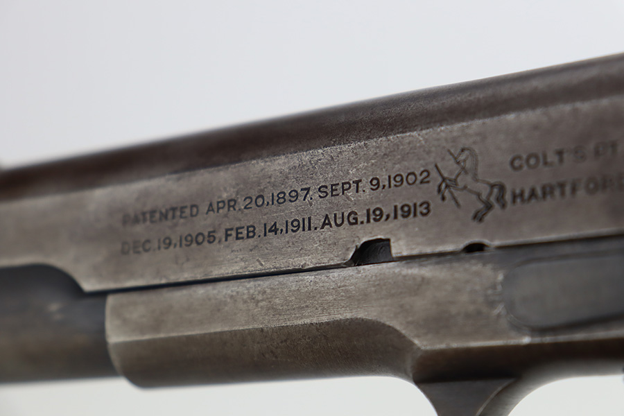 11/2/23 – This is an original Colt 1911 from 1918 with Black Army finish. To increase production, Colt modified the finishing processes to speed things along and it resulted in a finish that was almost black. The quality was lower and this finish would wear down and “flake” much quicker, as you see on this pistol. Many of the small parts had been outsourced or finished previously, so it’s common to see the finish on small parts of these pistols be in much better condition, which is what you see here. The finish is almost entirely worn with obvious brown patina throughout. Fitted with fairly worn wood grips and comes with one period-correct two-tone magazine. Mint bore. The barrel has a vertical “H” marking on the hood, but we do not believe it is original.